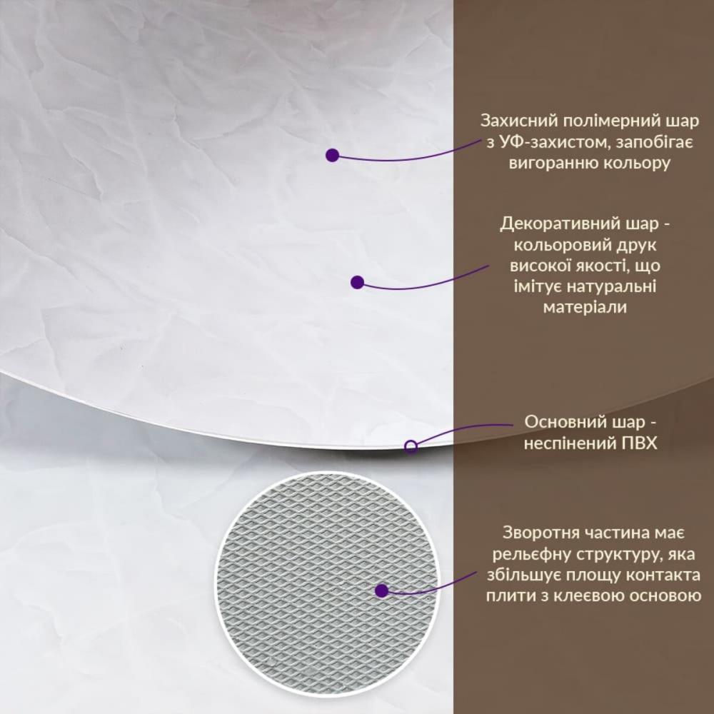 Декоративная ПВХ плита Sticker wall 1,22м х 2,44м х 3мм SW-00002596 ПВХ плиты производятся на современном оборудовании с использованием высококачественных, устойчивых к износу и абсолютно безопасных для здоровья красок. Их привлекательный вид, разнообразие дизайнов и удобство в уходе делают эти плиты идеальным выбором для создания стильной, долговечной и функциональной отделки. С помощью ПВХ плит вы легко воплотите любые дизайнерские замыслы как в жилых помещениях, так и в офисах, магазинах, кафе или других коммерческих просторах. Размер: 2440x1220 мм. Толщина: 3 мм. Вес 1 листа — 19 кг. Плиты очень просты в монтаже, удобны в использовании и имеют длительный срок эксплуатации. Для установки плит вам понадобятся: силиконовый или акриловый клей, лобзик (или болгарка), строительный уровень, карандаш и линейка. Преимущества ПВХ плит: • Легкий вес и гибкость – удобны в транспортировке, доставке и монтаже даже в труднодоступных местах. • Простой монтаж – не требуют специального инструмента или подготовки, достаточно грунтовки и клея. • Минимум отходов – чистая нарезка лобзиком или болгаркой, без пыли и мусора. • Цельное изображение – бесшовное покрытие с имитацией натуральных материалов (мрамор, камень). • Влагостойкость – подходят для ванных комнат и влажных помещений. • Длительный срок службы – до 20 лет эксплуатации без потери качества. • Экологичность – гипоаллергенные, безопасные, не выделяющие токсических веществ. • Пожарная безопасность – материал не поддерживает горение. • Теплоизоляция – сохраняет комфортный микроклимат в помещении. • Широкая область применения – жилые, коммерческие, офисные пространства. • Легкий уход – достаточно протереть влажной тряпкой. • Компактное хранение – не занимают много места до монтажа. Инструкция по монтажу Шаг 1. Подготовка стены Монтаж возможен только на ровную поверхность. Предварительно обязательно прогрунтуйте стену. Шаг 2. Выставление уровня С помощью строительного уровня определите горизонталь вдоль всей стены – это гарантия ровного монтажа. Шаг 3. Нанесение клея Переверните плиту тыльной стороной. Нанесите клей по всей площади равномерным слоем толщиной 1,5–2 мм. Шаг 4. Монтаж плиты Осторожно приложите плиту к стене по выставленному уровню (лучше вдвоем), плотно прижмите и держите 2 минуты. Далее переходите к следующей.Характеристики
