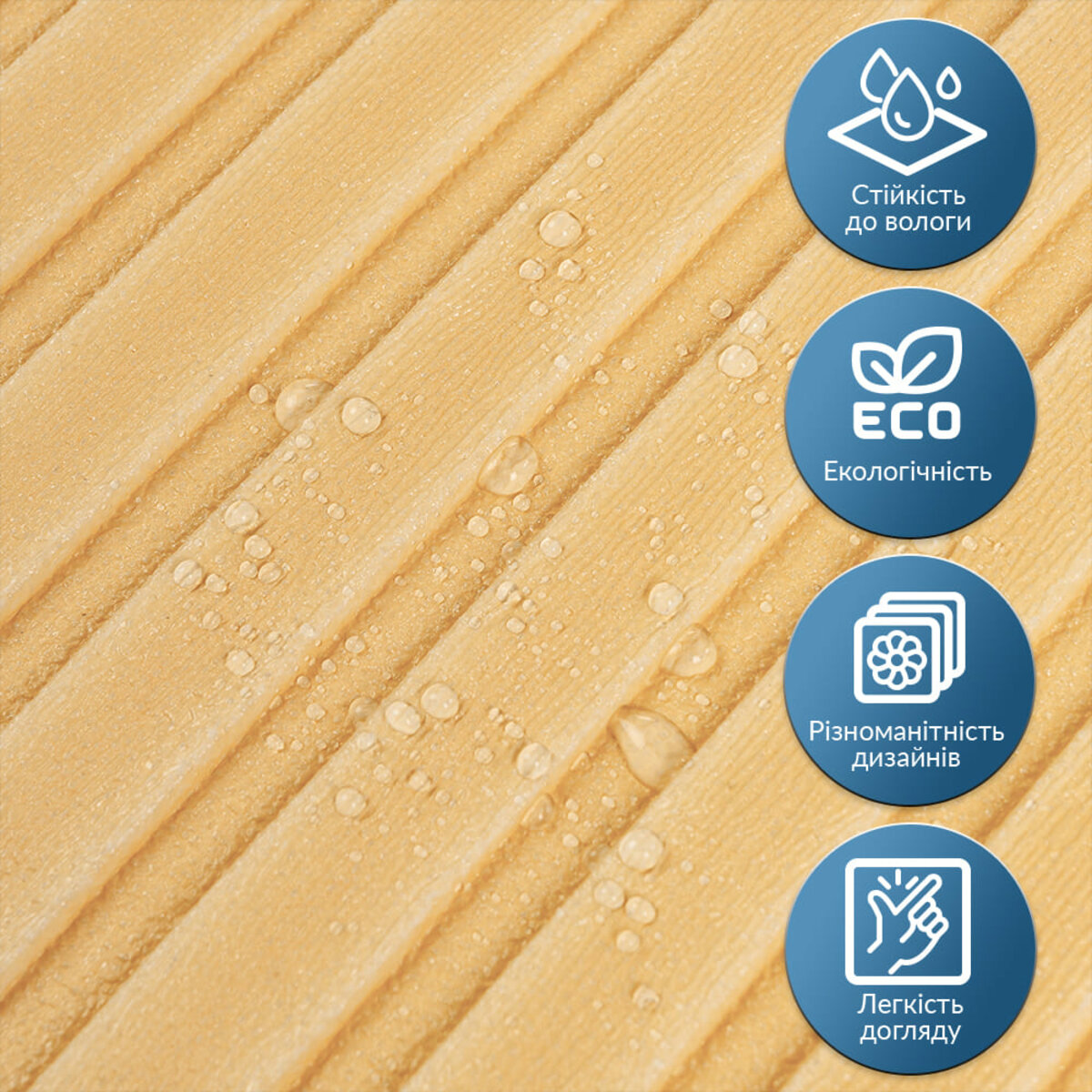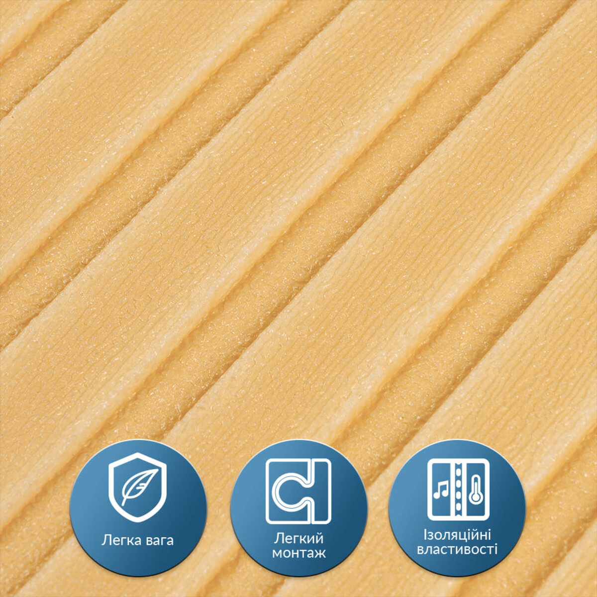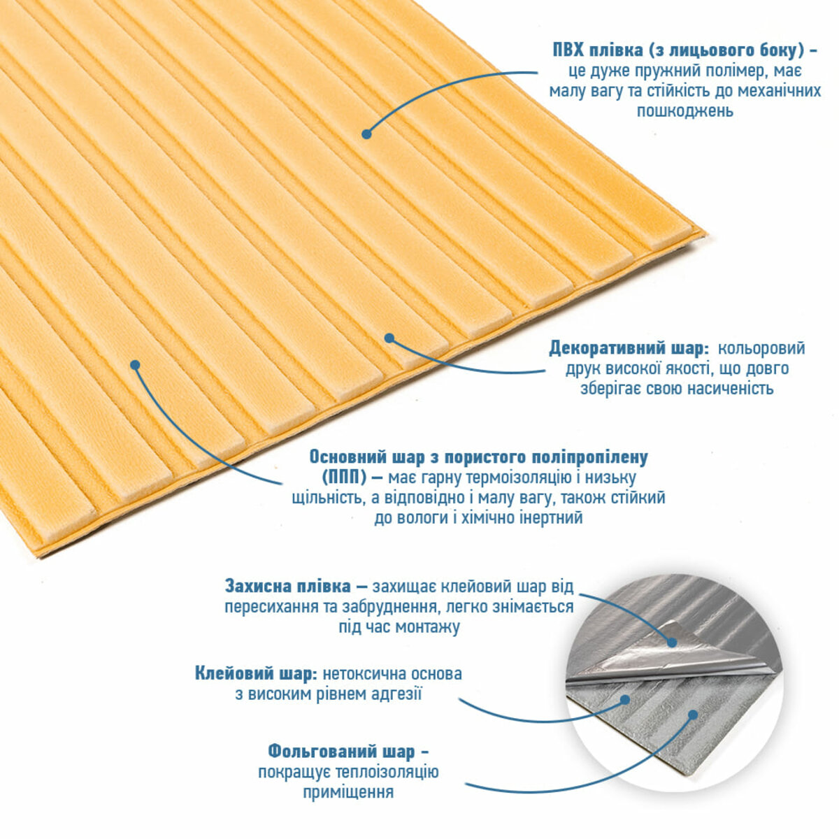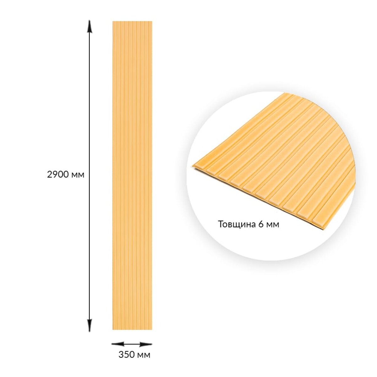 Panel-rail in a roll Sticker wall yellow-sand 2900*350*6mm (D) SW-00002071 Self-adhesive panel-rail in a roll is a modern decorative wall covering made of lightweight and durable porous polypropylene (PPP). A distinctive feature of the panels is a relief texture reminiscent of wood, available in a variety of colors. Due to the presence of an adhesive layer, the installation of such panels does not require additional materials or tools. The self-adhesive panel-rail includes several layers, each of which performs specific functions: 1. Front side (PVC film) This is a polymer material based on long molecular chains of vinyl chloride with the addition of chlorine atoms. The chemical structure provides high resistance to various substances. Due to the amorphous crystal lattice, PVC is lightweight and highly elastic. 2. Decorative layer It is a high-quality color print that retains the brightness and saturation of the color for a long time. 3. Base layer (porous polypropylene) Made of thermoplastic polymer with a molecular structure that includes repeating units of propylene. Its cellular structure provides excellent thermal insulation properties, low density and light weight. Polypropylene is moisture resistant and chemically neutral, which increases its durability. 4. Adhesive layer This is a safe and non-toxic coating with a high degree of adhesion, ensuring reliable fastening of the panel. 5. Protective paper Serves to prevent contamination and drying of the adhesive layer. Easily removed during installation, which simplifies installation. Key benefits: - Ideal for interior decoration: suitable for interior decoration and thermal insulation of walls in residential and commercial buildings. - Lightweight material: light weight simplifies transportation, making it more cost-effective, and also facilitates the installation process. - Excellent insulation properties: the porous structure provides the panels with good heat and sound insulation. - Easy to install: the built-in adhesive layer allows you to install the panels without using additional materials. - Flexible and reliable: the panels easily adapt even to uneven surfaces, while maintaining strength and durability. - Moisture and chemical resistance: porous polypropylene is protected by a PVC film, which makes the panels resistant to moisture and allows them to be cleaned with ordinary household products (except for highly abrasive brushes). - Environmentally friendly: polypropylene is odorless, safe for health and the environment. The material can be recycled, which contributes to the sustainable use of resources. How to calculate the required amount of material: 1. Measure the surface parameters. Take measurements of the length and width of each surface you plan to wallpaper, in meters. 2. Calculate the area. Multiply the length by the width of each surface and add the resulting values to determine the total area. For example: the length of the wall is 3.7 m, the width is 2.7 m. Area: 3.7 x 2.7 = 9.99 sq.m. 3. Calculate the number of panels. Divide the total area by the area of one panel. If the panel area is 1.015 sq.m (350 x 2750 mm), then the calculation will be as follows: 9.99 / 1.015 = 9.84. Always round the result up: in this case, it is 10 panels. 4. Add a reserve. To account for possible waste when fitting the material, it is recommended to add 1-2 additional panels. This approach will provide enough material to complete the job well. Instructions for installing panels: 1. Preparing the surface. Before starting installation, make sure that the work surface is clean, dry and level. Remove dust, dirt, oil residue or other contaminants. If the surface is uneven, it should be leveled. For optimal adhesion, the surface and panels should be at room temperature. 2. Removing the protective layer. Peel off the protective film from the back of the panel to expose the adhesive layer. 3. Installing the panels. Start installing from the corner. Carefully press the panel onto the prepared surface, making sure that it lies flat. Avoid the formation of bubbles and folds during installation. 4. Fitting the panels. If necessary, trim the panels to size, especially for corners and edges. Use a knife or scissors for this. 5. Fixing. Carefully press the panels onto the surface to ensure reliable adhesion to the base.Characteristics