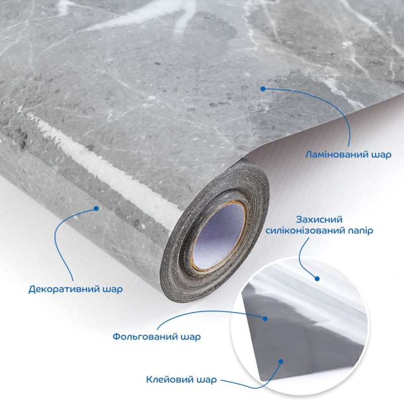 Self-adhesive film Sticker wall 60cm*3m (D) SW-00002403 Laminated self-adhesive film is a flexible and durable material that is highly tear-resistant. One side of the film is covered with a special adhesive layer, which makes it easy to use. This universal material is widely used for cladding, protection, decoration and restoration of smooth surfaces. Its advantages include ease of installation, durability and the ability to use in various conditions. Laminated film comes in different shades, textures and designs, which allows you to choose an option for any interior. It also effectively protects surfaces from mechanical damage, moisture and ultraviolet rays, extending the life of furniture or walls. Dimensions: 600x3000 mm. Coverage area: 600x3000 - 1,8 sq. m. Texture: no relief, glossy surface. The film consists of several layers, each of which performs specific tasks: 1. Laminated layer. The top layer of the film serves to protect against scratches, stains and moisture. It gives the surface a glossy shine and simplifies cleaning from dirt. This layer is created using low-temperature lamination, which uses a film with an adhesive base activated at a temperature of 30-50 degrees. The material passes through heating rollers, providing strong adhesion to the base layer without deformation. This method is ideal for thin and heat-sensitive materials with a thickness of 0.05 mm, guaranteeing uniform protection and durability. 2. Decorative layer. Under the protective coating there is a layer with a decorative pattern or texture imitating wood, marble, tiles or other surfaces. It is responsible for the aesthetic component and allows the film to be used in various interior solutions. 3. Foil layer. This layer increases the strength of the film, ensuring its resistance to tears, moisture and temperature changes. Thanks to the foil, the surface acquires additional brightness and a stylish reflective effect. 4. Adhesive layer. A special non-toxic adhesive base ensures reliable adhesion of the film to the surface, creating a strong and durable connection. 5. Protective siliconized paper. This layer covers the adhesive base until installation, preventing it from getting dirty, drying out or accidentally sticking. It is easily removed before installation, and the markings on the paper facilitate the process of cutting the material. Application: The film is ideal for interior finishing works, including decorating and cladding various surfaces in residential premises: kitchens, living rooms, children's rooms, bedrooms and hallways. It is also widely used in commercial spaces such as offices, reception areas, shops, beauty salons and fitness centers. The material is perfect for updating the appearance of furniture, doors and household appliances, giving them a stylish and modern look. The film is wear-resistant and easy to clean, which makes it an excellent choice for high-traffic areas or cleanliness requirements. Using this film, you can quickly transform the interior without large expenses and complex repairs. Properties and advantages of laminated self-adhesive film: 1. High strength Thanks to the foil base, the material is exceptionally tear-resistant. The film is almost impossible to damage without a preliminary cut, which ensures durability and simplifies the installation process. 2. Wear resistance The laminated coating reliably protects the film from scratches, dirt, dust and stains, maintaining its attractive appearance even with intensive use. The surface is easy to clean, which extends the service life of the product and maintains its aesthetic qualities. 3. Moisture resistance The film is resistant to moisture due to the laminated layer, which makes it an excellent choice for rooms with high humidity, such as bathrooms and kitchens. 4. Reliable adhesion The adhesive layer provides strong adhesion to various materials - from metal and glass to plastic and laminated wood. This makes the film universal for decorative design, surface protection and their renovation. 5. Resistance to external influences The material is protected from fading under the influence of ultraviolet rays, due to which it retains color saturation for a long time, even with prolonged use in conditions of active exploitation. 6. Flexibility and lightness The thin structure of the film ensures ease of application to surfaces of complex shapes, including curved elements, guaranteeing precise fit and a neat result. 7. Variety of designs A wide selection of textures, colors and patterns allows you to find the optimal solution for any style and interior, emphasizing its individuality and harmony. For high-quality installation of laminated self-adhesive film, the surface to which it will be applied must meet the following requirements: - be clean (without dust, dirt, grease and other contaminants); - have a smooth surface without protruding particles, cracks and irregularities (if necessary, use putty or putty); - be dry (moisture can negatively affect the adhesive base and worsen its adhesion); - maintain a temperature of 18 to 25 degrees (for optimal interaction of the adhesive layer with the surface); - be cleaned of fungus and mold; - have no remnants of old wallpaper or other finishing materials. ! The film on an adhesive base is not intended for use on rough, damaged surfaces and brick walls. Installation: 1. Before installation, make sure that the surface to which the film will be applied meets the specified requirements. There should be no drafts in the room during installation. 2. Before starting work, each roll should be checked for color (shade) compliance. Without removing the protective film from the adhesive layer, apply a new roll to the one already applied and, if the shades differ, turn the roll over. 3. Remove the protective film from the back of the roll to expose the adhesive layer. 4. Start installation from one corner, gently pressing the film to the surface so that it lies flat and without wrinkles, avoid