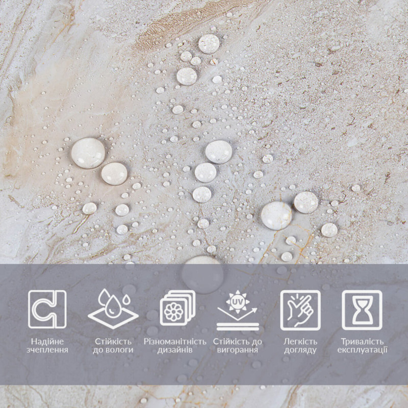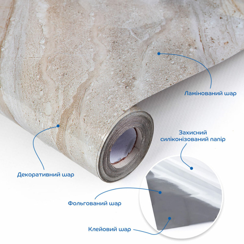 Self-adhesive film Sticker wall 60cm*3m (D) SW-00002408 Laminated self-adhesive film is a flexible and durable material that is highly tear-resistant. One side of the film is covered with a special adhesive layer, which makes it easy to use. This universal material is widely used for cladding, protection, decoration and restoration of smooth surfaces. Its advantages include ease of installation, durability and the ability to use in various conditions. Laminated film comes in different shades, textures and designs, which allows you to choose an option for any interior. It also effectively protects surfaces from mechanical damage, moisture and ultraviolet rays, extending the life of furniture or walls. Dimensions: 600x3000 mm. Coverage area: 600x3000 - 1,8 sq. m. Texture: no relief, glossy surface. The film consists of several layers, each of which performs specific tasks: 1. Laminated layer. The top layer of the film serves to protect against scratches, stains and moisture. It gives the surface a glossy shine and simplifies cleaning from dirt. This layer is created using low-temperature lamination, which uses a film with an adhesive base activated at a temperature of 30-50 degrees. The material passes through heating rollers, providing strong adhesion to the base layer without deformation. This method is ideal for thin and heat-sensitive materials with a thickness of 0.05 mm, guaranteeing uniform protection and durability. 2. Decorative layer. Under the protective coating there is a layer with a decorative pattern or texture imitating wood, marble, tiles or other surfaces. It is responsible for the aesthetic component and allows the film to be used in various interior solutions. 3. Foil layer. This layer increases the strength of the film, ensuring its resistance to tears, moisture and temperature changes. Thanks to the foil, the surface acquires additional brightness and a stylish reflective effect. 4. Adhesive layer. A special non-toxic adhesive base ensures reliable adhesion of the film to the surface, creating a strong and durable connection. 5. Protective siliconized paper. This layer covers the adhesive base until installation, preventing it from getting dirty, drying out or accidentally sticking. It is easily removed before installation, and the markings on the paper facilitate the process of cutting the material. Application: The film is ideal for interior finishing works, including decorating and cladding various surfaces in residential premises: kitchens, living rooms, children's rooms, bedrooms and hallways. It is also widely used in commercial spaces such as offices, reception areas, shops, beauty salons and fitness centers. The material is perfect for updating the appearance of furniture, doors and household appliances, giving them a stylish and modern look. The film is wear-resistant and easy to clean, which makes it an excellent choice for high-traffic areas or cleanliness requirements. Using this film, you can quickly transform the interior without large expenses and complex repairs. Properties and advantages of laminated self-adhesive film: 1. High strength Thanks to the foil base, the material is exceptionally tear-resistant. The film is almost impossible to damage without a preliminary cut, which ensures durability and simplifies the installation process. 2. Wear resistance The laminated coating reliably protects the film from scratches, dirt, dust and stains, maintaining its attractive appearance even with intensive use. The surface is easy to clean, which extends the service life of the product and maintains its aesthetic qualities. 3. Moisture resistance The film is resistant to moisture due to the laminated layer, which makes it an excellent choice for rooms with high humidity, such as bathrooms and kitchens. 4. Reliable adhesion The adhesive layer provides strong adhesion to various materials - from metal and glass to plastic and laminated wood. This makes the film universal for decorative design, surface protection and their renovation. 5. Resistance to external influences The material is protected from fading under the influence of ultraviolet rays, due to which it retains color saturation for a long time, even with prolonged use in conditions of active exploitation. 6. Flexibility and lightness The thin structure of the film ensures ease of application to surfaces of complex shapes, including curved elements, guaranteeing precise fit and a neat result. 7. Variety of designs A wide selection of textures, colors and patterns allows you to find the optimal solution for any style and interior, emphasizing its individuality and harmony. For high-quality installation of laminated self-adhesive film, the surface to which it will be applied must meet the following requirements: - be clean (without dust, dirt, grease and other contaminants); - have a smooth surface without protruding particles, cracks and irregularities (if necessary, use putty or putty); - be dry (moisture can negatively affect the adhesive base and worsen its adhesion); - maintain a temperature of 18 to 25 degrees (for optimal interaction of the adhesive layer with the surface); - be cleaned of fungus and mold; - have no remnants of old wallpaper or other finishing materials. ! The film on an adhesive base is not intended for use on rough, damaged surfaces and brick walls. Installation: 1. Before installation, make sure that the surface to which the film will be applied meets the specified requirements. There should be no drafts in the room during installation. 2. Before starting work, each roll should be checked for color (shade) compliance. Without removing the protective film from the adhesive layer, apply a new roll to the one already applied and, if the shades differ, turn the roll over. 3. Remove the protective film from the back of the roll to expose the adhesive layer. 4. Start installation from one corner, gently pressing the film to the surface so that it lies flat and without wrinkles, avoid