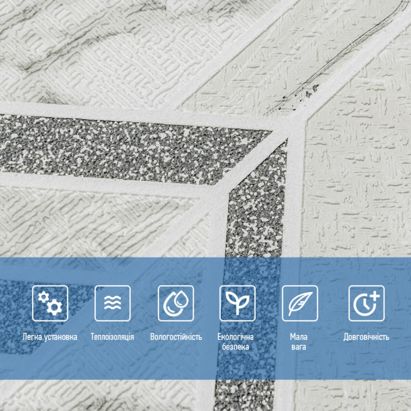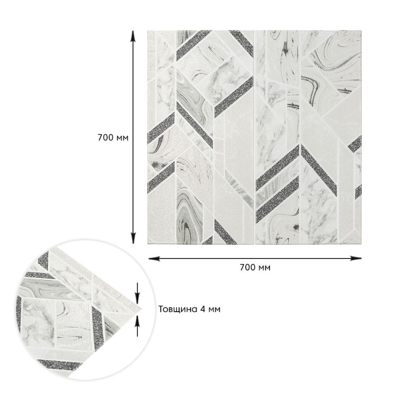 Wall panel 3D Sticker wall 700x700x4mm abstract gray (D) SW-00001990 Decorate the walls of your home with self-adhesive 3D panels - a simple and affordable solution for creating a stylish and modern interior. Lightweight and durable panels made of porous polypropylene (PPP) with a relief pattern will transform any room. The self-adhesive base ensures quick and easy installation without the use of additional materials. The multilayer structure of the panels guarantees their durability and practicality: - PVC film: resistant to chemicals, flexible and lightweight. - Decorative layer: high-quality printing while maintaining color saturation. - PPP core layer: provides thermal insulation, low weight, moisture resistance and chemical inertness. - Adhesive layer: non-toxic, with high adhesion. - Protective paper: easily removed before installation. Advantages of 3D panels: 1. Easy to install: no glue, nails or tools. 2. Stylish design: realistic imitation brickwork in rich colors. 3. Practicality: moisture-proof, easy to clean, fade-resistant. 4. Affordability: good value for money. Calculation of the required number of panels: 1. Measure the length and width of the surface to be pasted. 2. Multiply the length by the width of each surface in meters and add up the results to get the area. For example, after measurements you received: - Wall length 3.7 m. - Wall width 2.7 m. 3.7 * 2.7 = 9.99 sq.m 3. The resulting area must be divided by the area of one panel (700*700= 0.49 sq.m) and rounded up: 9.99/0.49=20.38 rounded to 21. During the installation process, waste associated with cutting panels may arise, so it is recommended to add 1-2 spare pieces to the calculation. Installation of panels: step-by-step instructions Preparation 1. Clean and level the surface: Make sure the surface on which you will attach the panels is clean, dry and level. Remove dust, dirt, grease and, if necessary, level the surface. To ensure optimal adhesion, panels and surface should be at room temperature. 2. Peel off the protective film: Peel off the protective paper from the back of the self-adhesive panel to expose the adhesive surface. Installation 3. Start at a Corner: Start installation at one corner and gently press the panel into the surface. Make sure the panel is installed smoothly and without air bubbles or wrinkles. 4. Fitting panels: Use a knife or scissors to trim panels to size, especially in corners and along surface edges. 5. Press the panels: Press the panels firmly onto the surface to ensure a secure adhesion. Adviсe - For best results, use a level to ensure the panels are level. - If you are not confident in your abilities, seek help from a professional.Characteristics