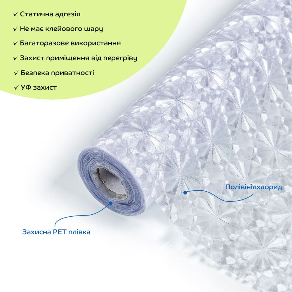 Пленка оконная на самоклейке Sticker wall 600*10000 (D) SW-00002157 ПВХ-пленка для окон – это декоративный материал, предназначенный для оформления стеклянных поверхностей. Она создает эффект уединения, защищает от вредного ультрафиолетового излучения и добавляет эстетики вашему интерьеру. Пленка легко наносится на стекло, делая его непрозрачным и ограничивая видимость с обеих сторон. Особенности: - Материал: поливинилхлорид (PVC) + РЭТ пленка. - Размер: 600х10000мм. - Площадь покрытия: 600х10000мм – 6 кв.м. - Поверхность: гладкая (позволяет свету плавно проникать через неё, создавая мягкое, рассеянное освещение). Фактура: призматическая (преломляет свет, создавая красивые отблески и узоры, напоминающие грани призм или стекла). Оконная ПВХ-пленка состоит из нескольких слоев: 1. Основным компонентом пленки является поливинилхлорид (ПВХ) — термопластичный полимер, известный своей высокой прочностью, долговечностью и устойчивостью к внешним воздействиям. Благодаря своей прозрачности, ПВХ-пленка позволяет максимально использовать естественное освещение и эффективно блокирует ультрафиолетовое излучение. Этот материал водонепроницаем, не подвержен коррозии и легко поддается очистке, что гарантирует продолжительный срок службы. 2. Релизный слой из полиэтилентерефталата (РЭТ) служит для защиты гладкой поверхности ПВХ-пленки до момента ее использования. Он легко отделяется, не оставляя следов, и обеспечивает сохранность основного материала. Применение: Оконная ПВХ пленка широко используется в различных сферах. В офисах она помогает поддерживать конфиденциальность и снижать блики от солнечного света. В жилых домах пленка служит не только декоративным элементом, но и защищает мебель от выгорания. В коммерческих пространствах, таких как магазины и рестораны, пленка придает витринам эстетичный вид и обеспечивает приватность. Она также востребована для оформления выставочных стендов и служит средством обновления внешнего вида кухонной мебели, защищая её от повреждений. В торговых центрах пленка используется для декорирования окон, препятствуя любопытным взглядам и снижая расходы на кондиционирование воздуха. Преимущества и функциональные качества материала: 1. Эстетика и световые эффекты: Оконные пленки способны придать окнам неповторимый стиль, создавая красивые световые переливы и эффект радуги при солнечном свете. Это стильное и современное решение для декора, которое может заменить традиционные шторы и жалюзи, добавляя интерьеру утончённость. 2. Защита от ультрафиолета: Пленки эффективно блокируют ультрафиолетовые лучи, предотвращая выцветание мебели и предметов интерьера, что продлевает их срок службы и сохраняет внешний вид. 3. Конфиденциальность: Полупрозрачные пленки защищают от посторонних взглядов, одновременно пропуская мягкий дневной свет. Это обеспечивает уют и приватность без необходимости закрывать окна плотными шторами. 4. Простота установки: Оконные пленки легко монтируются без использования клея. Для их закрепления требуется лишь мыльная вода, что позволяет легко корректировать их положение при установке и упрощает процесс снятия. 5. Многоразовое использование: Поскольку пленки не имеют клеевой основы, их можно многократно снимать и снова устанавливать. Это даёт возможность часто менять дизайн окон, экспериментируя с р