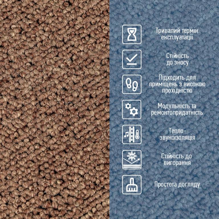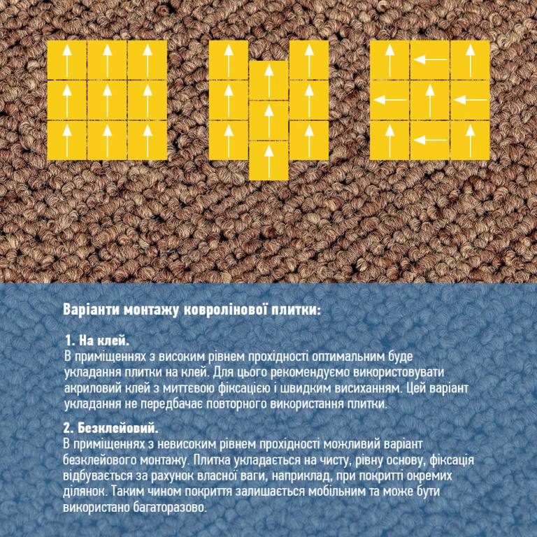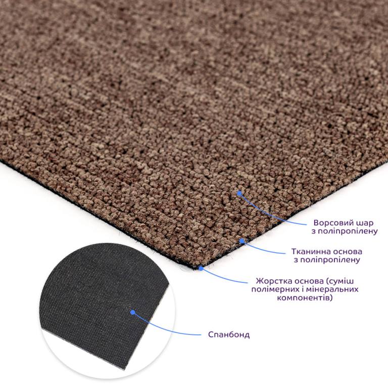Ковролин в плитках — это современное модульное напольное покрытие, состоящее из отдельных квадратных элементов. Плитки легко монтируются за счёт собственного веса или фиксируются клеевым составом. Благодаря высокой плотности ворса материал отличается повышенной износостойкостью, устойчивостью к влаге и механическим нагрузкам. Такое покрытие подходит как для небольших помещений, так и для масштабных площадей с высокой проходимостью: офисов, коридоров, холлов, торговых зон и жилых комнат. Размер: 500x500 мм. Толщина: 3 мм. Площадь: 0,25 кв.м Вес: 500 грамм. Структура и свойства материала 1. Ворс из полипропилена Верхний слой определяет внешний вид покрытия и ощущения при ходьбе. Полипропиленовые (PP) волокна сохраняют форму, не впитывают влагу, устойчивы к истиранию и электризации, легко очищаются. Густота и высота ворса напрямую влияют на долговечность покрытия, поскольку именно этот слой принимает основную нагрузку при эксплуатации. 2. Полипропиленовая тканевая основа Под ворсом находится плотная тканевая подложка — первичная основа, напоминающая по структуре прочное синтетическое полотно. Её задача — надёжно удерживать ворс, равномерно распределять нагрузку и предотвращать вырывание или деформацию волокон. За счёт стабильности размеров этот слой не растягивается и не усыхает в ходе эксплуатации. 3. Жесткая несущая основа Ключевой элемент ковролиновой плитки — плотная композитная плита на основе полимеров и минеральных наполнителей. После отвердевания она обеспечивает необходимую жёсткость и форму, не позволяя плиткам деформироваться при монтаже и использовании. Материал нельзя сгибать: сильный изгиб может привести к появлению трещин по линии сгиба. 4. Спанбонд Дополнительный стабилизирующий слой — тонкое нетканое полотно из полипропилена. Волокна расплавленного полимера формируют прочную «паутинку», спаянную под воздействием температуры. Спанбонд не растягивается, обладает высокой прочностью на разрыв, устойчив к истиранию и влаге, не поддерживает горение. Он обеспечивает стабильность формы плитки и повышает срок её службы. Подготовка основания Ковролин-плитку можно укладывать на большинство оснований: линолеум, плитку, паркет, ламинат и т.п. Чтобы обеспечить качественный и долговечный результат, важно тщательно подготовить поверхность: - Очистка: удалить пыль, грязь, жир и любые загрязнения, которые могут ухудшить сцепление клея. - Ровность: основание должно быть без значимых перепадов, трещин и выбоин. При необходимости используйте шпаклёвку или выравнивающие составы. - Сухость: влажное основание снижает адгезию — убедитесь, что пол полностью сухой после уборки и грунтовки. - Отсутствие грибка: при наличии плесени основание обязательно обработайте антисептическими средствами. Монтаж ковролина в плитках Перед началом работ убедитесь, что основание соответствует требованиям подготовки, а помещение защищено от сквозняков. Приклеивание плиток Для фиксации используются: - Акриловый клей: наносится тонкой полосой по периметру плитки на расстоянии около 2 см от края. - Акрилово-дисперсионный (водно-дисперсионный) клей: наносится сплошным слоем на всю обратную поверхность. Процесс укладки 1. Стартовая точка. Начинайте монтаж с одного угла или центра помещения (в зависимости от схемы раскладки). Важно ровно позиц