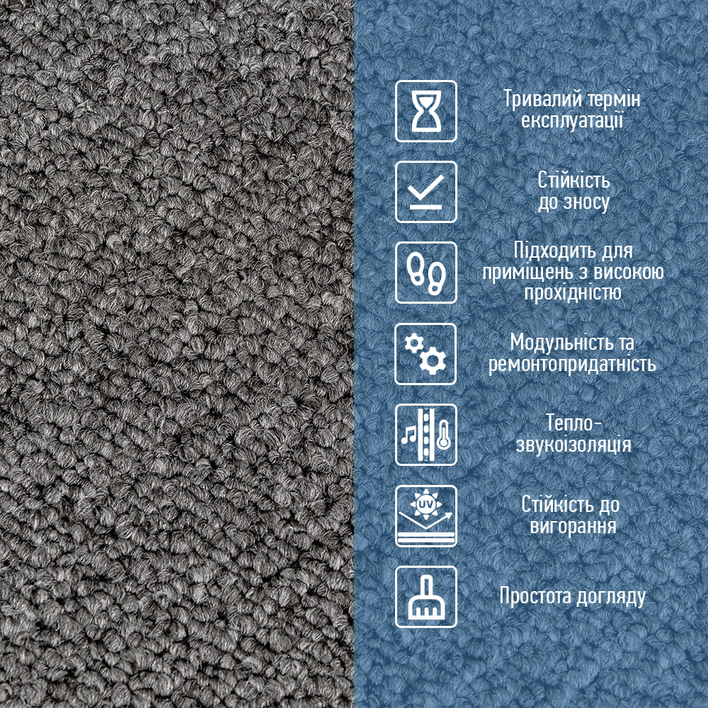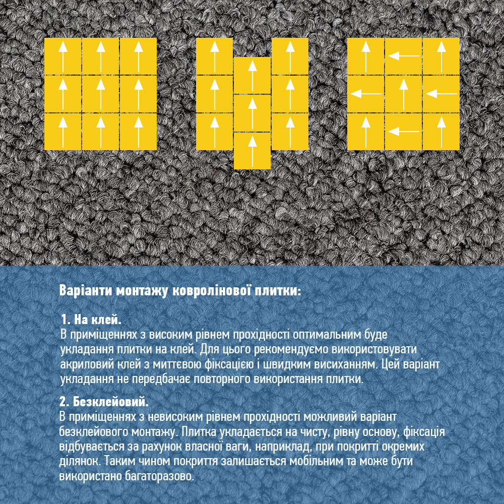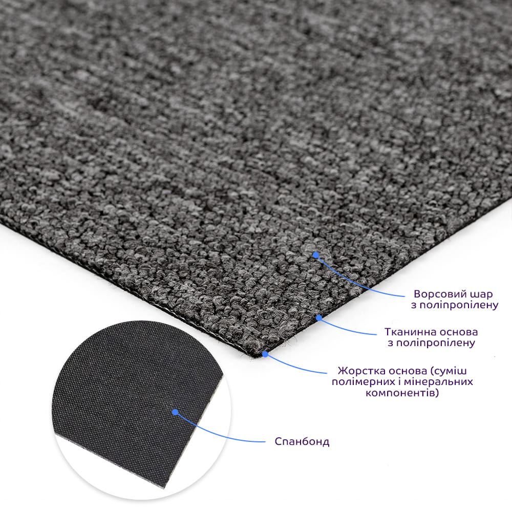 Ковролин в плитках — это современное модульное напольное покрытие, состоящее из отдельных квадратных элементов. Плитки легко монтируются за счёт собственного веса или фиксируются клеевым составом. Благодаря высокой плотности ворса материал отличается повышенной износостойкостью, устойчивостью к влаге и механическим нагрузкам. Такое покрытие подходит как для небольших помещений, так и для масштабных площадей с высокой проходимостью: офисов, коридоров, холлов, торговых зон и жилых комнат. Размер: 500x500 мм. Толщина: 3 мм. Площадь: 0,25 кв.м Вес: 500 грамм. Структура и свойства материала 1. Ворс из полипропилена Верхний слой определяет внешний вид покрытия и ощущения при ходьбе. Полипропиленовые (PP) волокна сохраняют форму, не впитывают влагу, устойчивы к истиранию и электризации, легко очищаются. Густота и высота ворса напрямую влияют на долговечность покрытия, поскольку именно этот слой принимает основную нагрузку при эксплуатации. 2. Полипропиленовая тканевая основа Под ворсом находится плотная тканевая подложка — первичная основа, напоминающая по структуре прочное синтетическое полотно. Её задача — надёжно удерживать ворс, равномерно распределять нагрузку и предотвращать вырывание или деформацию волокон. За счёт стабильности размеров этот слой не растягивается и не усыхает в ходе эксплуатации. 3. Жесткая несущая основа Ключевой элемент ковролиновой плитки — плотная композитная плита на основе полимеров и минеральных наполнителей. После отвердевания она обеспечивает необходимую жёсткость и форму, не позволяя плиткам деформироваться при монтаже и использовании. Материал нельзя сгибать: сильный изгиб может привести к появлению трещин по линии сгиба. 4. Спанбонд Дополнительный стабилизирующий слой — тонкое нетканое полотно из полипропилена. Волокна расплавленного полимера формируют прочную «паутинку», спаянную под воздействием температуры. Спанбонд не растягивается, обладает высокой прочностью на разрыв, устойчив к истиранию и влаге, не поддерживает горение. Он обеспечивает стабильность формы плитки и повышает срок её службы. Подготовка основания Ковролин-плитку можно укладывать на большинство оснований: линолеум, плитку, паркет, ламинат и т.п. Чтобы обеспечить качественный и долговечный результат, важно тщательно подготовить поверхность: - Очистка: удалить пыль, грязь, жир и любые загрязнения, которые могут ухудшить сцепление клея. - Ровность: основание должно быть без значимых перепадов, трещин и выбоин. При необходимости используйте шпаклёвку или выравнивающие составы. - Сухость: влажное основание снижает адгезию — убедитесь, что пол полностью сухой после уборки и грунтовки. - Отсутствие грибка: при наличии плесени основание обязательно обработайте антисептическими средствами. Монтаж ковролина в плитках Перед началом работ убедитесь, что основание соответствует требованиям подготовки, а помещение защищено от сквозняков. Приклеивание плиток Для фиксации используются: - Акриловый клей: наносится тонкой полосой по периметру плитки на расстоянии около 2 см от края. - Акрилово-дисперсионный (водно-дисперсионный) клей: наносится сплошным слоем на всю обратную поверхность. Процесс укладки 1. Стартовая точка. Начинайте монтаж с одного угла или центра помещения (в зависимости от схемы раскладки). Важно ровно позиц