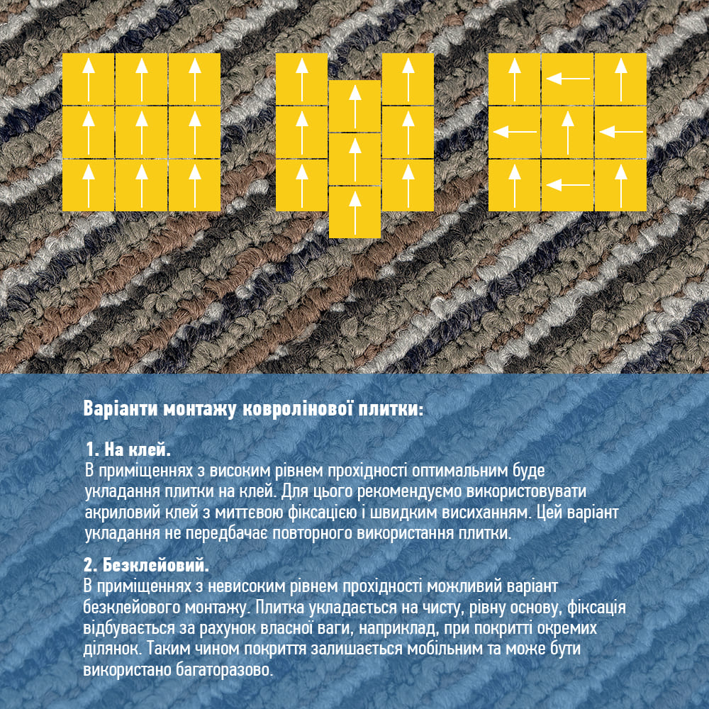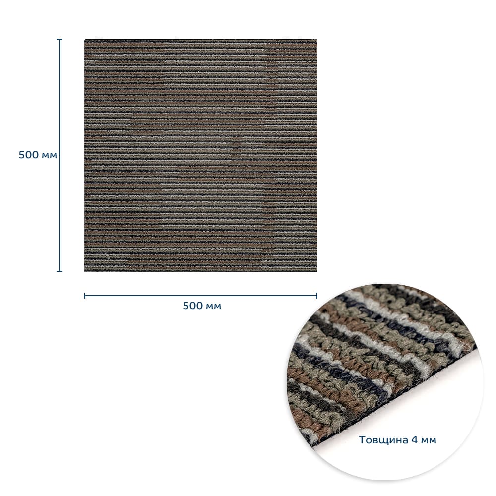 Ковролин в плитках — это современное модульное напольное покрытие, состоящее из отдельных квадратных элементов. Плитки легко монтируются за счёт собственного веса или фиксируются клеевым составом. Благодаря высокой плотности ворса материал отличается повышенной износостойкостью, устойчивостью к влаге и механическим нагрузкам. Такое покрытие подходит как для небольших помещений, так и для масштабных площадей с высокой проходимостью: офисов, коридоров, холлов, торговых зон и жилых комнат. Размер: 500x500 мм. Толщина: 4 мм. Площадь: 0,25 кв.м Вес: 500 грамм. Структура и свойства материала 1. Ворс из полипропилена Верхний слой определяет внешний вид покрытия и ощущения при ходьбе. Полипропиленовые (PP) волокна сохраняют форму, не впитывают влагу, устойчивы к истиранию и электризации, легко очищаются. Густота и высота ворса напрямую влияют на долговечность покрытия, поскольку именно этот слой принимает основную нагрузку при эксплуатации. 2. Полипропиленовая тканевая основа Под ворсом находится плотная тканевая подложка — первичная основа, напоминающая по структуре прочное синтетическое полотно. Её задача — надёжно удерживать ворс, равномерно распределять нагрузку и предотвращать вырывание или деформацию волокон. За счёт стабильности размеров этот слой не растягивается и не усыхает в ходе эксплуатации. 3. Жесткая несущая основа Ключевой элемент ковролиновой плитки — плотная композитная плита на основе полимеров и минеральных наполнителей. После отвердевания она обеспечивает необходимую жёсткость и форму, не позволяя плиткам деформироваться при монтаже и использовании. Материал нельзя сгибать: сильный изгиб может привести к появлению трещин по линии сгиба. 4. Спанбонд Дополнительный стабилизирующий слой — тонкое нетканое полотно из полипропилена. Волокна расплавленного полимера формируют прочную «паутинку», спаянную под воздействием температуры. Спанбонд не растягивается, обладает высокой прочностью на разрыв, устойчив к истиранию и влаге, не поддерживает горение. Он обеспечивает стабильность формы плитки и повышает срок её службы. Подготовка основания Ковролин-плитку можно укладывать на большинство оснований: линолеум, плитку, паркет, ламинат и т.п. Чтобы обеспечить качественный и долговечный результат, важно тщательно подготовить поверхность: - Очистка: удалить пыль, грязь, жир и любые загрязнения, которые могут ухудшить сцепление клея. - Ровность: основание должно быть без значимых перепадов, трещин и выбоин. При необходимости используйте шпаклёвку или выравнивающие составы. - Сухость: влажное основание снижает адгезию — убедитесь, что пол полностью сухой после уборки и грунтовки. - Отсутствие грибка: при наличии плесени основание обязательно обработайте антисептическими средствами. Монтаж ковролина в плитках Перед началом работ убедитесь, что основание соответствует требованиям подготовки, а помещение защищено от сквозняков. Приклеивание плиток Для фиксации используются: - Акриловый клей: наносится тонкой полосой по периметру плитки на расстоянии около 2 см от края. - Акрилово-дисперсионный (водно-дисперсионный) клей: наносится сплошным слоем на всю обратную поверхность. Процесс укладки 1. Стартовая точка. Начинайте монтаж с одного угла или центра помещения (в зависимости от схемы раскладки). Важно ровно позиц