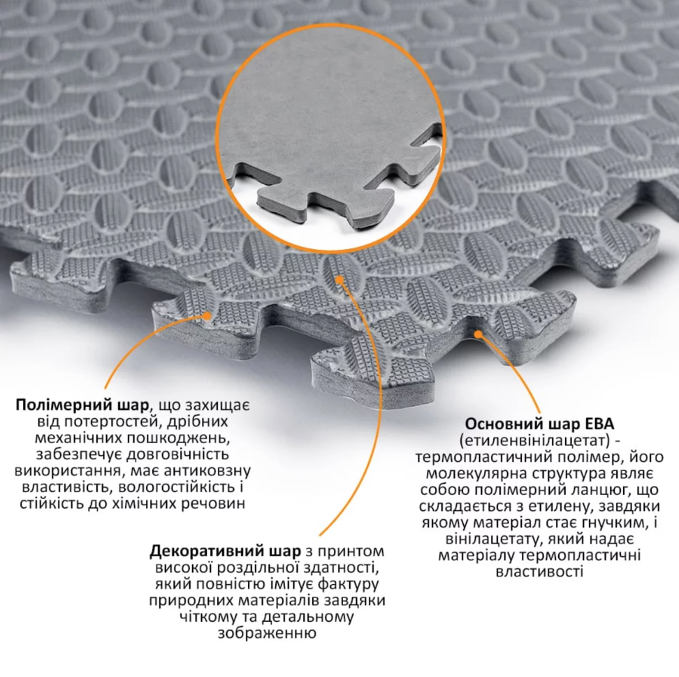 Пол-пазл Sticker wall Silver 60*60см*1см (D) SW-00002660 — представляет собой модульные плиты с вырезанными замками для легкого соединения, формируя прочное и устойчивое покрытие. Основные характеристики этого напольного материала включают мягкость и амортизацию (благодаря использованию материала EVA), водостойкость, износостойкость, теплоизоляцию и небольшой вес. Размер: 600х600х10 мм. Площадь: 1 кв. м = 2,7 пазла. Вес 1 пазла: 250 грамм. Фактура: рельефная, может иметь перфорацию. Материал включает в себя следующие слои: 1. Полимерный защитный слой, предотвращающий износ, мелкие механические повреждения и обеспечивающий долговечность. Он также обладает антискользящими свойствами, влагостойкостью и устойчивостью к воздействию химических веществ. 2. Декоративный слой с высокоразрешенным принтом, который полностью имитирует текстуру природных материалов благодаря четкому и детальному изображению. 3. Основной слой из ЭВА (этиленвинилацетат) - термопластичный полимер с молекулярной структурой, включающей полимерные цепи из этилена, делающие материал гибким, и винилацетата, придающего термопластичные свойства. В состав также входят специальные антистатические и добавки для создания ячеистой структуры, что придает материалу термоизоляционные свойства. Температурные характеристики: Материал обладает стойкостью к температурам в пределах от -50°C до +60°C, в зависимости от содержания винилацетата. При нарушении режима температуры материал может потерять свою упругость. Области применения: Идеально подходит для укладки напольного покрытия в различных жилых помещениях, таких как входные группы, гостиные, спальни, детские комнаты, кухни и ванные комнаты. Также подходит для коммерческих пространств, таких как детские сады, игровые центры, школы, детские зоны в ресторанах и других общественных местах, выставочные площадки, салоны красоты, гостиницы, спортзалы и танцевальные классы. Свойства и преимущества материала: 1. Мягкость и эластичность: Основной компонент напольного покрытия обладает высокой эластичностью и мягкостью, что обеспечивает отличные амортизационные свойства для смягчения ударов. 2. Химическая устойчивость: Материал устойчив к воздействию различных химических веществ, включая слабые кислоты, щелочи, масла и растворители, что позволяет легко проводить чистку с использованием домашних химикатов без риска повреждений. 3. Водостойкость: Пазлы полностью влагостойкие, не набухают и не деформируются, что делает их подходящими для использования в условиях повышенной влажности и предотвращает размножение микроорганизмов и образование плесени. 4. Широкий температурный диапазон: Материал выдерживает температуры от -50°С до +60°С, что позволяет использовать его вблизи радиаторов или батарей. 5. Антистатические свойства: Присутствие антистатических добавок в составе материала и полимерного покрытия исключает электризацию и образование статического заряда. 6. Тепло- и звукоизоляция: Пазлы EVA эффективно изолируют тепло и звук, что особенно полезно в детских комнатах для создания комфортного микроклимата и уменьшения уровня шума. 7. Устойчивость к механическим воздействиям и эластичность: Материал EVA быстро восстанавливает свою форму после механических воздействий, таких как перестановка мебели, не оставляя следов от ножек столов и стульев. 8