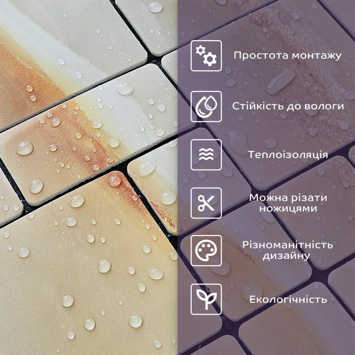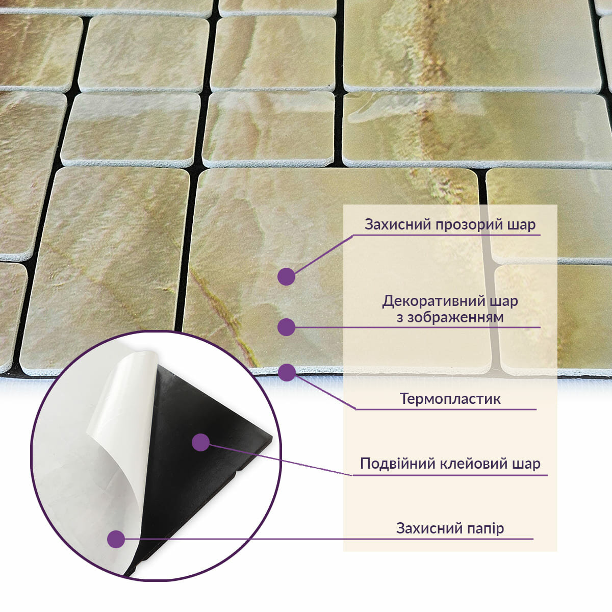 Самоклеящаяся PET мозаика Sticker wall 30*30см*4мм (D) SW-00002442 Современный дизайн с плиткой из ПЭТ: легкость, прочность и стиль Плитка из полиэтилентерефталата (ПЭТ) – это инновационный материал, который открывает новые возможности для создания стильных интерьеров. Благодаря своей легкости, прочности и экологичности, она становится идеальным выбором для декорирования жилых и коммерческих помещений. ПЭТ-плитка позволяет реализовать самые смелые дизайнерские идеи: от элегантных мозаичных узоров до оригинальных художественных инсталляций. Этот материал отлично подходит для отделки стен, мебели, дверей и других поверхностей, создавая современный и функциональный вид. Его универсальность, простота монтажа и долговечность делают ПЭТ-плитку незаменимым решением для любого интерьера. Основные характеристики: Материал: ПЭТ (полиэтилентерефталат). Размер: 30 см x 30 см x 4 мм. Вес: 75 грамм. Площадь покрытия: 1 плитка = 0,09 кв.м; для 1 кв.м требуется 12 единиц. Фактура: ровная, с углублениями между мозаичными элементами. Слои: - Защитный прозрачный слой. - Декоративный слой с изображением. - Термопластик. - Двойной клеевой слой. - Защитная бумага. Температурный режим: от -40°C до +75°C. Назначение: ПЭТ-плитка идеально подходит для внутренних отделочных работ. Она используется для декорирования стен в жилых помещениях (кухня, ванная комната, гостиная, спальня, прихожая), а также в коммерческих объектах. Материал также применяется для отделки мебели, дверей и создания декоративных элементов. Преимущества ПЭТ-плитки: 1. Легкость и прочность: материал легкий, простой в монтаже и долговечный. Плитку можно резать ножницами или монтажным ножом, что делает процесс установки быстрым и удобным. 2. Устойчивость к влаге: ПЭТ-плитка не боится влаги, пара и плесени, что делает ее идеальным выбором для кухонь, ванных комнат и других помещений с повышенной влажностью. 3. Изоляционные свойства: благодаря воздушным прослойкам материал обеспечивает звуковую и теплоизоляцию. 4. Антистатический эффект: поверхность не притягивает пыль, что облегчает уход за ней. 5. Разнообразие дизайна: широкий выбор цветов, текстур и принтов позволяет создавать уникальные интерьеры. 6. Экологичность: ПЭТ-плитка может быть переработана, что делает ее экологически чистым вариантом. 7. Простота в уходе: поверхность легко моется и не требует специальных средств для очистки. 8. Долговечность: срок службы плитки составляет от 5 лет и более. Инструкция по монтажу: 1. Подготовка поверхности: Убедитесь, что поверхность чистая, сухая и ровная. Удалите пыль, грязь и масляные пятна. Плитка и поверхность должны быть комнатной температуры для лучшего сцепления. 2. Снятие защитного слоя: Снимите защитную пленку с обратной стороны плитки, чтобы открыть клейкую поверхность. 3. Начало монтажа: Начните установку с угла, аккуратно прижимая плитку к поверхности. Следите за тем, чтобы плитка ложилась ровно, без пузырьков или складок. 4. Подгонка по размеру: Используйте нож или ножницы для подрезания плитки, особенно по краям и в углах. 5. Фиксация: Плотно прижимайте плитку к поверхности, чтобы обеспечить прочное сцепление. Почему стоит выбрать ПЭТ-плитку? ПЭТ-плитка – это современное решение для тех, кто ценит стиль, практичность и экологичность. Она сочетает в себе легкость монтажа, долговечность и эстетичный вид, что делает ее и