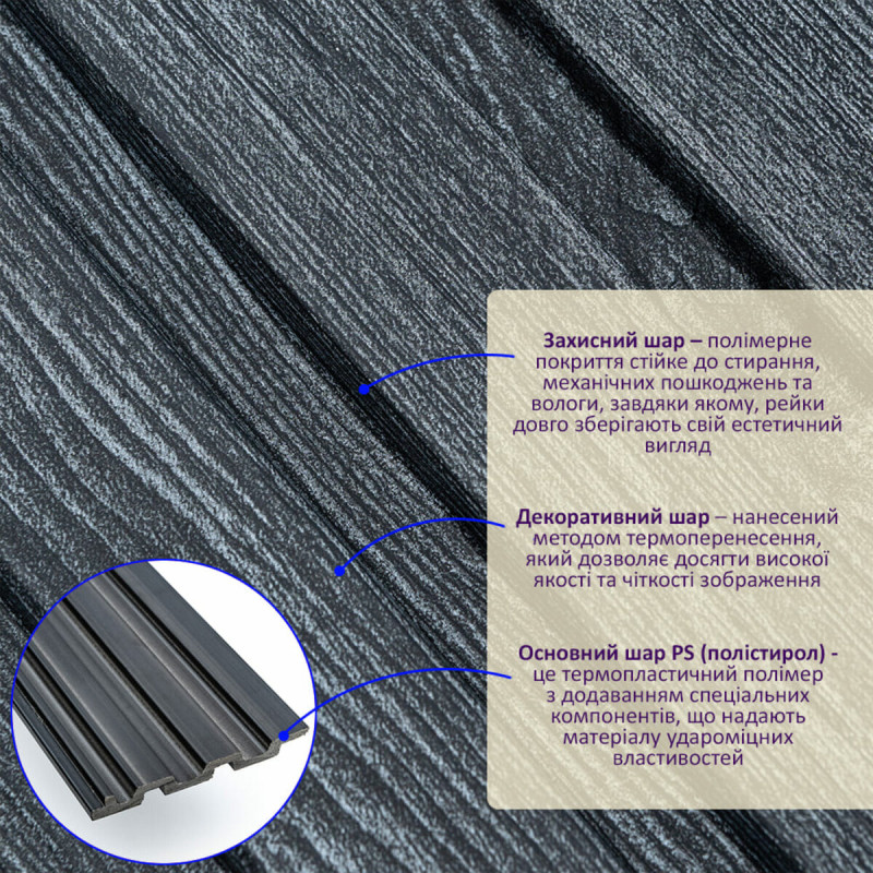 Декоративна PS рейка Sticker wall 2900*120*12мм (D) SW-00002128 - це декоративний елемент для обробки внутрішніх стін, що імітує текстуру дерева. Стінова рейка PS виготовляється з полістиролу і складається з трьох шарів: захисного, декоративного та основного. Особливості: - Довжина: 290 см. - Товщина: 1,2 см. - Ширина: 12 см. Температурний режим: Полістирол (PS) - це термопластичний матеріал, який може витримувати широкий діапазон температур. Залежно від складу PS може витримувати температури від -20°C до +70°C і більше. Для надання PS термостійких властивостей до його складу можуть додавати спеціальні добавки. Основні переваги стінових рейок: - Ударостійкість. - Легкість. - Водостійкість. - Безпека. - Естетичність. Рейки можна використовувати для декорування стін у житлових та комерційних приміщеннях, а також меблів, дверей та інших рівних поверхонь. Розрахунок необхідного матеріалу: 1. Виміряйте довжину та висоту поверхні, яку необхідно облицьовувати. 2. Помножте довжину на висоту в метрах для кожної поверхні та складіть результати, отримавши площу. 3. Розділіть загальну площу на площу однієї рейки, округляючи в більшу сторону. Інструкція з установки: 1. Підготуйте поверхню для кріплення рейок. 2. Для розрізання рейок використовуйте циркулярну пилу або лобзик. 3. Закріпіть рейку на потрібній поверхні за допомогою монтажного клею. 4. Рейки можна встановлювати вертикально або горизонтально. Їх також можна закріпити будівельним степлером. Рекомендації щодо догляду: - Уникайте використання щіток і мочалок з абразивним ефектом. - Для очищення від забруднень використовуйте м'які текстильні або вискозно-бавовняні серветки з м'якою побутовою хімією.Характеристики