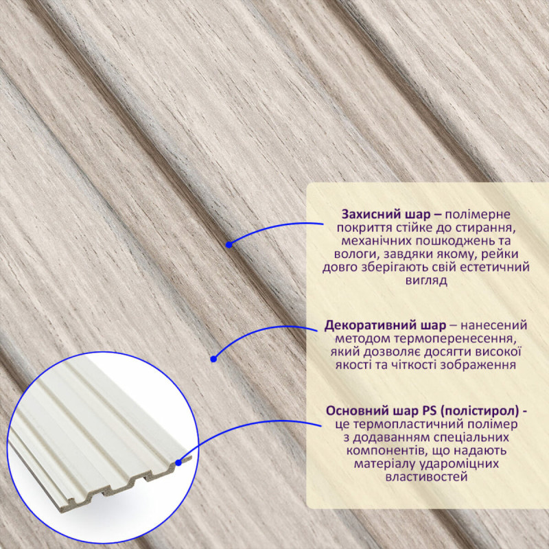 Декоративна PS рейка Sticker wall 2900*120*12мм (D) SW-00002129 - це декоративний елемент для обробки внутрішніх стін, що імітує текстуру дерева. Стінова рейка PS виготовляється з полістиролу і складається з трьох шарів: захисного, декоративного та основного. Особливості: - Довжина: 290 см. - Товщина: 1,2 см. - Ширина: 12 см. Температурний режим: Полістирол (PS) - це термопластичний матеріал, який може витримувати широкий діапазон температур. Залежно від складу PS може витримувати температури від -20°C до +70°C і більше. Для надання PS термостійких властивостей до його складу можуть додавати спеціальні добавки. Основні переваги стінових рейок: - Ударостійкість. - Легкість. - Водостійкість. - Безпека. - Естетичність. Рейки можна використовувати для декорування стін у житлових та комерційних приміщеннях, а також меблів, дверей та інших рівних поверхонь. Розрахунок необхідного матеріалу: 1. Виміряйте довжину та висоту поверхні, яку необхідно облицьовувати. 2. Помножте довжину на висоту в метрах для кожної поверхні та складіть результати, отримавши площу. 3. Розділіть загальну площу на площу однієї рейки, округляючи в більшу сторону. Інструкція з установки: 1. Підготуйте поверхню для кріплення рейок. 2. Для розрізання рейок використовуйте циркулярну пилу або лобзик. 3. Закріпіть рейку на потрібній поверхні за допомогою монтажного клею. 4. Рейки можна встановлювати вертикально або горизонтально. Їх також можна закріпити будівельним степлером. Рекомендації щодо догляду: - Уникайте використання щіток і мочалок з абразивним ефектом. - Для очищення від забруднень використовуйте м'які текстильні або вискозно-бавовняні серветки з м'якою побутовою хімією.Характеристики