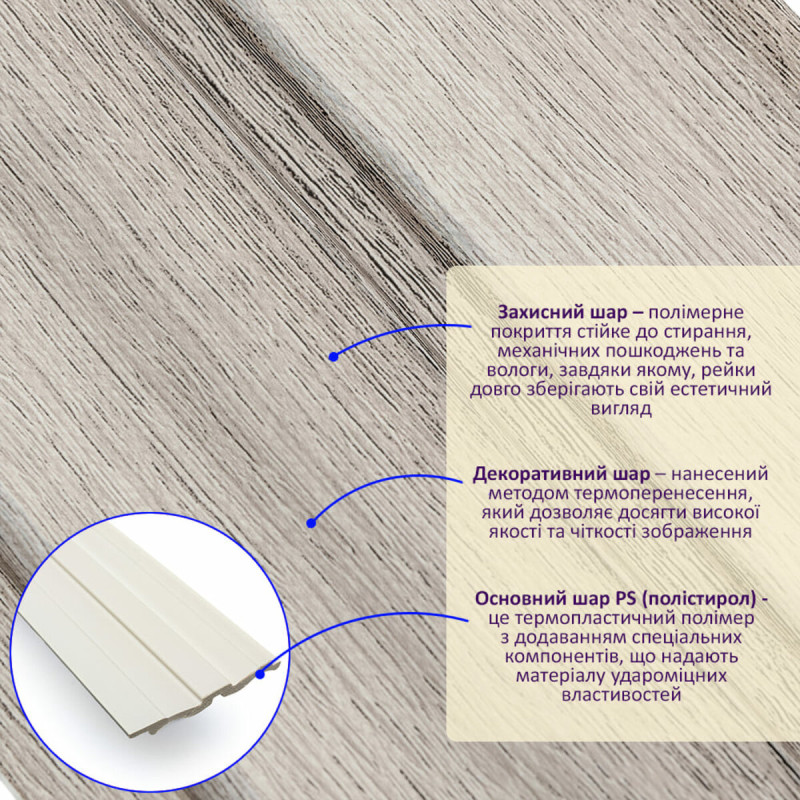 Декоративна PS рейка Sticker wall 2900*120*12мм (D) SW-00002143 - це декоративний елемент для обробки внутрішніх стін, що імітує текстуру дерева. Стінова рейка PS виготовляється з полістиролу і складається з трьох шарів: захисного, декоративного та основного. Особливості: - Довжина: 290 см. - Товщина: 1,2 см. - Ширина: 12 см. Температурний режим: Полістирол (PS) - це термопластичний матеріал, який може витримувати широкий діапазон температур. Залежно від складу PS може витримувати температури від -20°C до +70°C і більше. Для надання PS термостійких властивостей до його складу можуть додавати спеціальні добавки. Основні переваги стінових рейок: - Ударостійкість. - Легкість. - Водостійкість. - Безпека. - Естетичність. Рейки можна використовувати для декорування стін у житлових та комерційних приміщеннях, а також меблів, дверей та інших рівних поверхонь. Розрахунок необхідного матеріалу: 1. Виміряйте довжину та висоту поверхні, яку необхідно облицьовувати. 2. Помножте довжину на висоту в метрах для кожної поверхні та складіть результати, отримавши площу. 3. Розділіть загальну площу на площу однієї рейки, округляючи в більшу сторону. Інструкція з установки: 1. Підготуйте поверхню для кріплення рейок. 2. Для розрізання рейок використовуйте циркулярну пилу або лобзик. 3. Закріпіть рейку на потрібній поверхні за допомогою монтажного клею. 4. Рейки можна встановлювати вертикально або горизонтально. Їх також можна закріпити будівельним степлером. Рекомендації щодо догляду: - Уникайте використання щіток і мочалок з абразивним ефектом. - Для очищення від забруднень використовуйте м'які текстильні або вискозно-бавовняні серветки з м'якою побутовою хімією.Характеристики