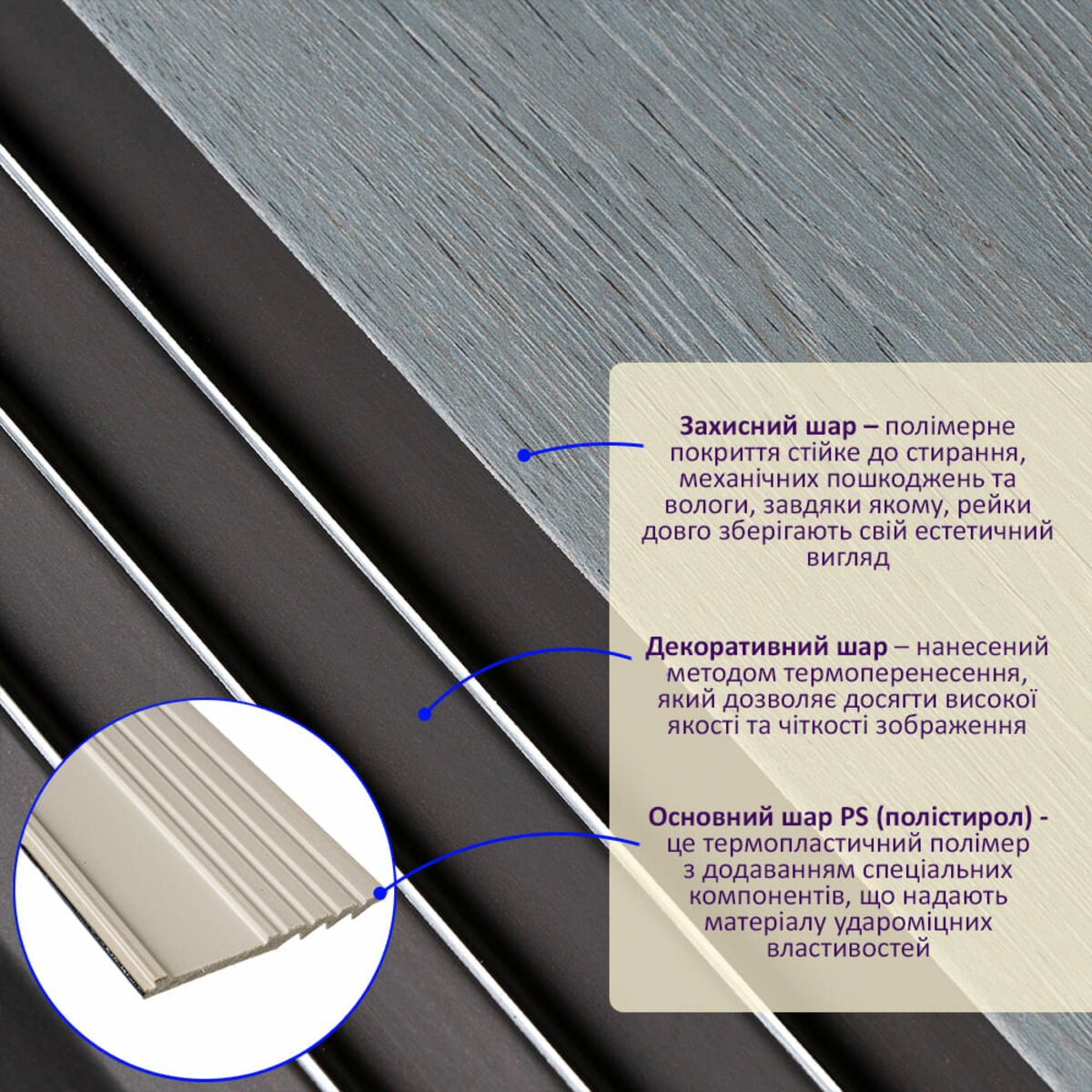 Декоративна PS рейка Sticker wall 2900*160*11мм (D) SW-00002149 — це декоративний елемент для обробки внутрішніх стін, що імітує текстуру дерева. Стінова рейка PS виготовляється з полістиролу і складається з трьох шарів: захисного, декоративного та основного. Температурний режим: Полістирол (PS) - це термопластичний матеріал, який може витримувати широкий діапазон температур. Залежно від складу PS може витримувати температури від -20°C до +70°C і більше. Для надання PS термостійких властивостей до його складу можуть додавати спеціальні добавки. Основні переваги стінових рейок: - Ударостійкість. - Легкість. - Водостійкість. - Безпека. - Естетичність. Рейки можна використовувати для декорування стін у житлових та комерційних приміщеннях, а також меблів, дверей та інших рівних поверхонь. Розрахунок необхідного матеріалу: 1. Виміряйте довжину та висоту поверхні, яку необхідно облицьовувати. 2. Помножте довжину на висоту в метрах для кожної поверхні та складіть результати, отримавши площу. 3. Розділіть загальну площу на площу однієї рейки, округляючи в більшу сторону. Інструкція з установки: 1. Підготуйте поверхню для кріплення рейок. 2. Для розрізання рейок використовуйте циркулярну пилу або лобзик. 3. Закріпіть рейку на потрібній поверхні за допомогою монтажного клею. 4. Рейки можна встановлювати вертикально або горизонтально. Їх також можна закріпити будівельним степлером. Рекомендації щодо догляду: - Уникайте використання щіток і мочалок з абразивним ефектом. - Для очищення від забруднень використовуйте м'які текстильні або вискозно-бавовняні серветки з м'якою побутовою хімією.Характеристики