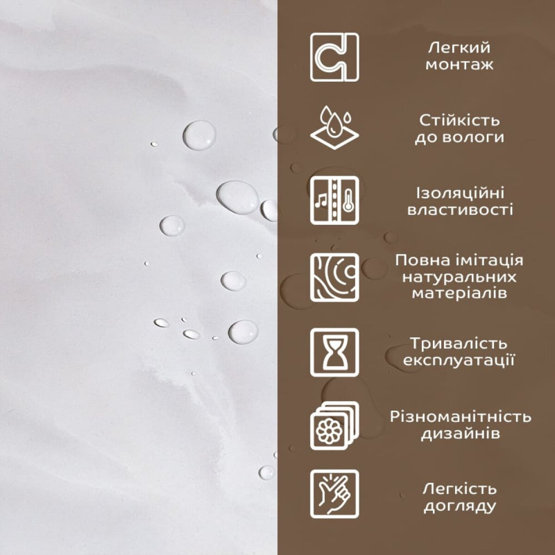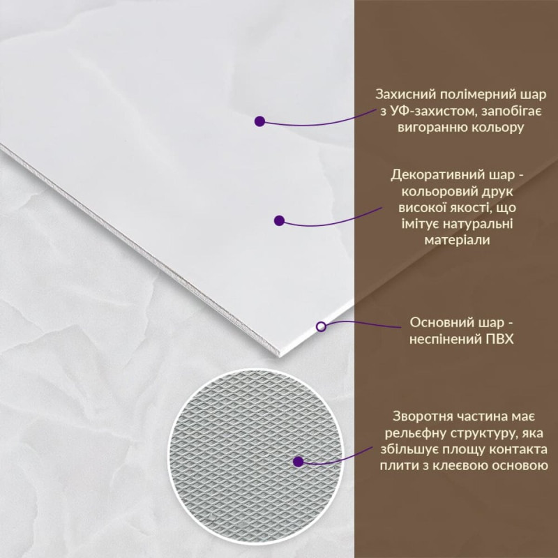 Декоративна ПВХ плита Sticker wall 600х600мм SW-00002838 — виготовляється на сучасному високоточному обладнанні з якісних, стійких до впливу зовнішнього середовища матеріалів та безпечних для здоров’я фарб. Завдяки широкому вибору фактур і кольорів ви легко реалізуєте найсміливіші дизайнерські задуми як у житлових, так і в комерційних приміщеннях. Вони ідеально підходять для оздоблення стін, стель, зон кухні чи ванної кімнати. Монтаж плит надзвичайно простий та не потребує спеціальних навичок — достатньо силіконового або акрилового клею, лобзика або болгарки, рівня, олівця та лінійки. Плити ПВХ відзначаються високою стійкістю до вологи, подряпин і перепадів температур, що забезпечує їхню довговічність та збереження привабливого вигляду на роки. Переваги: • Плити ПВХ — це ідеальний матеріал для оздоблення, який поєднує естетику та зручність. Завдяки своїй невеликій вазі та гнучкості, їх легко транспортувати навіть у важкодоступні приміщення — сходові марші чи вузькі коридори не стануть на заваді. Монтаж плит не потребує спеціальної підготовки чи дорогого обладнання: достатньо звичайного лобзика або болгарки, ґрунтовки та клею. Навіть поверхню не потрібно ретельно готувати — легке ґрунтування повністю достатнє для якісного поклейки. • Матеріал імітує натуральну текстуру мармуру чи каменю та дозволяє створити цілісний, безшовний малюнок, що надає інтер’єру преміального вигляду. Плити ідеально підходять для ванних кімнат завдяки своїй вологостійкості, а при нарізці утворюють мінімальну кількість сміття — що робить процес оздоблення максимально чистим і акуратним. Це — екологічно чистий, гіпоалергенний та пожежобезпечний варіант для будь-якого житлового або комерційного простору. • Термін служби плит — понад 20 років, а їхня стійкість до впливу зовнішнього середовища гарантує збереження вигляду на роки. Завдяки компактності та малій товщині листів, їх зручно зберігати до початку монтажу. ПВХ-плити забезпечують додаткову теплоізоляцію, легко миються, та не потребують складного догляду. А завдяки широкому спектру застосування, цей матеріал підходить для оздоблення стін, стель, кухонних фартухів, санвузлів та навіть офісних зон. Інструкція з монтажу ПВХ плит: 1. Перед монтажем переконайтесь, що стіна рівна — це гарантує естетичний вигляд та надійність покриття. 2. Поверхню обов’язково потрібно проґрунтувати для кращого зчеплення з клеєм. 3. Виставте горизонтальний рівень по довжині стіни, щоб забезпечити рівне укладання плит. 4. На тильну сторону плити нанесіть клей суцільним шаром товщиною 1,5–2 мм, далі — обережно підійміть плиту (бажано з напарником) та щільно притисніть до поверхні по виставленому рівню. 5. Зафіксуйте її на 2 хвилини — і можна переходити до наступної. Розмір кожної плити — 600x600 мм, товщина — 3 мм, вага — лише 2,4 кг, що робить процес монтажу зручним і швидким навіть для новачків. Обираючи ПВХ-плити, ви отримуєте елегантне рішення з легким доглядом та високою функціональністю — оптимальний вибір для сучасного простору.Характеристики