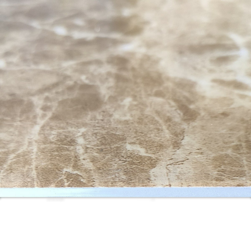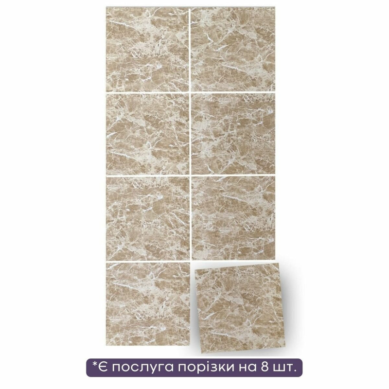 Розміри доступних варіантів: 1. Повна панель: 2,44 метра завширшки та 1,22 метра заввишки, з товщиною 3 міліметри (повна передоплата). 2. Комплекти: у комплекті 8 нарізаних плиток розміром 60 на 60 сантиметрів кожна. 3. Окремі плитки (за 1 шт): розмір кожної плитки становить 60 на 60 сантиметрів, але малюнок на них може трохи відрізнятись. Матеріал: ПВХ (призначений для внутрішнього оздоблення). Фактура: імітація мармуру. Вага 1 листа 2,44 х1, 22 — 19 кг. Матеріал має такі властивості: 1. Невелика вага, що робить його легким у використанні. 2. Не поглинає воду, що дозволяє йому зберігати свої властивості навіть у вологих умовах. 3. Стійкість до вологого та теплого середовища. 4. Не схильний до появи грибка, що гарантує його довговічність. 5. Має середню гнучкість, що дозволяє йому пристосовуватися до різних форм і контурів. 6. Непористий матеріал не дозволяє проникати волозі та іншим речовинам. 7. Стійкий до механічних пошкоджень, що забезпечує його довговічність під час використання. 8. Термін служби становить не менше 20 років, що робить його надійним та довговічним матеріалом. Структура матеріалу включає такі шари: 1. Верхній шар має ромбоподібну, опуклу основу, яка покращує адгезію при поклейці. 2. Наступний шар являє собою монолітний спінений ПВХ без пір, що забезпечує додаткові характеристики міцності. 3. За ним слідує глянцева термоперекладна плівка, яка надає матеріалу естетичне сяйво. 4. На верхній шар нанесений лак, який надає матеріалу додаткового захисту та блиску. 5. Захисна плівка забезпечує збереження матеріалу під час транспортування та зберігання. Переваги плит з ПВХ: - Матеріал має невелику вагу та гнучкість. - Для його встановлення не потрібна спеціальна підготовка, що спрощує процес монтажу. - Поверхню легко підготувати до поклеювання за допомогою ґрунтовки. - Є можливість створення одноманітного малюнка. - Матеріал імітує натуральні матеріали, такі як мармур та камінь. - Безшовна установка забезпечує естетичність та міцність. - Використання матеріалу у ванних кімнатах є безпечним. - При нарізанні та монтажі мінімізується утворення відходів. - Для нарізки не потрібне спеціалізоване верстатне обладнання, достатньо лобзика або болгарки. - Для монтажу потрібна мінімальна кількість будівельних матеріалів (тільки ґрунтовка та клей). - Термін служби матеріалу складає не менше 20 років. - Матеріал екологічно чистий та гіпоалергенний. - Володіє пожежобезпечністю. - Зручність та безпека при транспортуванні та укладанні. - Завдяки легкості та гнучкості матеріалу можна доставити його у важкодоступні місця, такі як сходові марші та прольоти у квартирі. - Догляд за матеріалом простий та зручний. - Завдяки товщині листів вони можуть бути компактно розміщені у приміщенні до початку монтажу. - Матеріал має теплоізоляційні властивості. - Має широкий спектр застосування. Необхідні інструменти та матеріали для встановлення ПВХ: 1. Рівень – використовується для перевірки горизонтальності та вертикальності при монтажі ПВХ матеріалів, забезпечуючи точність та рівність. 2. Лінійка - необхідна для вимірювання та позначок при обрізанні та монтажі ПВХ, допомагає отримати точні розміри та вирівнювання. 3. Лобзик (болгарка) - використовується для нарізки ПВХ матеріалів за потрібними розмірами та формами. Лобзик забезпечує точні та акуратні різи. 4. Силіконовий або акрил