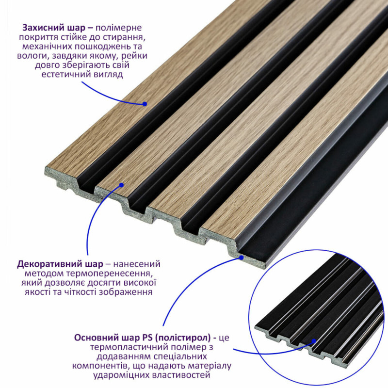 Декоративна стінова PS рейка Sticker wall 120*2900*11мм (D) SW-00001738 - це декоративний елемент для обробки внутрішніх стін, що імітує текстуру дерева. Стінова рейка PS виготовляється з полістиролу і складається з трьох шарів: захисного, декоративного та основного. Особливості: - Довжина: 290 см. - Товщина: 1,2 см. - Ширина: 12 см. Температурний режим: Полістирол (PS) - це термопластичний матеріал, який може витримувати широкий діапазон температур. Залежно від складу PS може витримувати температури від -20°C до +70°C і більше. Для надання PS термостійких властивостей до його складу можуть додавати спеціальні добавки. Основні переваги стінових рейок: - Ударостійкість. - Легкість. - Водостійкість. - Безпека. - Естетичність. Рейки можна використовувати для декорування стін у житлових та комерційних приміщеннях, а також меблів, дверей та інших рівних поверхонь. Розрахунок необхідного матеріалу: 1. Виміряйте довжину та висоту поверхні, яку необхідно облицьовувати. 2. Помножте довжину на висоту в метрах для кожної поверхні та складіть результати, отримавши площу. 3. Розділіть загальну площу на площу однієї рейки, округляючи в більшу сторону. Інструкція з установки: 1. Підготуйте поверхню для кріплення рейок. 2. Для розрізання рейок використовуйте циркулярну пилу або лобзик. 3. Закріпіть рейку на потрібній поверхні за допомогою монтажного клею. 4. Рейки можна встановлювати вертикально або горизонтально. Їх також можна закріпити будівельним степлером. Рекомендації щодо догляду: - Уникайте використання щіток і мочалок з абразивним ефектом. - Для очищення від забруднень використовуйте м'які текстильні або вискозно-бавовняні серветки з м'якою побутовою хімією.Характеристики