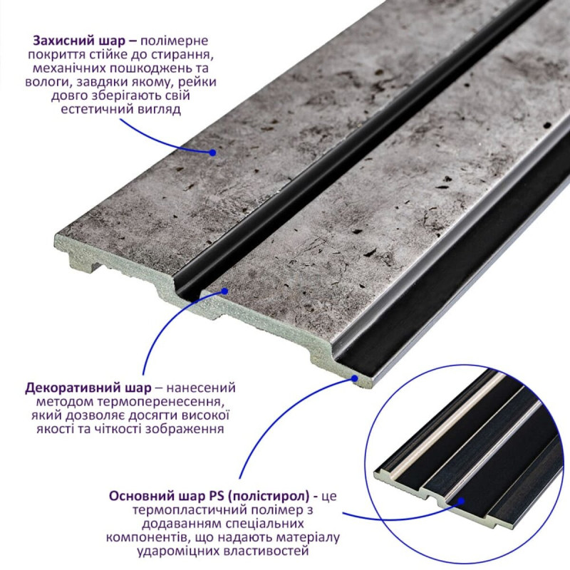 Декоративна стінова PS рейка Sticker wall 120*2900*12мм (D) SW-00001752 - це декоративний елемент для обробки внутрішніх стін, що імітує текстуру дерева. Стінова рейка PS виготовляється з полістиролу і складається з трьох шарів: захисного, декоративного та основного. Особливості: - Довжина: 290 см. - Товщина: 1,2 см. - Ширина: 12 см. Температурний режим: Полістирол (PS) - це термопластичний матеріал, який може витримувати широкий діапазон температур. Залежно від складу PS може витримувати температури від -20°C до +70°C і більше. Для надання PS термостійких властивостей до його складу можуть додавати спеціальні добавки. Основні переваги стінових рейок: - Ударостійкість. - Легкість. - Водостійкість. - Безпека. - Естетичність. Рейки можна використовувати для декорування стін у житлових та комерційних приміщеннях, а також меблів, дверей та інших рівних поверхонь. Розрахунок необхідного матеріалу: 1. Виміряйте довжину та висоту поверхні, яку необхідно облицьовувати. 2. Помножте довжину на висоту в метрах для кожної поверхні та складіть результати, отримавши площу. 3. Розділіть загальну площу на площу однієї рейки, округляючи в більшу сторону. Інструкція з установки: 1. Підготуйте поверхню для кріплення рейок. 2. Для розрізання рейок використовуйте циркулярну пилу або лобзик. 3. Закріпіть рейку на потрібній поверхні за допомогою монтажного клею. 4. Рейки можна встановлювати вертикально або горизонтально. Їх також можна закріпити будівельним степлером. Рекомендації щодо догляду: - Уникайте використання щіток і мочалок з абразивним ефектом. - Для очищення від забруднень використовуйте м'які текстильні або вискозно-бавовняні серветки з м'якою побутовою хімією.Характеристики