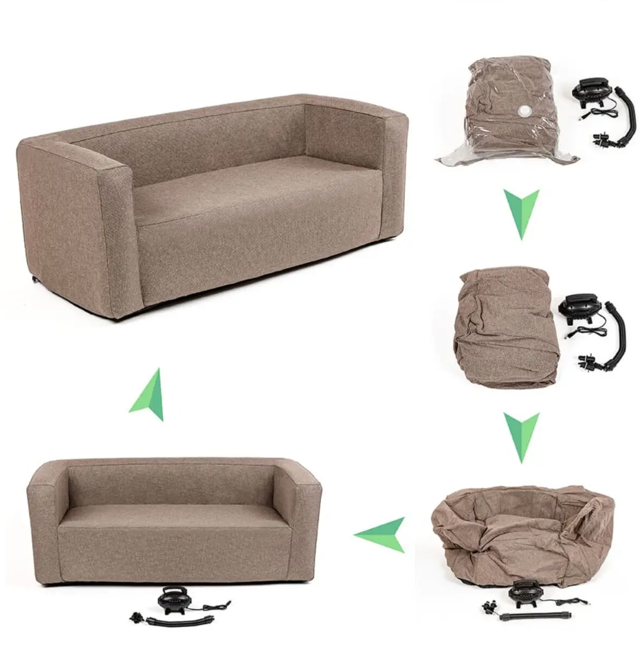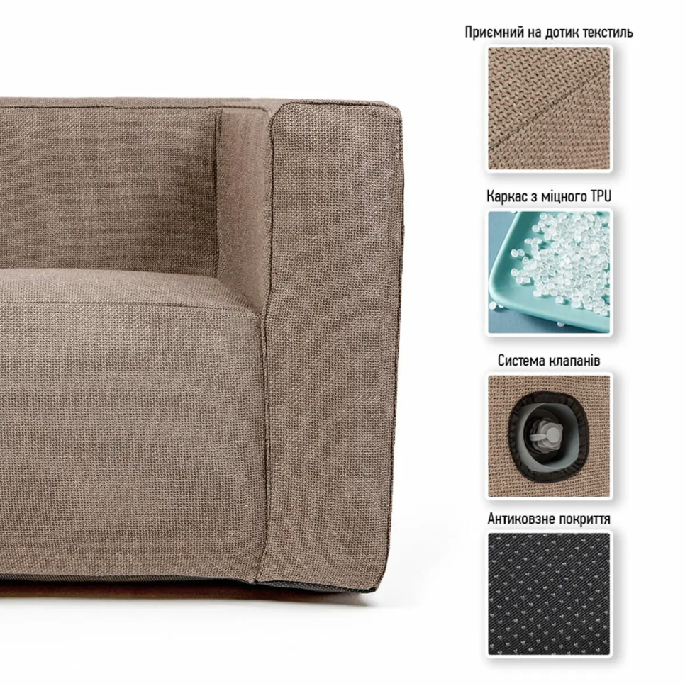 Комплект надувних меблів Sticker wall диван та 2 крісла коричневий SW-00002657 Надувні меблі: стиль, практичність, компактність Представляємо надувні меблі з сучасним дизайном і високою функціональністю. Основа з міцного термопластичного поліуретану (TPU) стійка до зносу, вологи та перепадів температур (від -40°C до 80°C). Верхній шар із поліестеру з текстурою льону витримує до 40 000 циклів тертя, не вигорає та легко чиститься. Нижня частина з нейлонової тканини та гумовими точками (TPR) запобігає ковзанню. Розміри (надуте/здуте): Коробка 1, 2: 200x430x520 мм. Коробка 3: 300x450x550 мм. Допустима похибка: ±5%. Комплект: Диван – 1 шт. Крісло – 2 шт. Компресійний мішок – 3 шт. Насос із насадками – у подарунок. Переваги: 1. Легка та компактна – зручно зберігати й транспортувати. 2. Зносостійка, стійка до УФ-променів і плісняви. 3. Екологічна та проста в догляді. 4. Стильний дизайн для будь-якого інтер’єру. 5. Антиковзке покриття для стабільності. 6. Швидке складання за хвилини. Де використовувати: Ідеально підходить для дому, офісу, кафе, виставок, подорожей або тимчасового житла. Придатне для вулиці та приміщень. Догляд: Чистіть вологою губкою з м’яким засобом, сушіть природним способом. Зберігайте у здутому вигляді в сухому місці в компресійному мішку. Гарантія: 60 днів на заводський брак. Не поширюється на пошкодження від неправильного використання.Характеристики