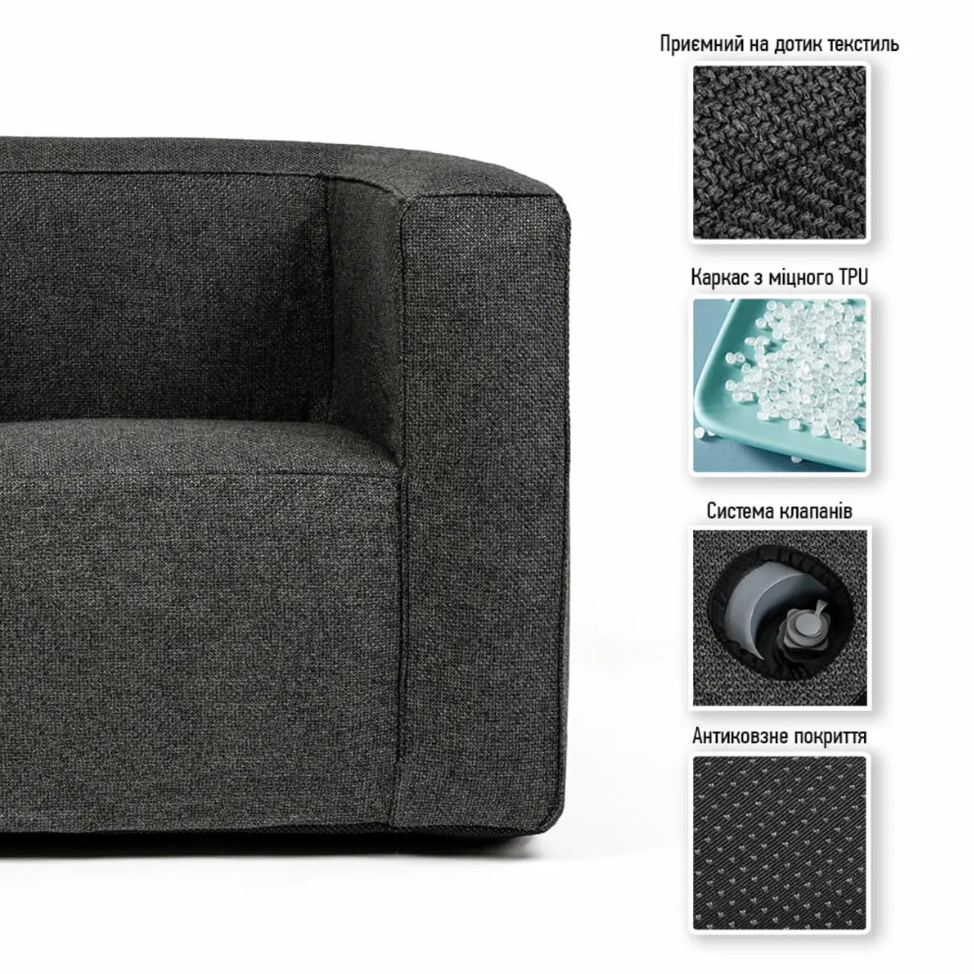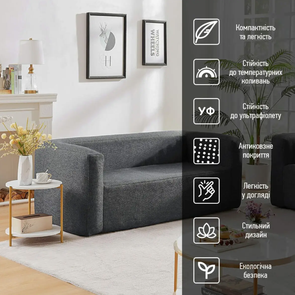 Комплект надувних меблів Sticker wall диван та крісло сірий SW-00002658 Надувні меблі: стиль, практичність, компактність Представляємо надувні меблі, що поєднують сучасний дизайн і зручність. Каркас із міцного термопластичного поліуретану (TPU) витримує знос, перепади температур (від -40°C до 80°C) і стійкий до вологи, масел та ультрафіолету. Верхній шар із поліестеру з лляним переплетенням (зносостійкість 40 000 циклів за Мартиндейлом) приємний на дотик, не вигоряє і легко чиститься. Нижня частина з нейлонової тканини та протиковзкими гумовими точками з TPR забезпечує стійкість на будь-якій поверхні. Розміри упаковки: Коробка 1: 200x430x520 мм. Коробка 2: 300x450x550 мм. Похибка розмірів: ±5% (залежить від температури та ступеня надування). Комплект: Диван – 1 шт. Крісло – 1 шт. Компресійні мішки – 2 шт. Насос із насадками – у подарунок. Переваги: 1. Легка і компактна – зручно зберігати та перевозити. 2. Міцна – стійка до зносу, плісняви та ультрафіолету. 3. Екологічна – безпечні матеріали. 4. Проста у догляді – чиститься вологою тканиною. 5. Стильна – універсальний дизайн для будь-якого інтер’єру. 6. Швидке складання – готова за хвилини. Застосування: Ідеально підходить для дому, офісу, подорожей, заходів або тимчасового житла. Придатна для приміщень і вулиці. Догляд: Чистіть м’якою щіткою або губкою з теплою водою та м’яким засобом. Сушіть природним способом. Зберігайте в здутому вигляді в сухому місці, бажано в компресійному мішку. Гарантія: 60 днів на заводський брак. Не поширюється на пошкодження від неправильного використання.Характеристики