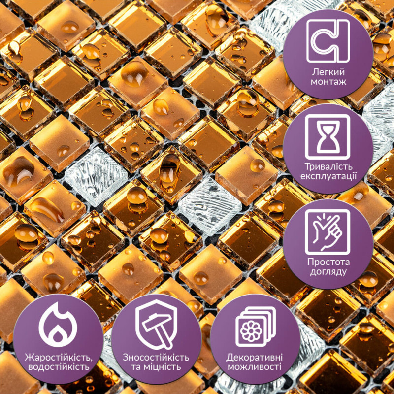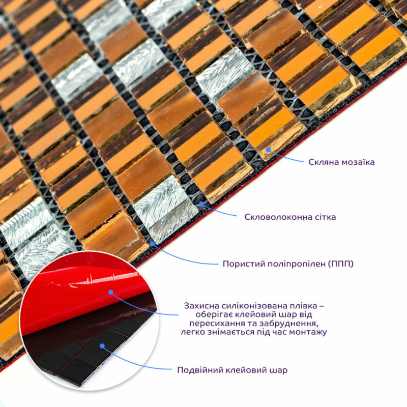 Мозаїка дзеркальна мідна Sticker wall 298х298х4,5мм SW-00002370 Скляна мозаїка – вишуканий декоративний матеріал, який чудово доповнює інтер'єр, створюючи яскраві акценти. Завдяки наявності клейової основи її монтаж займає мінімум часу, а універсальність дозволяє використовувати матеріал для обробки різних поверхонь, включаючи стіни ванних кімнат і кухонь. Розміри: 298х298 мм, товщина - 4,5 мм. Площа покриття: 1 шт - 0,088 кв. м. Вага: 570 грам. Фактура Матеріал має ефект 3D, що надає глибини та виразності дизайну. Глянцева поверхня мозаїки доповнюється матовими елементами в деяких моделях, а фрагменти з фацетованими (скошеними) краями посилюють віддзеркалення світла, створюючи цікаву гру відблисків. Застосування Скляна мозаїка ідеально підходить для внутрішнього оздоблення приміщень з підвищеною вологістю, таких як ванні кімнати, кухні та душові зони. Її також використовують для оформлення стін у житлових та комерційних просторах, акцентування меблів, дверей чи інших рівних поверхонь, додаючи стиль та індивідуальність. Шари матеріалу: 1. Скляна мозаїка – це невеликі квадратні елементи (тесери), виготовлені із міцного та прозорого скла. 2. Сітка - кожен елемент мозаїки закріплений на основі полімерної або скловолоконної сітки, що полегшує укладання покриття в єдиній композиції. 3. Пористий поліпропілен (ППП) - термопластичний полімер з пористою структурою, що складається з повторюваних молекул пропілену. Він відрізняється хорошими термоізоляційними властивостями, низькою щільністю та легкою вагою, а також стійкістю до вологи та хімічною нейтральністю. 4. Подвійний клейовий шар - безпечний та екологічний матеріал з високим ступенем адгезії. 5. Захисна силіконова плівка - захищає клейовий шар від забруднень та пересихання, легко видаляється під час монтажу. Переваги скляної мозаїки: - Простота установки: Самоклеюча основа мозаїки дозволяє швидко та легко монтувати її на будь-які рівні поверхні без використання складних інструментів. Надійна фіксація запобігає зміщенню елементів під час укладання. - Стійкість до вологи та температури: Скляна мозаїка з клейовою основою відмінно переносить вплив вологи та перепади температур, що робить її ідеальним рішенням для кухонь, ванних кімнат та душових. Вона захищає поверхню від плісняви, забезпечуючи гігієнічність та довговічність. - Надійність та довговічність: Використання якісного скла та передових технологій виробництва робить мозаїку стійкою до подряпин та механічних пошкоджень, що гарантує її тривалий термін служби навіть за інтенсивної експлуатації. - Естетика та універсальність: Мозаїка представлена в широкому асортименті кольорів та візерунків, що дозволяє підібрати ідеальний варіант для будь-якого інтер'єру. Це стильна альтернатива традиційній керамічній плитці. - Легкість догляду: Скляна мозаїка не вбирає забруднення, легко очищається і не потребує спеціальних миючих засобів. Вона зберігає привабливий зовнішній вигляд навіть за умов підвищеної вологості та частого використання. Рекомендації щодо догляду Не рекомендується використовувати абразивні щітки та губки, а також засоби для чищення з високим вмістом лугу або кислот. Матеріал також чутливий до дії води з підвищеною концентрацією солі. Як розрахувати необхідну кількість матеріалу: 1. Виміряйте параметри поверхні. Визначте довж