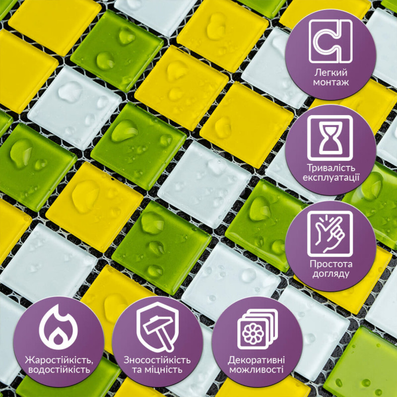 Мозаїка із декоративного скла жовто-зелена Sticker wall 298х298х4,5мм SW-00002362 Скляна мозаїка – вишуканий декоративний матеріал, який чудово доповнює інтер'єр, створюючи яскраві акценти. Завдяки наявності клейової основи її монтаж займає мінімум часу, а універсальність дозволяє використовувати матеріал для обробки різних поверхонь, включаючи стіни ванних кімнат і кухонь. Розміри: 298х298 мм, товщина - 4,5 мм. Площа покриття: 1 шт - 0,088 кв. м. Вага: 570 грам. Фактура Матеріал має ефект 3D, що надає глибини та виразності дизайну. Глянцева поверхня мозаїки доповнюється матовими елементами в деяких моделях, а фрагменти з фацетованими (скошеними) краями посилюють віддзеркалення світла, створюючи цікаву гру відблисків. Застосування Скляна мозаїка ідеально підходить для внутрішнього оздоблення приміщень з підвищеною вологістю, таких як ванні кімнати, кухні та душові зони. Її також використовують для оформлення стін у житлових та комерційних просторах, акцентування меблів, дверей чи інших рівних поверхонь, додаючи стиль та індивідуальність. Шари матеріалу: 1. Скляна мозаїка – це невеликі квадратні елементи (тесери), виготовлені із міцного та прозорого скла. 2. Сітка - кожен елемент мозаїки закріплений на основі полімерної або скловолоконної сітки, що полегшує укладання покриття в єдиній композиції. 3. Пористий поліпропілен (ППП) - термопластичний полімер з пористою структурою, що складається з повторюваних молекул пропілену. Він відрізняється хорошими термоізоляційними властивостями, низькою щільністю та легкою вагою, а також стійкістю до вологи та хімічною нейтральністю. 4. Подвійний клейовий шар - безпечний та екологічний матеріал з високим ступенем адгезії. 5. Захисна силіконова плівка - захищає клейовий шар від забруднень та пересихання, легко видаляється під час монтажу. Переваги скляної мозаїки: - Простота установки: Самоклеюча основа мозаїки дозволяє швидко та легко монтувати її на будь-які рівні поверхні без використання складних інструментів. Надійна фіксація запобігає зміщенню елементів під час укладання. - Стійкість до вологи та температури: Скляна мозаїка з клейовою основою відмінно переносить вплив вологи та перепади температур, що робить її ідеальним рішенням для кухонь, ванних кімнат та душових. Вона захищає поверхню від плісняви, забезпечуючи гігієнічність та довговічність. - Надійність та довговічність: Використання якісного скла та передових технологій виробництва робить мозаїку стійкою до подряпин та механічних пошкоджень, що гарантує її тривалий термін служби навіть за інтенсивної експлуатації. - Естетика та універсальність: Мозаїка представлена в широкому асортименті кольорів та візерунків, що дозволяє підібрати ідеальний варіант для будь-якого інтер'єру. Це стильна альтернатива традиційній керамічній плитці. - Легкість догляду: Скляна мозаїка не вбирає забруднення, легко очищається і не потребує спеціальних миючих засобів. Вона зберігає привабливий зовнішній вигляд навіть за умов підвищеної вологості та частого використання. Рекомендації щодо догляду Не рекомендується використовувати абразивні щітки та губки, а також засоби для чищення з високим вмістом лугу або кислот. Матеріал також чутливий до дії води з підвищеною концентрацією солі. Як розрахувати необхідну кількість матеріалу: 1. Виміряйте параметри повер