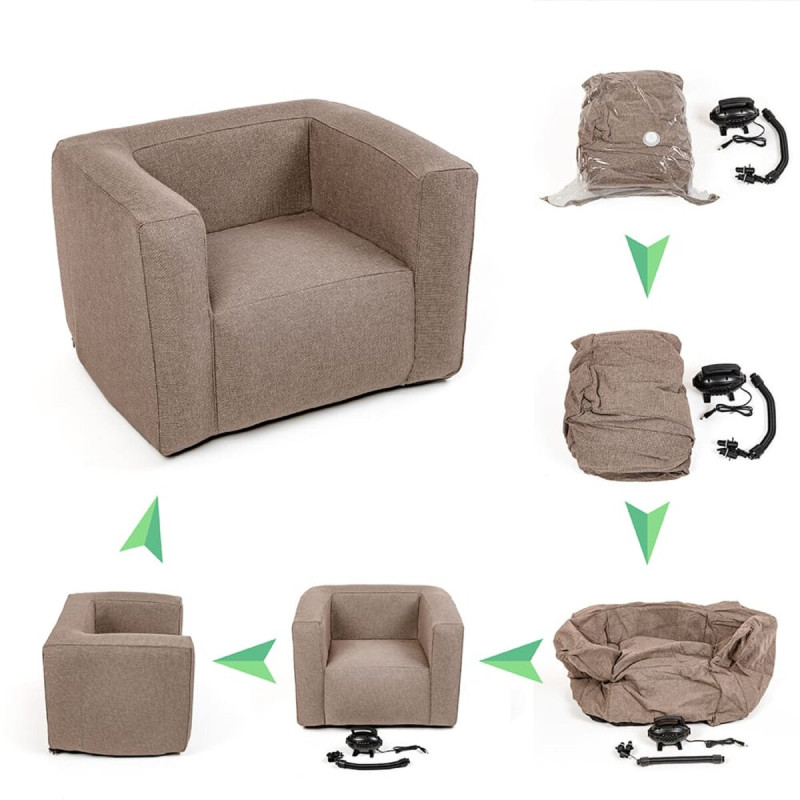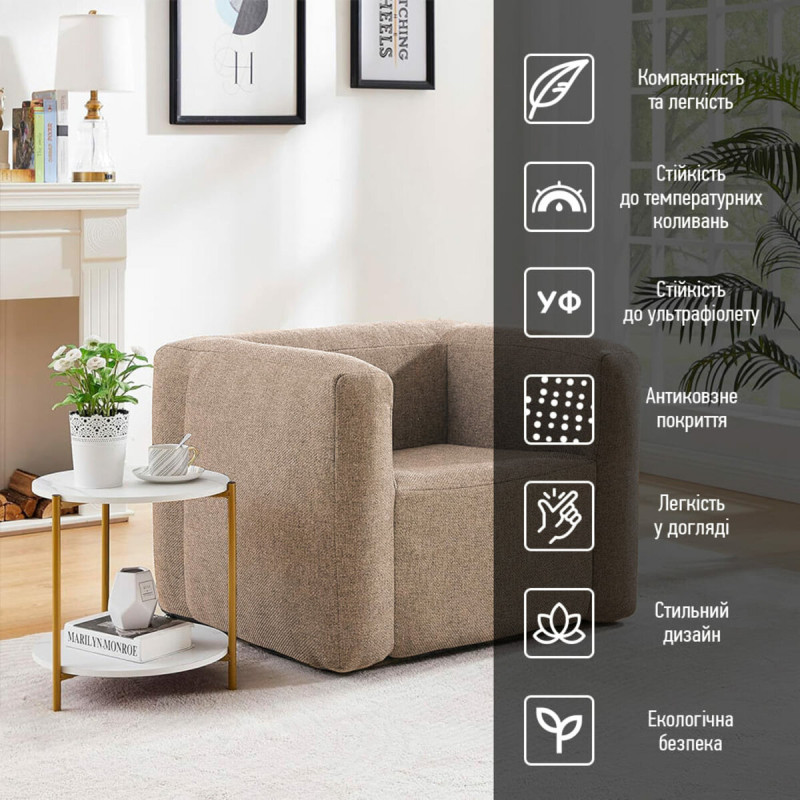 Надувне крісло коричневе Sticker wall SW-00002291 Надувні меблі Sticker wall поєднують стильний дизайн та функціональність. Її основа виконана з міцного поліуретану, а верхній шар виготовлений із поліестерової мішковини з приємною текстурою та високою стійкістю до пошкоджень. У порівнянні з традиційними меблями, надувні вироби значно легші та зручніші у транспортуванні: у здутому стані вони займають мінімум простору, що робить їх ідеальним вибором для переїздів чи оновлення інтер'єру. Розміри в надувному та здутому вигляді (упаковка пакет + коробка): короб - 200x430x520 мм. Допустима похибка розмірів меблів через температурні коливання та ступінь надутості може становити до ±5%. Комплектація: крісло – 1 шт; компресійний мішок – 1 шт; насос – 1 шт; гофрований шланг – 1 шт; насадка в асортименті – 5 шт. Матеріал 1. Надувний каркас меблів (TPU) Каркас меблів виконаний з TPU - термопластичного поліуретану, відомого своєю міцністю, еластичністю та стійкістю до механічних пошкоджень. Завдяки унікальній молекулярній структурі матеріал поєднує гнучкість та довговічність. TPU стійкий до впливу жирів, масел, ультрафіолетового випромінювання та несприятливих погодних умов, що робить його чудовим вибором для використання на вулиці. Він має високу зносостійкість і водонепроникність. Робоча температура матеріалу варіюється від -40 до +80 градусів, причому його характеристики залишаються постійними. 2. Текстильний шар із поліестеру Верхній шар меблів виготовлений з поліестеру з лляним плетенням, який приємний на дотик і екологічний. Матеріал простий у догляді і відрізняється високою зносостійкістю - до 40 000 циклів за тестом Мартіндейла, що забезпечує довговічність навіть за інтенсивної експлуатації. Тканина стійка до плям, плісняви та ультрафіолетового випромінювання, що запобігає її вигоранню та зберігає привабливий зовнішній вигляд протягом багатьох років. 3. Нейлонова тканина з гумовими точками Основа меблів, що контактує з поверхнею, виконана з міцної нейлонової тканини з термопластичними гумовими точками (TPR), які забезпечують антиковзкий ефект. Цей матеріал вологостійкий, зносостійкий та зберігає свої характеристики навіть при різких перепадах температури. Нейлон у поєднанні з гумовими точками підвищує надійність і запобігає ковзанню, що робить меблі безпечними та довговічними в будь-яких умовах експлуатації. Застосування Надувні меблі - це зручне та універсальне рішення як для дому, так і для використання на вулиці. Вона ідеально підходить для організації зон відпочинку в квартирах, офісах, кафе, виставкових павільйонах або лаунж-просторах. Завдяки своїй легкості, мобільності та простоті догляду, такі меблі стануть відмінним вибором для подорожей або тимчасового використання, наприклад, при прийомі гостей або під час ремонту. Її також можна використовувати для облаштування комфортних зон на фестивалях, виставках, вечірках та інших заходах, створюючи стильну та функціональну атмосферу у будь-яких умовах. Основні переваги надувних меблів 1. Легкість та компактність. Надувні меблі мають невелику вагу і легко складаються до компактних розмірів після здування. Це робить її зручною для зберігання та транспортування – вона поміститься у багажник автомобіля чи шафу. Особливо актуальна для невеликих просторів. 2. Міцність та довговічність. Виготовлені і
