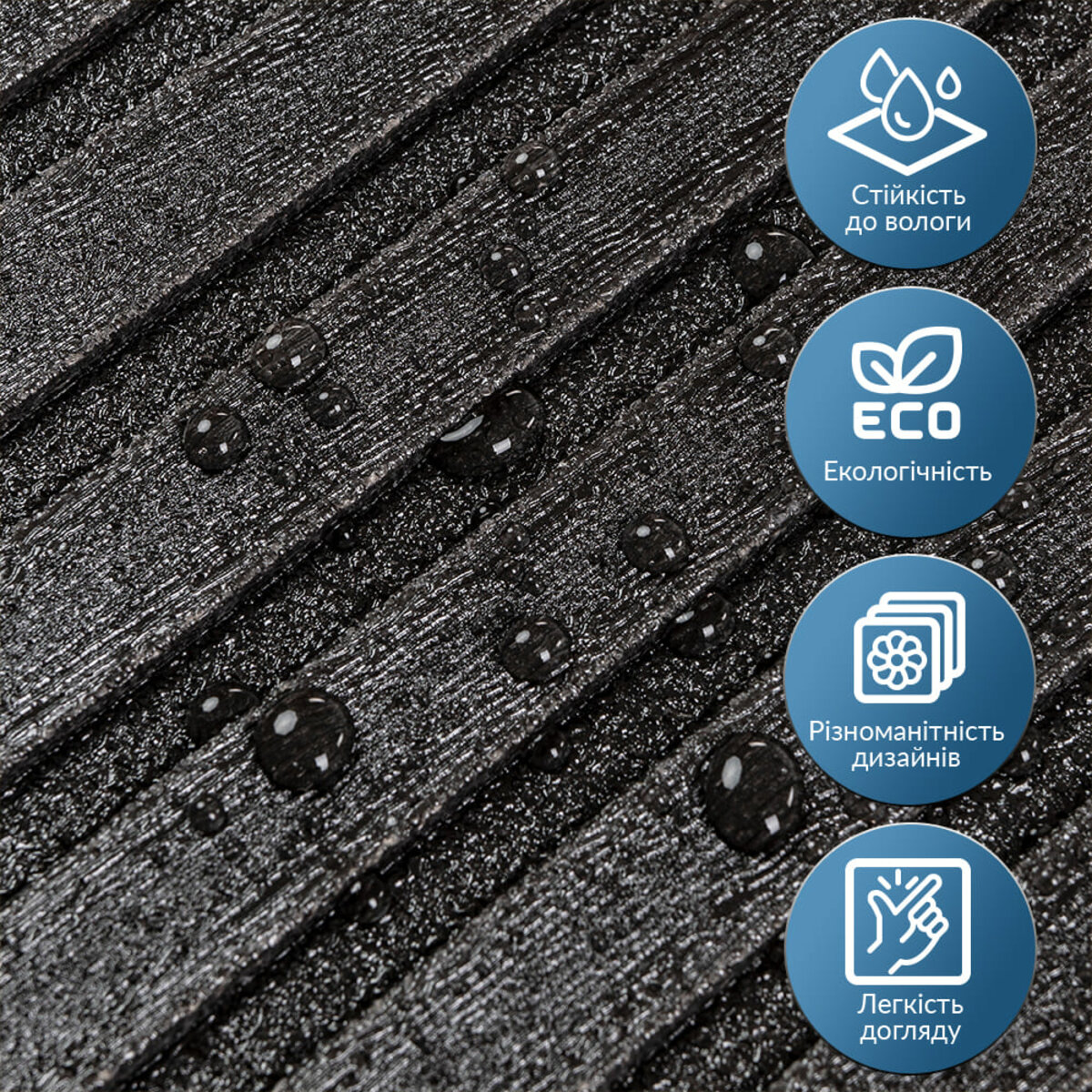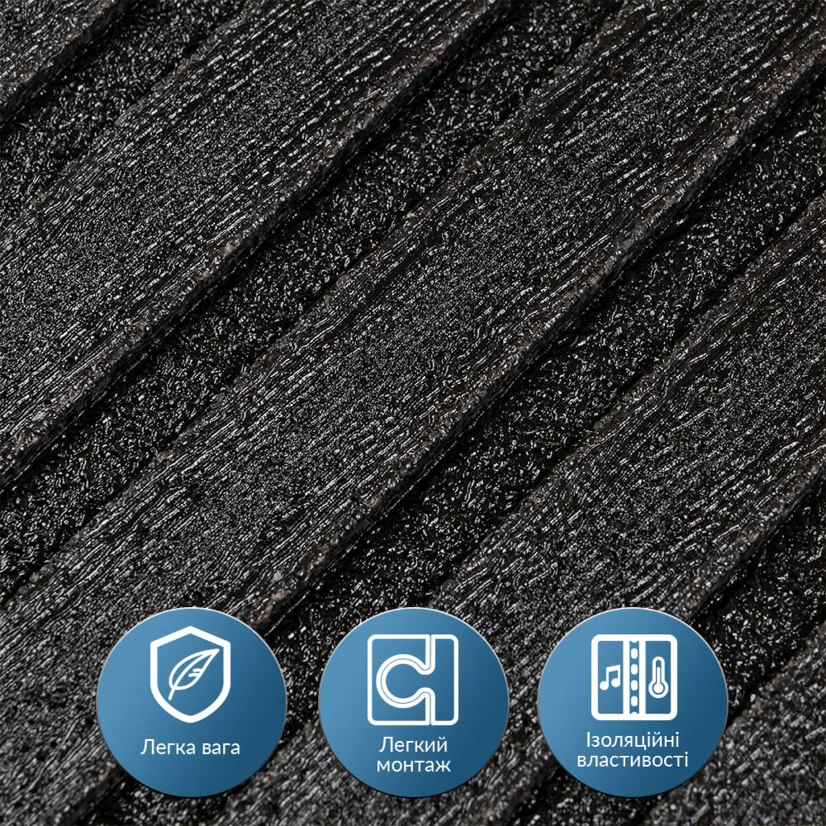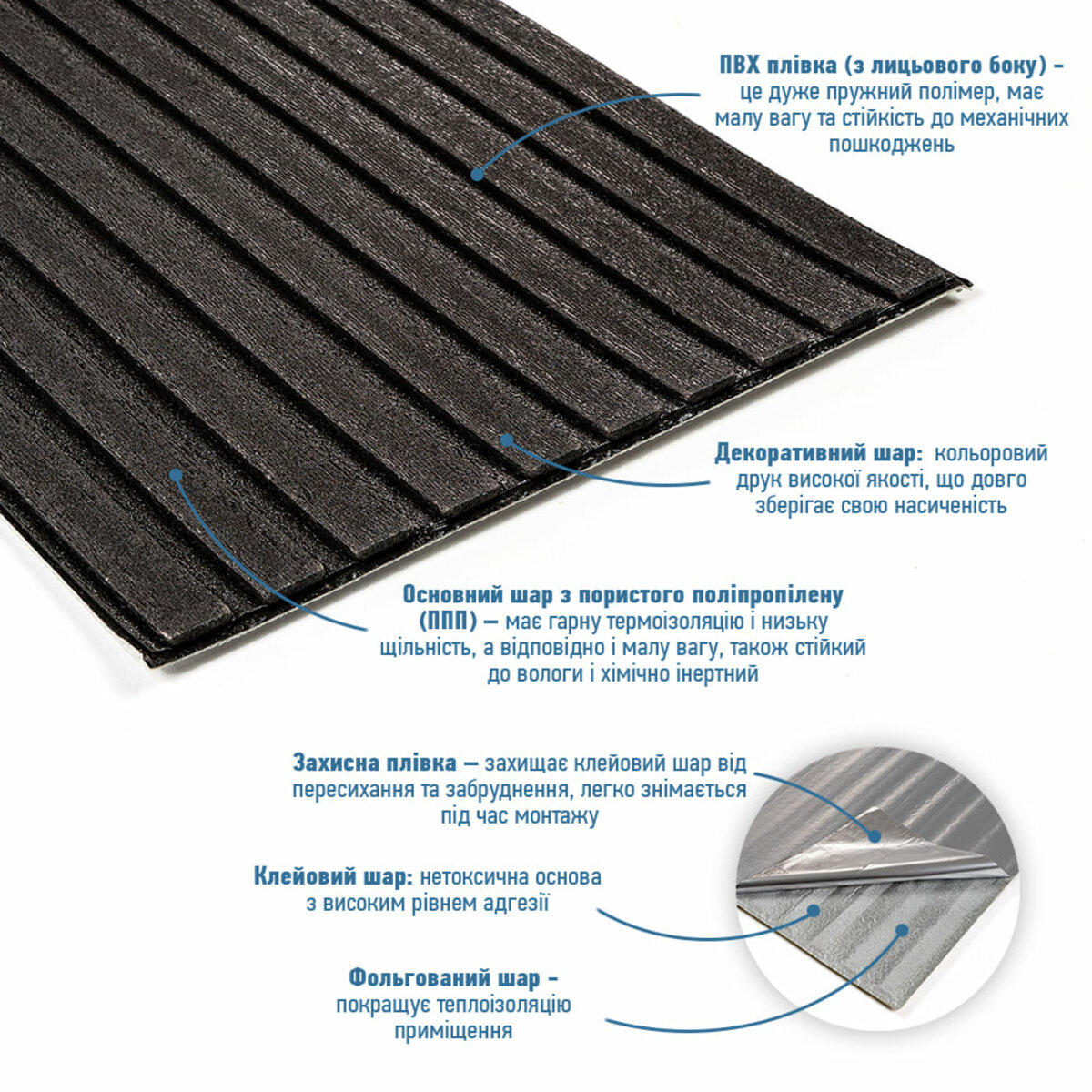 Панель-рейка у рулоні Sticker wall чорний 2900*350*6мм (D) SW-00002070 Самоклеюча панель-рейка в рулоні – це сучасне декоративне покриття для стін, виготовлене з легкого та міцного пористого поліпропілену (ППП). Відмінною рисою панелей є рельєфна текстура, що нагадує деревину, доступна в різноманітній палітрі кольорів. Завдяки наявності клейового шару встановлення таких панелей не потребує додаткових матеріалів чи інструментів. Самоклеюча панель-рейка включає кілька шарів, кожен з яких виконує певні функції: 1. Лицьова сторона (ПВХ плівка) Це полімерний матеріал, основою якого є довгі молекулярні кола вінілхлориду з додаванням атомів хлору. Хімічна структура забезпечує високу стійкість до дії різних речовин. Завдяки аморфній кристалічній решітці ПВХ має легкість і високу пружність. 2. Декоративний шар Є якісним кольоровим друком, який зберігає яскравість і насиченість кольору протягом тривалого часу. 3. Основний шар (пористий поліпропілен) Виготовлений з термопластичного полімеру з молекулярною структурою, що включає одиниці пропілену, що повторюються. Його комірчаста структура забезпечує відмінні термоізоляційні властивості, низьку щільність та невелику вагу. Поліпропілен стійкий до вологи та хімічно нейтральний, що підвищує його довговічність. 4. Клейовий шар Це безпечне та нетоксичне покриття з високим ступенем адгезії, що забезпечує надійне кріплення панелі. 5. Захисний папір Служить для запобігання забрудненню та висиханню клейового шару. Легко видаляється при встановленні, що спрощує монтаж. Ключові переваги: - Ідеальні для обробки приміщень: підходять для внутрішнього декорування та теплоізоляції стін у житлових та комерційних будівлях. - Легкість матеріалу: невелика вага спрощує транспортування, роблячи його більш економічним, а також полегшує процес встановлення. - Відмінні ізоляційні властивості: пориста структура забезпечує панелі хорошу тепло- та звукоізоляцію. - Простота монтажу: вбудований клейовий шар дозволяє встановити панелі без використання додаткових матеріалів. - Гнучкість та надійність: панелі легко адаптуються навіть до нерівних поверхонь, зберігаючи при цьому міцність та довговічність. - Вологостійкість та стійкість до хімії: пористий поліпропілен захищений ПВХ-плівкою, що робить панелі стійкими до вологи та дозволяє їх очищати звичайними побутовими засобами (за винятком сильно абразивних щіток). - Екологічність: поліпропілен не має запаху, безпечний для здоров'я та навколишнього середовища. Матеріал можна переробляти вдруге, що сприяє стійкому використанню ресурсів. Як розрахувати необхідну кількість матеріалу: 1. Виміряйте параметри поверхні. Зніміть виміри довжини та ширини кожної поверхні, яку плануєте обклеювати, у метрах. 2. Обчисліть площу. Помножте довжину на ширину кожної поверхні та складіть отримані значення, щоб визначити загальну площу. Наприклад: довжина стіни – 3,7 м, ширина – 2,7 м. Площа: 3,7 x 2,7=9,99 кв.м. 3. Розрахуйте кількість панелей. Розділіть загальну площу на площу однієї панелі. Якщо площа панелі становить 1,015 кв.м (350 x 2750 мм), то розрахунок буде таким: 9,99/1,015 = 9,84. Результат завжди округляйте у велику сторону: у цьому випадку це 10 панелей. 4. Додати запас. Для урахування можливих відходів при підгонці матеріалу рекомендується додати 1-2 додаткові панелі. Такий підхід забезпечить достатню кі