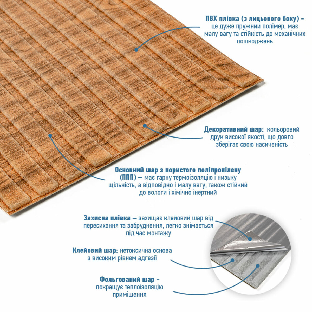 Панель-рейка у рулоні Sticker wall дерево 2900*350*6мм (D) SW-00002073 Самоклеюча панель-рейка в рулоні – це сучасне декоративне покриття для стін, виготовлене з легкого та міцного пористого поліпропілену (ППП). Відмінною рисою панелей є рельєфна текстура, що нагадує деревину, доступна в різноманітній палітрі кольорів. Завдяки наявності клейового шару встановлення таких панелей не потребує додаткових матеріалів чи інструментів. Самоклеюча панель-рейка включає кілька шарів, кожен з яких виконує певні функції: 1. Лицьова сторона (ПВХ плівка) Це полімерний матеріал, основою якого є довгі молекулярні кола вінілхлориду з додаванням атомів хлору. Хімічна структура забезпечує високу стійкість до дії різних речовин. Завдяки аморфній кристалічній решітці ПВХ має легкість і високу пружність. 2. Декоративний шар Є якісним кольоровим друком, який зберігає яскравість і насиченість кольору протягом тривалого часу. 3. Основний шар (пористий поліпропілен) Виготовлений з термопластичного полімеру з молекулярною структурою, що включає одиниці пропілену, що повторюються. Його комірчаста структура забезпечує відмінні термоізоляційні властивості, низьку щільність та невелику вагу. Поліпропілен стійкий до вологи та хімічно нейтральний, що підвищує його довговічність. 4. Клейовий шар Це безпечне та нетоксичне покриття з високим ступенем адгезії, що забезпечує надійне кріплення панелі. 5. Захисний папір Служить для запобігання забрудненню та висиханню клейового шару. Легко видаляється при встановленні, що спрощує монтаж. Ключові переваги: - Ідеальні для обробки приміщень: підходять для внутрішнього декорування та теплоізоляції стін у житлових та комерційних будівлях. - Легкість матеріалу: невелика вага спрощує транспортування, роблячи його більш економічним, а також полегшує процес встановлення. - Відмінні ізоляційні властивості: пориста структура забезпечує панелі хорошу тепло- та звукоізоляцію. - Простота монтажу: вбудований клейовий шар дозволяє встановити панелі без використання додаткових матеріалів. - Гнучкість та надійність: панелі легко адаптуються навіть до нерівних поверхонь, зберігаючи при цьому міцність та довговічність. - Вологостійкість та стійкість до хімії: пористий поліпропілен захищений ПВХ-плівкою, що робить панелі стійкими до вологи та дозволяє їх очищати звичайними побутовими засобами (за винятком сильно абразивних щіток). - Екологічність: поліпропілен не має запаху, безпечний для здоров'я та навколишнього середовища. Матеріал можна переробляти вдруге, що сприяє стійкому використанню ресурсів. Як розрахувати необхідну кількість матеріалу: 1. Виміряйте параметри поверхні. Зніміть виміри довжини та ширини кожної поверхні, яку плануєте обклеювати, у метрах. 2. Обчисліть площу. Помножте довжину на ширину кожної поверхні та складіть отримані значення, щоб визначити загальну площу. Наприклад: довжина стіни – 3,7 м, ширина – 2,7 м. Площа: 3,7 x 2,7=9,99 кв.м. 3. Розрахуйте кількість панелей. Розділіть загальну площу на площу однієї панелі. Якщо площа панелі становить 1,015 кв.м (350 x 2750 мм), то розрахунок буде таким: 9,99/1,015 = 9,84. Результат завжди округляйте у велику сторону: у цьому випадку це 10 панелей. 4. Додати запас. Для урахування можливих відходів при підгонці матеріалу рекомендується додати 1-2 додаткові панелі. Такий підхід забезпечить достатню кі