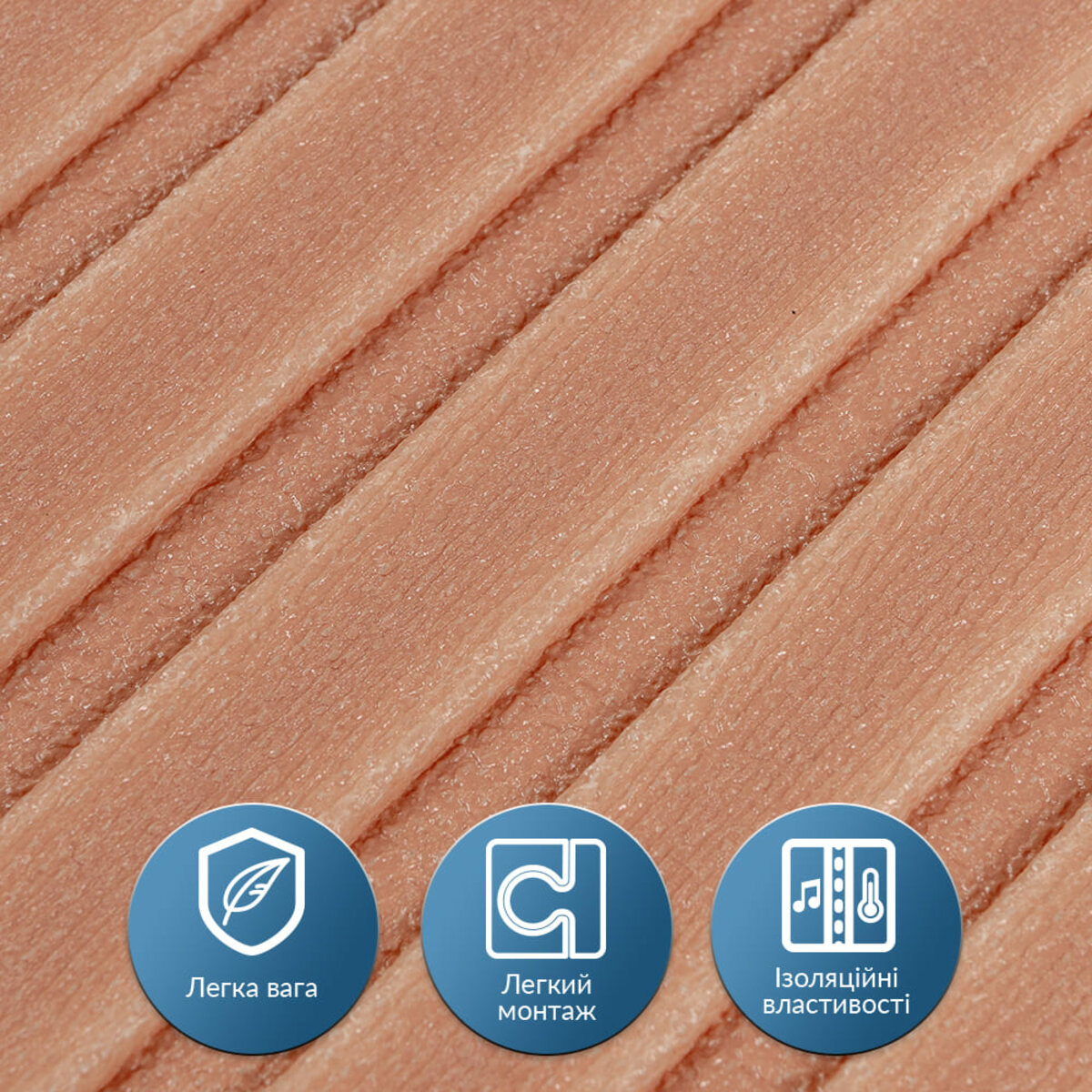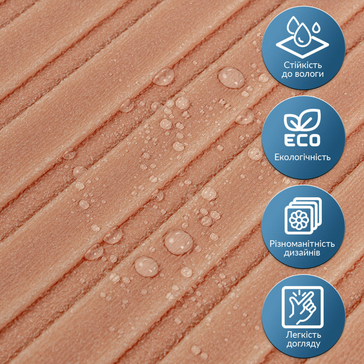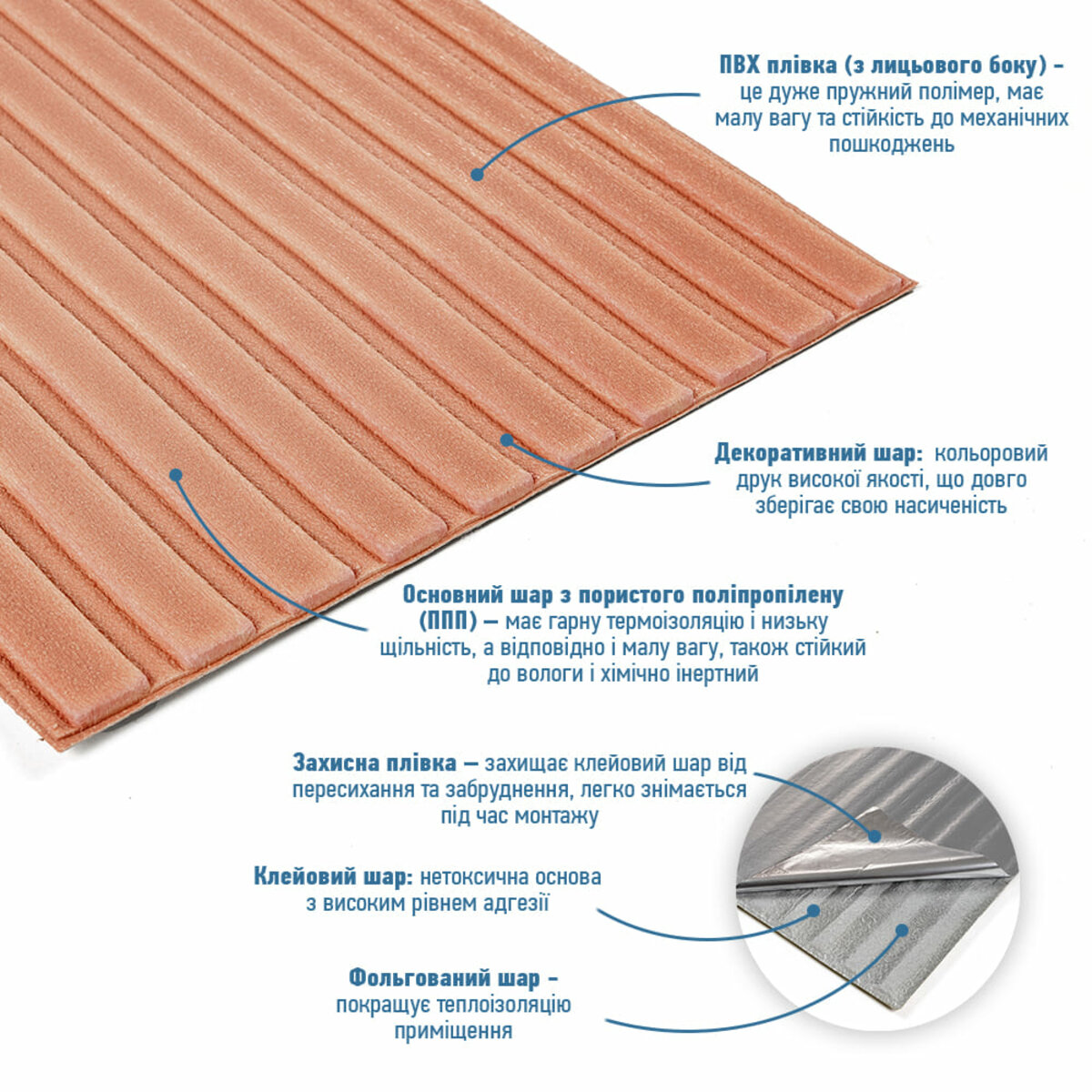 Панель-рейка у рулоні Sticker wall пудра 2900*350*6мм (D) SW-00002074 Самоклеюча панель-рейка в рулоні – це сучасне декоративне покриття для стін, виготовлене з легкого та міцного пористого поліпропілену (ППП). Відмінною рисою панелей є рельєфна текстура, що нагадує деревину, доступна в різноманітній палітрі кольорів. Завдяки наявності клейового шару встановлення таких панелей не потребує додаткових матеріалів чи інструментів. Самоклеюча панель-рейка включає кілька шарів, кожен з яких виконує певні функції: 1. Лицьова сторона (ПВХ плівка) Це полімерний матеріал, основою якого є довгі молекулярні кола вінілхлориду з додаванням атомів хлору. Хімічна структура забезпечує високу стійкість до дії різних речовин. Завдяки аморфній кристалічній решітці ПВХ має легкість і високу пружність. 2. Декоративний шар Є якісним кольоровим друком, який зберігає яскравість і насиченість кольору протягом тривалого часу. 3. Основний шар (пористий поліпропілен) Виготовлений з термопластичного полімеру з молекулярною структурою, що включає одиниці пропілену, що повторюються. Його комірчаста структура забезпечує відмінні термоізоляційні властивості, низьку щільність та невелику вагу. Поліпропілен стійкий до вологи та хімічно нейтральний, що підвищує його довговічність. 4. Клейовий шар Це безпечне та нетоксичне покриття з високим ступенем адгезії, що забезпечує надійне кріплення панелі. 5. Захисний папір Служить для запобігання забрудненню та висиханню клейового шару. Легко видаляється при встановленні, що спрощує монтаж. Ключові переваги: - Ідеальні для обробки приміщень: підходять для внутрішнього декорування та теплоізоляції стін у житлових та комерційних будівлях. - Легкість матеріалу: невелика вага спрощує транспортування, роблячи його більш економічним, а також полегшує процес встановлення. - Відмінні ізоляційні властивості: пориста структура забезпечує панелі хорошу тепло- та звукоізоляцію. - Простота монтажу: вбудований клейовий шар дозволяє встановити панелі без використання додаткових матеріалів. - Гнучкість та надійність: панелі легко адаптуються навіть до нерівних поверхонь, зберігаючи при цьому міцність та довговічність. - Вологостійкість та стійкість до хімії: пористий поліпропілен захищений ПВХ-плівкою, що робить панелі стійкими до вологи та дозволяє їх очищати звичайними побутовими засобами (за винятком сильно абразивних щіток). - Екологічність: поліпропілен не має запаху, безпечний для здоров'я та навколишнього середовища. Матеріал можна переробляти вдруге, що сприяє стійкому використанню ресурсів. Як розрахувати необхідну кількість матеріалу: 1. Виміряйте параметри поверхні. Зніміть виміри довжини та ширини кожної поверхні, яку плануєте обклеювати, у метрах. 2. Обчисліть площу. Помножте довжину на ширину кожної поверхні та складіть отримані значення, щоб визначити загальну площу. Наприклад: довжина стіни – 3,7 м, ширина – 2,7 м. Площа: 3,7 x 2,7=9,99 кв.м. 3. Розрахуйте кількість панелей. Розділіть загальну площу на площу однієї панелі. Якщо площа панелі становить 1,015 кв.м (350 x 2750 мм), то розрахунок буде таким: 9,99/1,015 = 9,84. Результат завжди округляйте у велику сторону: у цьому випадку це 10 панелей. 4. Додати запас. Для урахування можливих відходів при підгонці матеріалу рекомендується додати 1-2 додаткові панелі. Такий підхід забезпечить достатню кіл