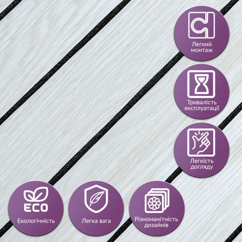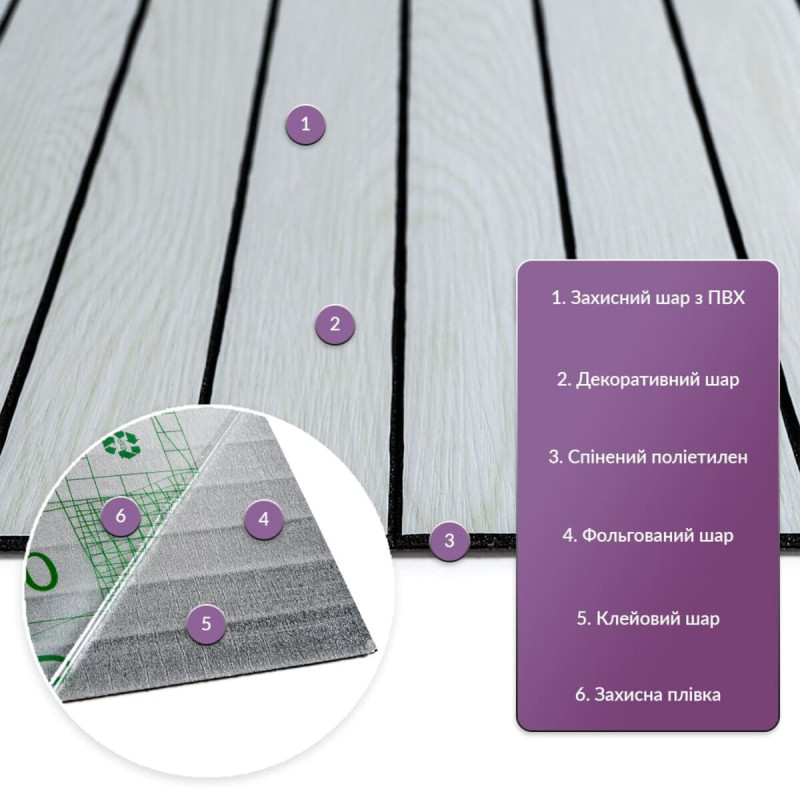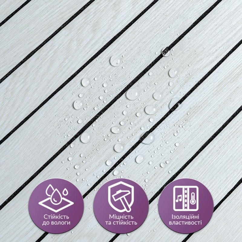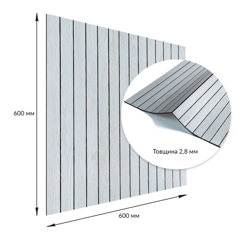 Покриття настінне вінілове 3D рейки Sticker wall 600*600*2,8мм (D) SW-00002194 Вінілова гнучка рейка — це сучасний декоративний матеріал, що використовується для внутрішнього оздоблення стін. Він легко монтується завдяки клейовій основі та доступний у різних дизайнах, що імітують натуральні матеріали, що робить його універсальним для різноманітних інтер'єрних рішень. Основні характеристики: - Розмір: 600x600x2,8 мм. - Площа покриття: 0,36 кв.м. на плитку. - Фактура: рельєфна, з матовою поверхнею, що імітує дерев'яні рейки. Склад: 1. Захисний шар ПВХ – забезпечує захист від дрібних механічних пошкоджень, запобігає стирання та вицвітання завдяки УФ-захисту, зберігає насиченість кольору. ПВХ стійкий до впливу хімічних речовин, має високу пружність і легкість. 2. Декоративний шар — кольорова плівка з високою роздільною здатністю, що імітує текстуру природних матеріалів завдяки чіткому та детальному зображенню. 3. Спінений поліетилен (РЕ) – полімер із закритою комірчастою структурою, який відрізняється легкістю, гнучкістю, має хороші тепло- та звукоізоляційні характеристики, а також стійкість до вологи. 4. Фольгований шар – відбиває теплові хвилі, що допомагає знизити тепловтрати та підвищити енергоефективність приміщення. 5. Клейовий шар – основа з високою адгезією, безпечна для здоров'я та забезпечує надійне кріплення. 6. Захисна плівка – запобігає висиханню та забрудненням клейового шару, легко видаляється перед монтажем. Температурні умови: Вінілова рейка стійка до впливу високих температур, проте при встановленні поблизу відкритого вогню, наприклад, на кухні, рекомендується монтувати її на відстані 30-50 см від джерел тепла. Область застосування: Матеріал використовується для внутрішнього оздоблення житлових та комерційних приміщень. Вінілові рейки підходять для стін у кухнях, ванних кімнатах, віталень, дитячих, спальнях та передпокоях, а також для офісів, магазинів, салонів краси, фітнес-центрів, готелів, ресторанів та кафе. Крім того, вони можуть застосовуватись для декорування меблів, дверей, підвіконь та інших рівних поверхонь. Переваги та особливості вінілових рейок: • Простота монтажу: Вінілові рейки оснащені клейовим шаром, що робить їхню установку швидкою та легкою. Додаткові матеріали не потрібні, а рейки легко ріжуться ножем або ножицями та укладаються встик. При встановленні на стіни відсоток обрізків мінімальний. • Вологостійкість: Вінілові рейки стійкі до впливу вологи, тому ідеально підходять для використання у таких приміщеннях, як ванні кімнати та кухні. Вони не схильні до набухання і добре протистоять пару і цвілі. • Довговічність: Рейки стійкі до зносу, механічних пошкоджень та подряпин, що гарантує їх довгу службу, навіть в умовах інтенсивної експлуатації. • Естетична різноманітність: Представлені в широкому асортименті текстур, кольорів та візерунків, що імітують натуральні матеріали. Це дозволяє підібрати варіант для будь-якого інтер'єру. Їх можна монтувати горизонтально, вертикально чи під кутом, створюючи цікаві декоративні ефекти. • Простота догляду: Вінілові рейки легко чистяться, не вимагають спеціальних миючих засобів та не вбирають бруд. • Ізоляційні властивості: Рейки мають хороші тепло- та звукоізоляційні характеристики, що робить їх відмінним вибором для приміщень, де важливий комфорт у плані тепла та акусти
