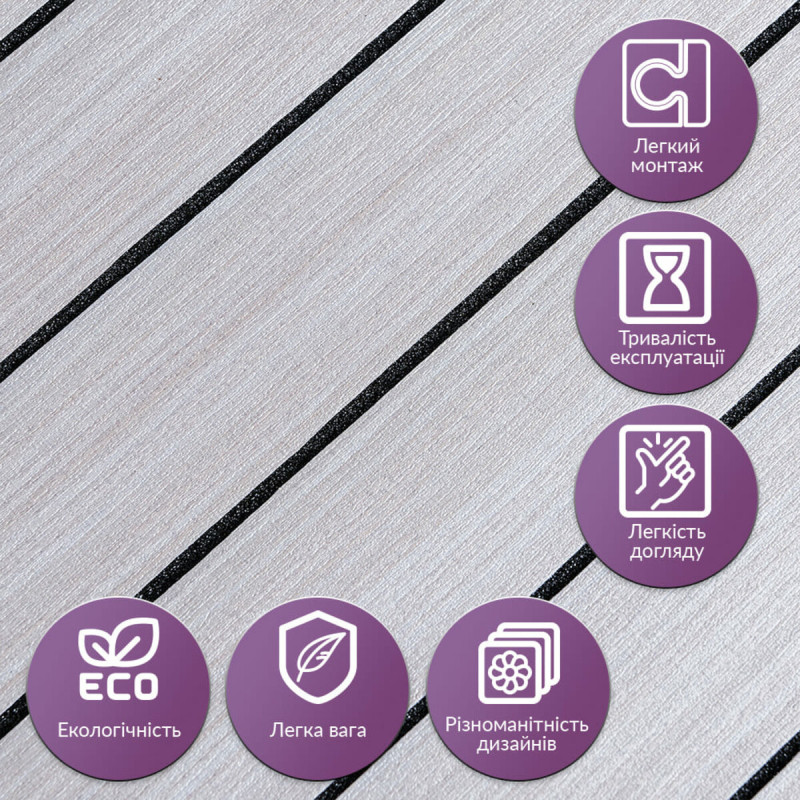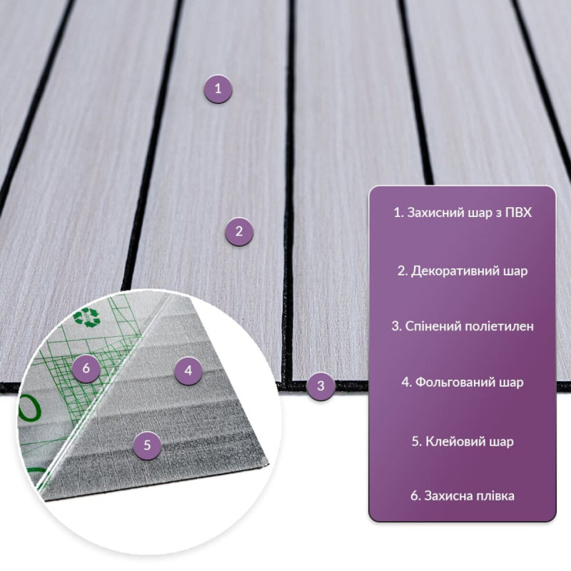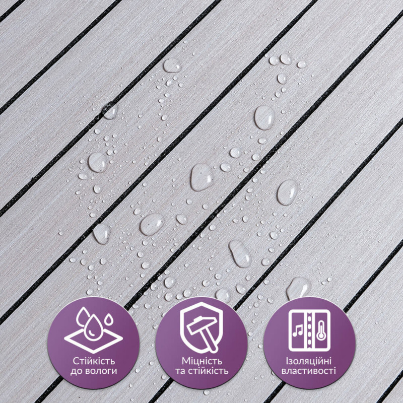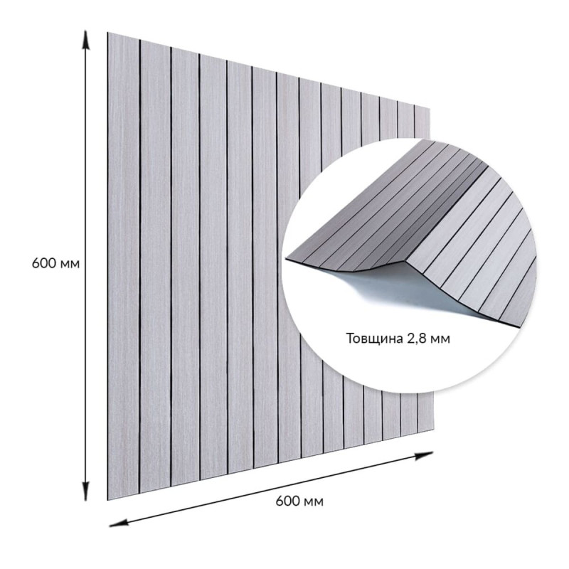 Покриття настінне вінілове 3D рейки Sticker wall 600*600*2,8мм (D) SW-00002198 Вінілова гнучка рейка — це сучасний декоративний матеріал, що використовується для внутрішнього оздоблення стін. Він легко монтується завдяки клейовій основі та доступний у різних дизайнах, що імітують натуральні матеріали, що робить його універсальним для різноманітних інтер'єрних рішень. Основні характеристики: - Розмір: 600x600x2,8 мм. - Площа покриття: 0,36 кв.м. на плитку. - Фактура: рельєфна, з матовою поверхнею, що імітує дерев'яні рейки. Склад: 1. Захисний шар ПВХ – забезпечує захист від дрібних механічних пошкоджень, запобігає стирання та вицвітання завдяки УФ-захисту, зберігає насиченість кольору. ПВХ стійкий до впливу хімічних речовин, має високу пружність і легкість. 2. Декоративний шар — кольорова плівка з високою роздільною здатністю, що імітує текстуру природних матеріалів завдяки чіткому та детальному зображенню. 3. Спінений поліетилен (РЕ) – полімер із закритою комірчастою структурою, який відрізняється легкістю, гнучкістю, має хороші тепло- та звукоізоляційні характеристики, а також стійкість до вологи. 4. Фольгований шар – відбиває теплові хвилі, що допомагає знизити тепловтрати та підвищити енергоефективність приміщення. 5. Клейовий шар – основа з високою адгезією, безпечна для здоров'я та забезпечує надійне кріплення. 6. Захисна плівка – запобігає висиханню та забрудненням клейового шару, легко видаляється перед монтажем. Температурні умови: Вінілова рейка стійка до впливу високих температур, проте при встановленні поблизу відкритого вогню, наприклад, на кухні, рекомендується монтувати її на відстані 30-50 см від джерел тепла. Область застосування: Матеріал використовується для внутрішнього оздоблення житлових та комерційних приміщень. Вінілові рейки підходять для стін у кухнях, ванних кімнатах, віталень, дитячих, спальнях та передпокоях, а також для офісів, магазинів, салонів краси, фітнес-центрів, готелів, ресторанів та кафе. Крім того, вони можуть застосовуватись для декорування меблів, дверей, підвіконь та інших рівних поверхонь. Переваги та особливості вінілових рейок: • Простота монтажу: Вінілові рейки оснащені клейовим шаром, що робить їхню установку швидкою та легкою. Додаткові матеріали не потрібні, а рейки легко ріжуться ножем або ножицями та укладаються встик. При встановленні на стіни відсоток обрізків мінімальний. • Вологостійкість: Вінілові рейки стійкі до впливу вологи, тому ідеально підходять для використання у таких приміщеннях, як ванні кімнати та кухні. Вони не схильні до набухання і добре протистоять пару і цвілі. • Довговічність: Рейки стійкі до зносу, механічних пошкоджень та подряпин, що гарантує їх довгу службу, навіть в умовах інтенсивної експлуатації. • Естетична різноманітність: Представлені в широкому асортименті текстур, кольорів та візерунків, що імітують натуральні матеріали. Це дозволяє підібрати варіант для будь-якого інтер'єру. Їх можна монтувати горизонтально, вертикально чи під кутом, створюючи цікаві декоративні ефекти. • Простота догляду: Вінілові рейки легко чистяться, не вимагають спеціальних миючих засобів та не вбирають бруд. • Ізоляційні властивості: Рейки мають хороші тепло- та звукоізоляційні характеристики, що робить їх відмінним вибором для приміщень, де важливий комфорт у плані тепла та акусти