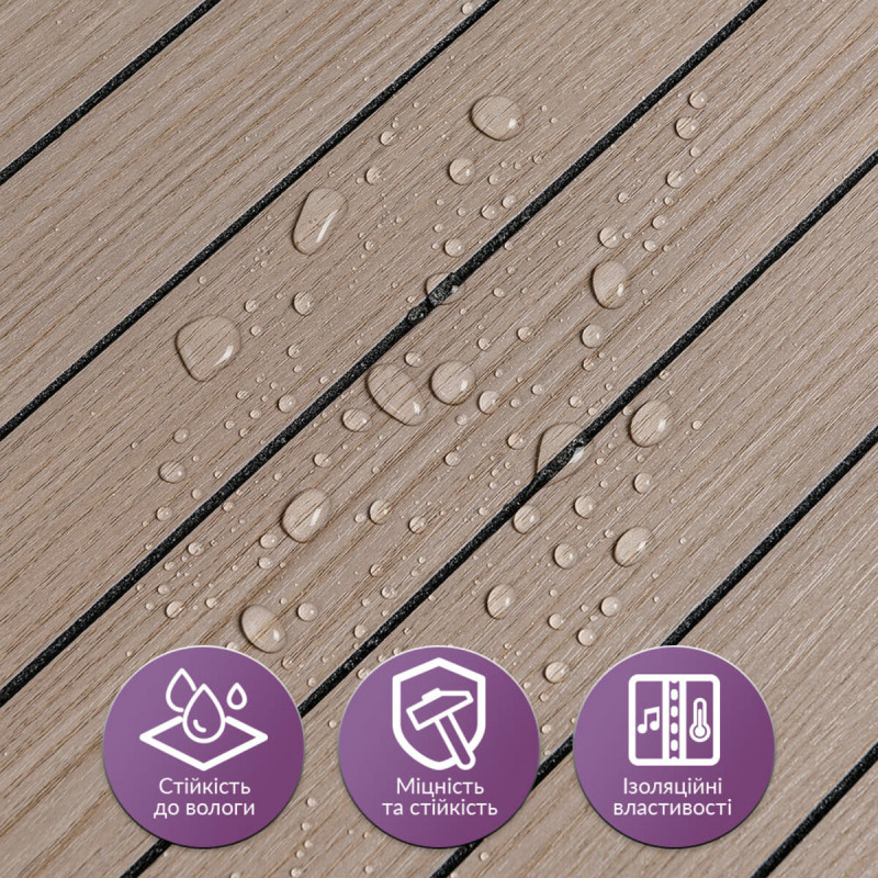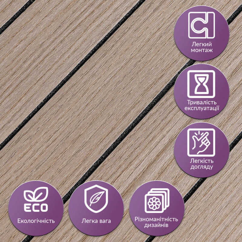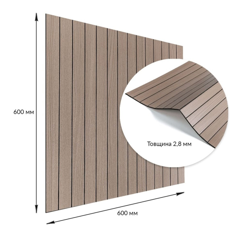 Покриття настінне вінілове 3D рейки Sticker wall 600*600*2,8мм (D) SW-00002202 Вінілова гнучка рейка — це сучасний декоративний матеріал, що використовується для внутрішнього оздоблення стін. Він легко монтується завдяки клейовій основі та доступний у різних дизайнах, що імітують натуральні матеріали, що робить його універсальним для різноманітних інтер'єрних рішень. Основні характеристики: - Розмір: 600x600x2,8 мм. - Площа покриття: 0,36 кв.м. на плитку. - Фактура: рельєфна, з матовою поверхнею, що імітує дерев'яні рейки. Склад: 1. Захисний шар ПВХ – забезпечує захист від дрібних механічних пошкоджень, запобігає стирання та вицвітання завдяки УФ-захисту, зберігає насиченість кольору. ПВХ стійкий до впливу хімічних речовин, має високу пружність і легкість. 2. Декоративний шар — кольорова плівка з високою роздільною здатністю, що імітує текстуру природних матеріалів завдяки чіткому та детальному зображенню. 3. Спінений поліетилен (РЕ) – полімер із закритою комірчастою структурою, який відрізняється легкістю, гнучкістю, має хороші тепло- та звукоізоляційні характеристики, а також стійкість до вологи. 4. Фольгований шар – відбиває теплові хвилі, що допомагає знизити тепловтрати та підвищити енергоефективність приміщення. 5. Клейовий шар – основа з високою адгезією, безпечна для здоров'я та забезпечує надійне кріплення. 6. Захисна плівка – запобігає висиханню та забрудненням клейового шару, легко видаляється перед монтажем. Температурні умови: Вінілова рейка стійка до впливу високих температур, проте при встановленні поблизу відкритого вогню, наприклад, на кухні, рекомендується монтувати її на відстані 30-50 см від джерел тепла. Область застосування: Матеріал використовується для внутрішнього оздоблення житлових та комерційних приміщень. Вінілові рейки підходять для стін у кухнях, ванних кімнатах, віталень, дитячих, спальнях та передпокоях, а також для офісів, магазинів, салонів краси, фітнес-центрів, готелів, ресторанів та кафе. Крім того, вони можуть застосовуватись для декорування меблів, дверей, підвіконь та інших рівних поверхонь. Переваги та особливості вінілових рейок: • Простота монтажу: Вінілові рейки оснащені клейовим шаром, що робить їхню установку швидкою та легкою. Додаткові матеріали не потрібні, а рейки легко ріжуться ножем або ножицями та укладаються встик. При встановленні на стіни відсоток обрізків мінімальний. • Вологостійкість: Вінілові рейки стійкі до впливу вологи, тому ідеально підходять для використання у таких приміщеннях, як ванні кімнати та кухні. Вони не схильні до набухання і добре протистоять пару і цвілі. • Довговічність: Рейки стійкі до зносу, механічних пошкоджень та подряпин, що гарантує їх довгу службу, навіть в умовах інтенсивної експлуатації. • Естетична різноманітність: Представлені в широкому асортименті текстур, кольорів та візерунків, що імітують натуральні матеріали. Це дозволяє підібрати варіант для будь-якого інтер'єру. Їх можна монтувати горизонтально, вертикально чи під кутом, створюючи цікаві декоративні ефекти. • Простота догляду: Вінілові рейки легко чистяться, не вимагають спеціальних миючих засобів та не вбирають бруд. • Ізоляційні властивості: Рейки мають хороші тепло- та звукоізоляційні характеристики, що робить їх відмінним вибором для приміщень, де важливий комфорт у плані тепла та акусти