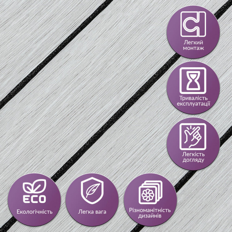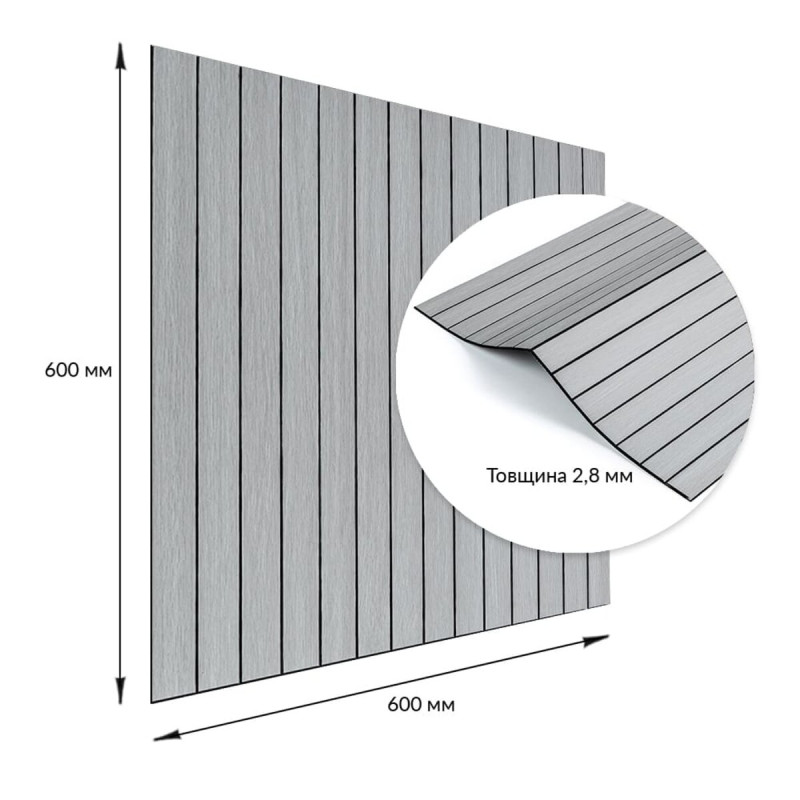 Вінілова гнучка рейка — це сучасний декоративний матеріал, що використовується для внутрішнього оздоблення стін. Він легко монтується завдяки клейовій основі та доступний у різних дизайнах, що імітують натуральні матеріали, що робить його універсальним для різноманітних інтер'єрних рішень. Основні характеристики: - Розмір: 600x600x2,8 мм. - Площа покриття: 0,36 кв.м. - Фактура: рельєфна, з матовою поверхнею, що імітує дерев'яні рейки. Склад: 1. Захисний шар ПВХ – забезпечує захист від дрібних механічних пошкоджень, запобігає стирання та вицвітання завдяки УФ-захисту, зберігає насиченість кольору. ПВХ стійкий до впливу хімічних речовин, має високу пружність і легкість. 2. Декоративний шар — кольорова плівка з високою роздільною здатністю, що імітує текстуру природних матеріалів завдяки чіткому та детальному зображенню. 3. Спінений поліетилен (РЕ) – полімер із закритою комірчастою структурою, який відрізняється легкістю, гнучкістю, має хороші тепло- та звукоізоляційні характеристики, а також стійкість до вологи. 4. Фольгований шар – відбиває теплові хвилі, що допомагає знизити тепловтрати та підвищити енергоефективність приміщення. 5. Клейовий шар – основа з високою адгезією, безпечна для здоров'я та забезпечує надійне кріплення. 6. Захисна плівка – запобігає висиханню та забрудненням клейового шару, легко видаляється перед монтажем. Температурні умови: Вінілова рейка стійка до впливу високих температур, проте при встановленні поблизу відкритого вогню, наприклад, на кухні, рекомендується монтувати її на відстані 30-50 см від джерел тепла. Область застосування: Матеріал використовується для внутрішнього оздоблення житлових та комерційних приміщень. Вінілові рейки підходять для стін у кухнях, ванних кімнатах, віталень, дитячих, спальнях та передпокоях, а також для офісів, магазинів, салонів краси, фітнес-центрів, готелів, ресторанів та кафе. Крім того, вони можуть застосовуватись для декорування меблів, дверей, підвіконь та інших рівних поверхонь. Переваги та особливості вінілових рейок: • Простота монтажу: Вінілові рейки оснащені клейовим шаром, що робить їхню установку швидкою та легкою. Додаткові матеріали не потрібні, а рейки легко ріжуться ножем або ножицями та укладаються встик. При встановленні на стіни відсоток обрізків мінімальний. • Вологостійкість: Вінілові рейки стійкі до впливу вологи, тому ідеально підходять для використання у таких приміщеннях, як ванні кімнати та кухні. Вони не схильні до набухання і добре протистоять пару і цвілі. • Довговічність: Рейки стійкі до зносу, механічних пошкоджень та подряпин, що гарантує їх довгу службу, навіть в умовах інтенсивної експлуатації. • Естетична різноманітність: Представлені в широкому асортименті текстур, кольорів та візерунків, що імітують натуральні матеріали. Це дозволяє підібрати варіант для будь-якого інтер'єру. Їх можна монтувати горизонтально, вертикально чи під кутом, створюючи цікаві декоративні ефекти. • Простота догляду: Вінілові рейки легко чистяться, не вимагають спеціальних миючих засобів та не вбирають бруд. • Ізоляційні властивості: Рейки мають хороші тепло- та звукоізоляційні характеристики, що робить їх відмінним вибором для приміщень, де важливий комфорт у плані тепла та акустики. • Екологічність: Вінілові рейки виготовлені з безпечних матеріалі