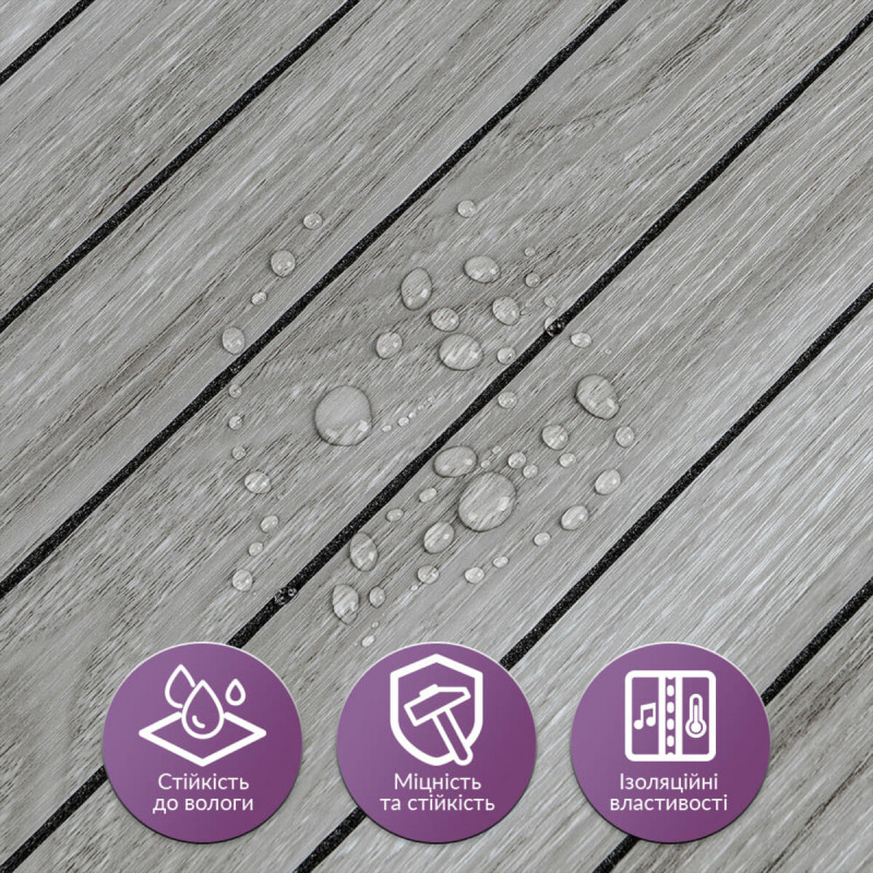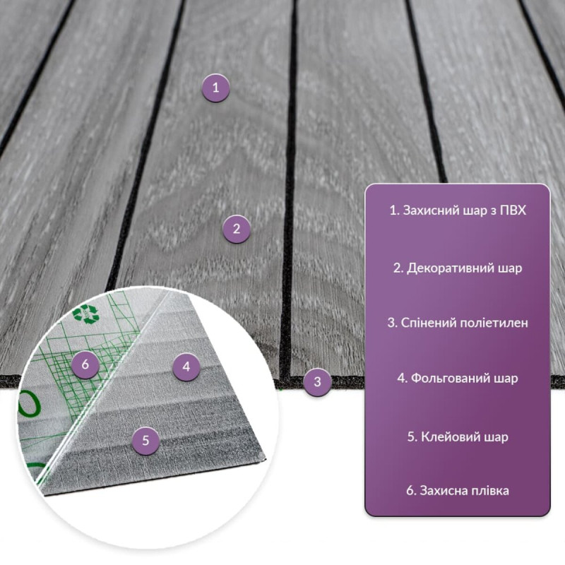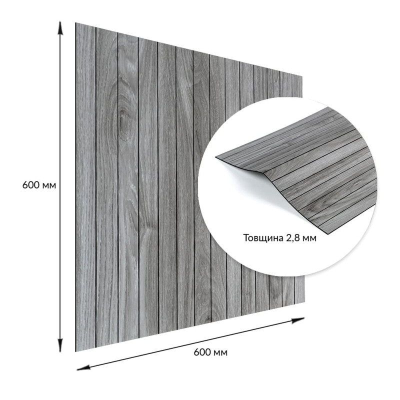 Вінілова гнучка рейка — це сучасний декоративний матеріал, що використовується для внутрішнього оздоблення стін. Він легко монтується завдяки клейовій основі та доступний у різних дизайнах, що імітують натуральні матеріали, що робить його універсальним для різноманітних інтер'єрних рішень. Основні характеристики: - Розмір: 600x600x2,8 мм. - Площа покриття: 0,36 кв.м. - Фактура: рельєфна, з матовою поверхнею, що імітує дерев'яні рейки. Склад: 1. Захисний шар ПВХ – забезпечує захист від дрібних механічних пошкоджень, запобігає стирання та вицвітання завдяки УФ-захисту, зберігає насиченість кольору. ПВХ стійкий до впливу хімічних речовин, має високу пружність і легкість. 2. Декоративний шар — кольорова плівка з високою роздільною здатністю, що імітує текстуру природних матеріалів завдяки чіткому та детальному зображенню. 3. Спінений поліетилен (РЕ) – полімер із закритою комірчастою структурою, який відрізняється легкістю, гнучкістю, має хороші тепло- та звукоізоляційні характеристики, а також стійкість до вологи. 4. Фольгований шар – відбиває теплові хвилі, що допомагає знизити тепловтрати та підвищити енергоефективність приміщення. 5. Клейовий шар – основа з високою адгезією, безпечна для здоров'я та забезпечує надійне кріплення. 6. Захисна плівка – запобігає висиханню та забрудненням клейового шару, легко видаляється перед монтажем. Температурні умови: Вінілова рейка стійка до впливу високих температур, проте при встановленні поблизу відкритого вогню, наприклад, на кухні, рекомендується монтувати її на відстані 30-50 см від джерел тепла. Область застосування: Матеріал використовується для внутрішнього оздоблення житлових та комерційних приміщень. Вінілові рейки підходять для стін у кухнях, ванних кімнатах, віталень, дитячих, спальнях та передпокоях, а також для офісів, магазинів, салонів краси, фітнес-центрів, готелів, ресторанів та кафе. Крім того, вони можуть застосовуватись для декорування меблів, дверей, підвіконь та інших рівних поверхонь. Переваги та особливості вінілових рейок: • Простота монтажу: Вінілові рейки оснащені клейовим шаром, що робить їхню установку швидкою та легкою. Додаткові матеріали не потрібні, а рейки легко ріжуться ножем або ножицями та укладаються встик. При встановленні на стіни відсоток обрізків мінімальний. • Вологостійкість: Вінілові рейки стійкі до впливу вологи, тому ідеально підходять для використання у таких приміщеннях, як ванні кімнати та кухні. Вони не схильні до набухання і добре протистоять пару і цвілі. • Довговічність: Рейки стійкі до зносу, механічних пошкоджень та подряпин, що гарантує їх довгу службу, навіть в умовах інтенсивної експлуатації. • Естетична різноманітність: Представлені в широкому асортименті текстур, кольорів та візерунків, що імітують натуральні матеріали. Це дозволяє підібрати варіант для будь-якого інтер'єру. Їх можна монтувати горизонтально, вертикально чи під кутом, створюючи цікаві декоративні ефекти. • Простота догляду: Вінілові рейки легко чистяться, не вимагають спеціальних миючих засобів та не вбирають бруд. • Ізоляційні властивості: Рейки мають хороші тепло- та звукоізоляційні характеристики, що робить їх відмінним вибором для приміщень, де важливий комфорт у плані тепла та акустики. • Екологічність: Вінілові рейки виготовлені з безпечних матеріалі