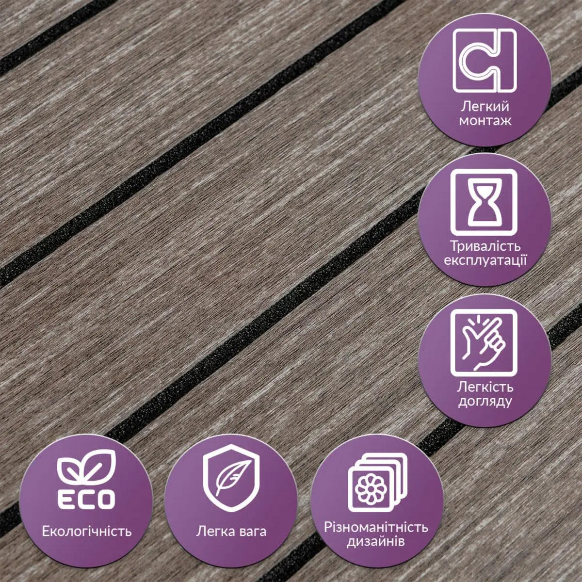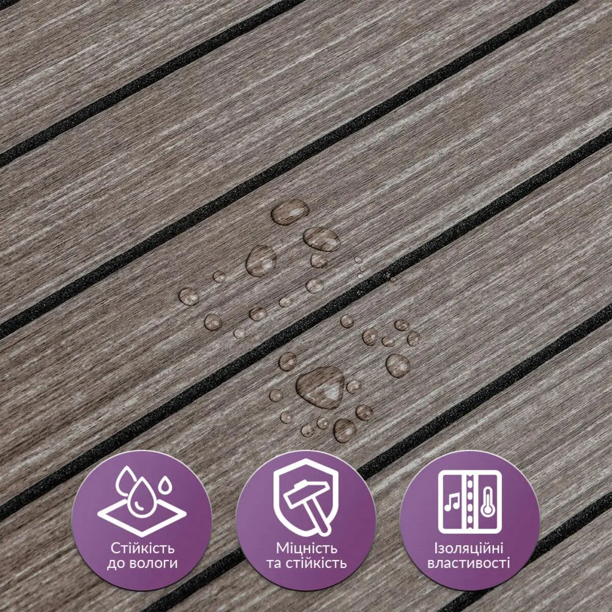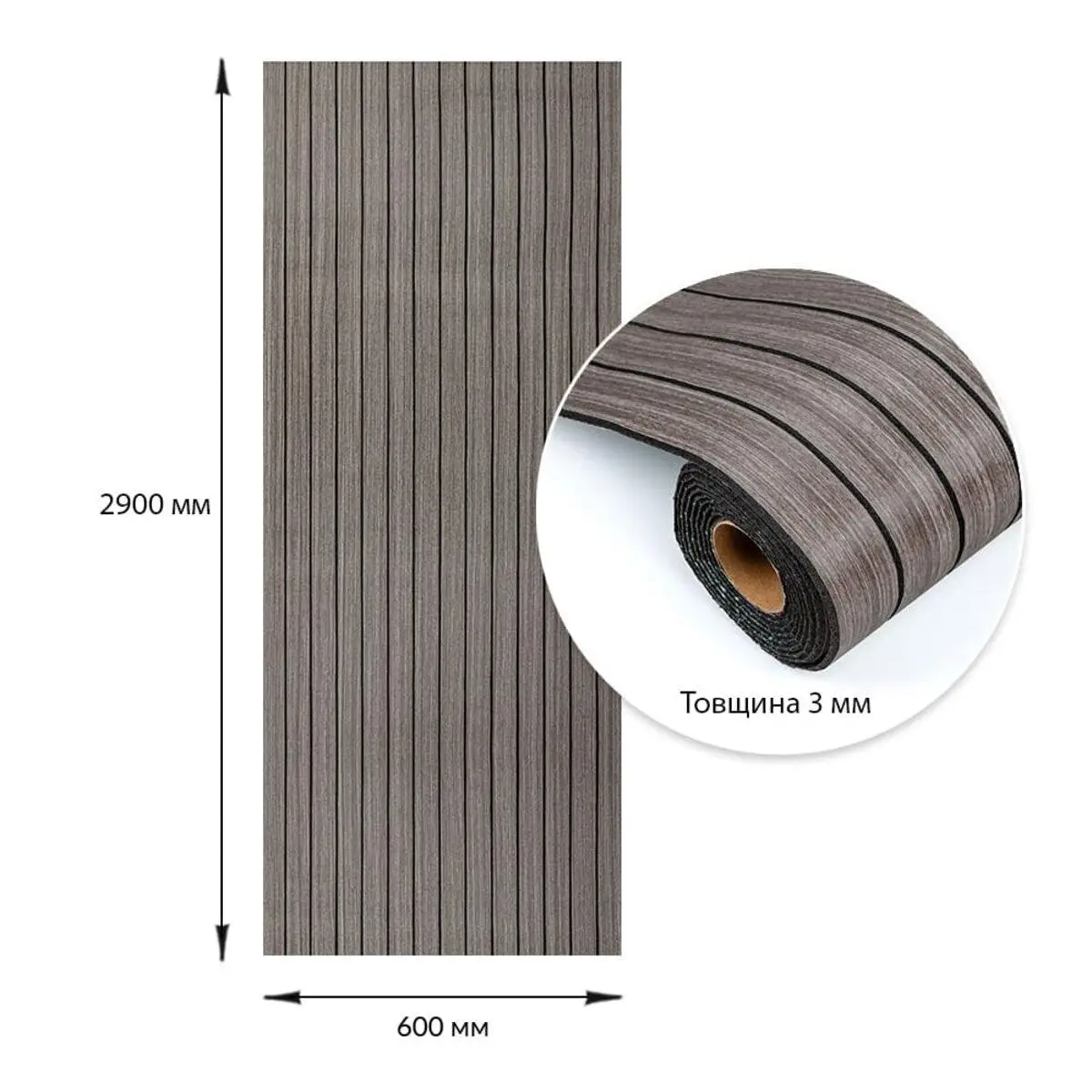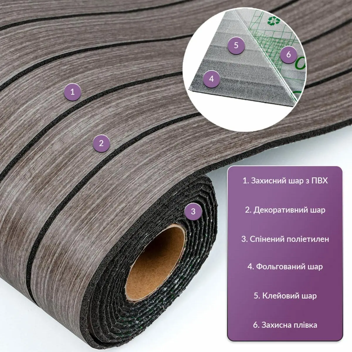 Самоклеючі вінілові 3D рейки в рулоні — сучасний декоративний матеріал для швидкого та стильного оздоблення стін. Рельєфна поверхня створює виразний 3D-ефект, а дизайн із імітацією натуральної деревини гармонійно доповнює сучасні інтер’єри. Завдяки клейовій основі та зручному формату рулону монтаж максимально простий і акуратний — без майстрів, без складних інструментів і без бруду. Компактне пакування дозволяє легко транспортувати матеріал і зменшує витрати на доставку. Основні характеристики • Розміри: 600 x 2900 x 3 мм • Площа покриття одного рулону: 1,74 кв.м • Фактура: рельєфна, імітація дерев'яної рейки • Поверхня: матова Матеріал та структура Вінілова 3D рейка складається з кількох функціональних шарів, які забезпечують міцність, довговічність та декоративний вигляд. 1. Захисний шар ПВХ • захищає від потертостей та дрібних механічних пошкоджень • забезпечує довготривале використання • має УФ-захист від вигорання кольору • стійкий до вологи та побутових хімічних засобів 2. Декоративний шар Плівка з кольоровим друком високої роздільної здатності, яка точно передає текстуру натуральних матеріалів та створює ефект дерев’яних рейок. 3. Шар зі спіненого поліетилену (PE) • легкий та гнучкий матеріал • має закритопористу структуру • забезпечує тепло- та звукоізоляцію • стійкий до вологи 4. Фольгований шар • відбиває теплові хвилі • допомагає зменшити тепловтрати • підсилює конструкцію матеріалу • підвищує міцність і стійкість до розривів 5. Клейовий шар Нетоксична клейова основа з високим рівнем адгезії, що забезпечує надійне приклеювання до поверхні. 6. Захисна плівка • захищає клей від пересихання та забруднення • легко знімається під час монтажу • має розмітку для точного підрізання матеріалу Температурний режим Матеріал не рекомендується встановлювати впритул до джерел відкритого вогню або сильного нагріву. У кухонній зоні рейки слід монтувати на відстані 30–50 см від плити або варильної поверхні. Застосування Вінілові 3D рейки призначені для внутрішніх оздоблювальних робіт у житлових та комерційних приміщеннях. Підходять для: • кухонь • ванних кімнат • віталень • спалень • дитячих кімнат • передпокоїв Також використовуються у: • офісах • магазинах • салонах краси • фітнес-центрах • готелях • кафе та ресторанах • студіях і майстернях Матеріал можна застосовувати для декорування: • стін • меблів • дверей • підвіконь • торгового обладнання • інших рівних поверхонь Переваги вінілових 3D рейок Швидкий монтаж • самоклеюча основа — не потрібен додатковий клей • монтаж без спеціальних інструментів • легко ріжеться ножицями або монтажним ножем • мінімальна кількість обрізків Стійкість до вологи • не набухає від води • підходить для кухонь і ванних кімнат • стійкий до пари та появи цвілі Довговічність • стійкість до подряпин та пошкоджень • зберігає колір і форму протягом тривалого часу Зручне транспортування • гнучкий матеріал • скручується в рулон • легко перевозиться без ризику пошкодження Легкий догляд • не вбирає бруд • легко очищується вологою серветкою • не потребує спеціальних миючих засобів Ізоляційні властивості • покращує теплоізоляцію • зменшує рівень шуму в приміщенні Виразний декоративний ефект • товщина 3 мм створює чіткий 3D-рельєф • додає стінам глибини та стильного вигляд
