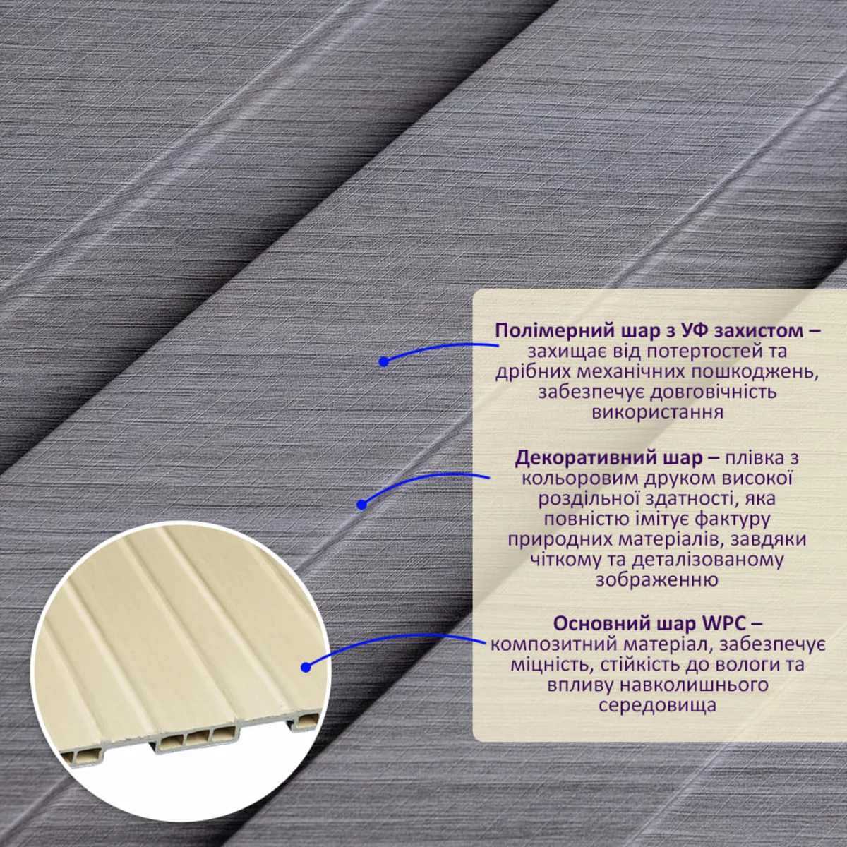 WPC (Wood-Plastic Composite) – це композитний матеріал, що поєднує в собі красу та практичність. Стінові рейки WPC – це сучасне рішення для внутрішнього оздоблення, що імітує натуральну деревину. WPC-рейки виготовляються зі суміші деревних волокон і полімерів, завдяки чому вони зберігають візуальну теплоту натурального дерева, але водночас значно перевершують його за експлуатаційними характеристиками. Матеріал не схильний до розтріскування, деформації та впливу вологи, що робить його ідеальним для використання у приміщеннях із перепадами температури та вологості. Поверхня рейок стійка до механічних пошкоджень, не потребує регулярного догляду та зберігає первинний зовнішній вигляд протягом багатьох років. Стенові рейки WPC вирізняються високою універсальністю та підходять для оформлення житлових і комерційних інтер’єрів: віталень, спалень, коридорів, офісів, готелів і громадських просторів. Вони дають змогу створювати виразні акцентні стіни, зонувати простір і надавати інтер’єру глибини та ритму. Широкий вибір текстур і відтінків під натуральне дерево дозволяє гармонійно інтегрувати рейки в сучасні, скандинавські, мінімалістичні та класичні стилі оформлення. Монтаж стенових рейок WPC простий і зручний, не потребує складних інструментів або спеціальних навичок. Матеріал легко піддається різанню та встановленню, що прискорює процес оздоблення і зменшує витрати на монтажні роботи. Крім того, WPC є екологічно безпечним і довговічним рішенням, поєднуючи естетичну привабливість, функціональність і практичність, що робить його оптимальним вибором для сучасних інтер’єрів. Переваги: 1. Стійкість до вологи: WPC не розбухає та не деформується, що робить його ідеальним вибором для кухні, ванної кімнати та інших приміщень із підвищеною вологістю. 2. Стійкість до гниття та комах: WPC не схильний до гниття і не приваблює комах, що забезпечує його довговічність. 3. Стійкість до УФ-випромінювання: WPC не вицвітає на сонці, зберігаючи свій первісний вигляд протягом довгих років. 4. Привабливий вигляд: Декоративний шар WPC реалістично імітує фактуру натурального дерева, створюючи стильний та затишний інтер'єр. 5. Простота обслуговування: WPC не вимагає фарбування, обробки антисептиками та іншими захисними засобами. 6. Екологічність: WPC не містить шкідливих речовин та є безпечним для здоров'я людини. Застосування: - Декорування стін у всіх видах житлових приміщень (кухня, вітальня, дитяча чи спальня, вхідна група). - Декорування комерційних приміщень (офісні приміщення, зони рецепцій, магазини, салони краси чи фітнес-центри). - Декорування меблів, дверей та інших рівних поверхонь. Температурний режим: від -50 до +80 градусів. Розрахунок потрібної кількості матеріалу: 1. Виміряйте довжину і висоту поверхні, що обклеюється. 2. Помножте довжину на висоту кожної поверхні в метрах і складіть отримані результати, щоб отримати площу. Наприклад, після вимірів ви отримали:Довжина стіни 3,2 м, висота стіни 2,7м (3,2 * 2,7 = 8,64 кв.м) 3. Площу, що вийшла, необхідно розділити на площу однієї рейки (200*2900= 0,58 кв.м) і округлити у більшу сторону: 8,64 / 0,58 = 14,89 (округляємо до 15). У процесі монтажу можуть виникнути відходи, пов’язані з різанням рейок, тому рекомендується додати до розрахунку запасні 1-2 шт. Інструкція з монтажу Перед початком монтажу підготуйте поверхню, на яку встановлюватимуться рей