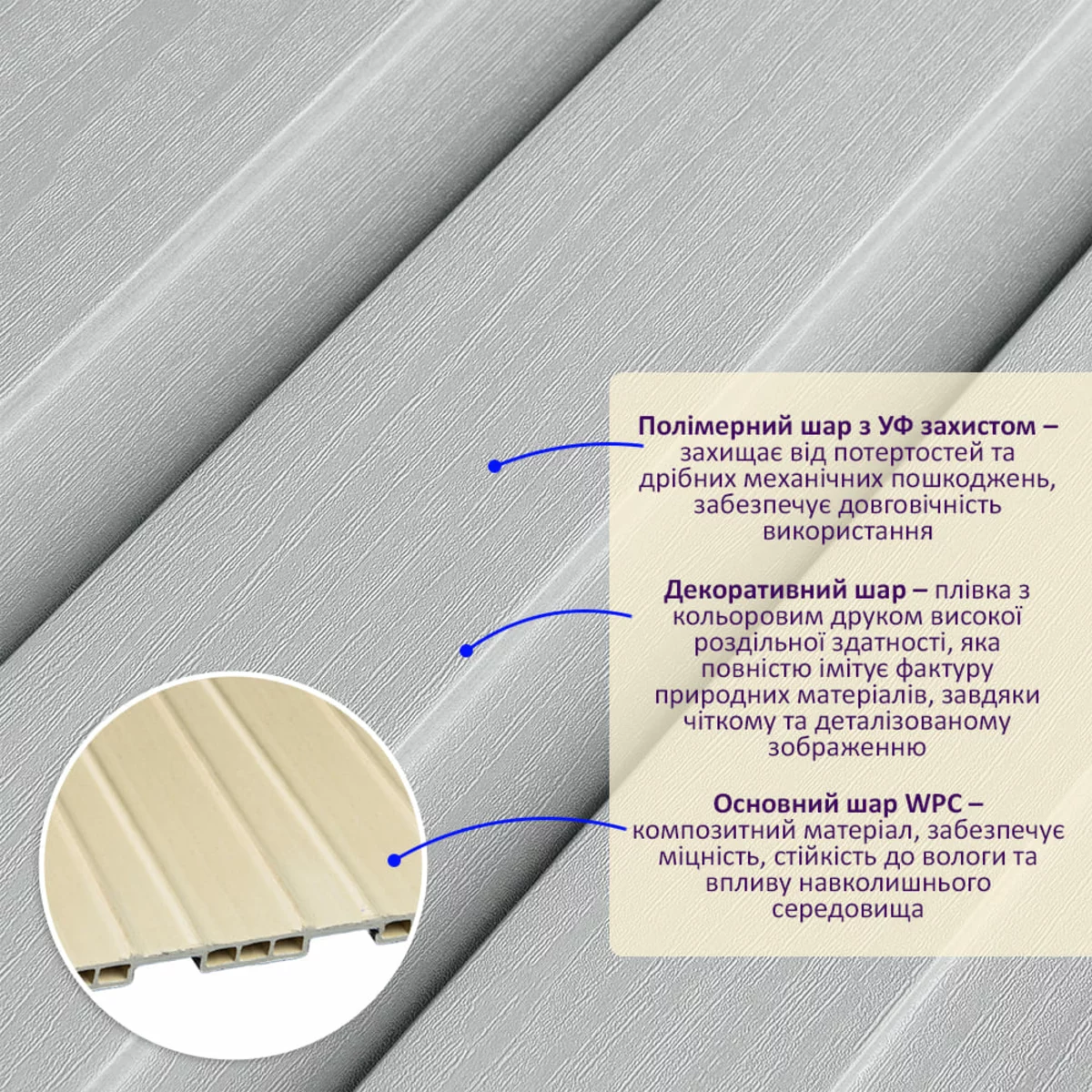 WPC (Wood-Plastic Composite) – це композитний матеріал, що поєднує в собі красу та практичність. Стінові рейки WPC – це сучасне рішення для внутрішнього оздоблення, що імітує натуральну деревину. WPC-рейки виготовляються зі суміші деревних волокон і полімерів, завдяки чому вони зберігають візуальну теплоту натурального дерева, але водночас значно перевершують його за експлуатаційними характеристиками. Матеріал не схильний до розтріскування, деформації та впливу вологи, що робить його ідеальним для використання у приміщеннях із перепадами температури та вологості. Поверхня рейок стійка до механічних пошкоджень, не потребує регулярного догляду та зберігає первинний зовнішній вигляд протягом багатьох років. Стенові рейки WPC вирізняються високою універсальністю та підходять для оформлення житлових і комерційних інтер’єрів: віталень, спалень, коридорів, офісів, готелів і громадських просторів. Вони дають змогу створювати виразні акцентні стіни, зонувати простір і надавати інтер’єру глибини та ритму. Широкий вибір текстур і відтінків під натуральне дерево дозволяє гармонійно інтегрувати рейки в сучасні, скандинавські, мінімалістичні та класичні стилі оформлення. Монтаж стенових рейок WPC простий і зручний, не потребує складних інструментів або спеціальних навичок. Матеріал легко піддається різанню та встановленню, що прискорює процес оздоблення і зменшує витрати на монтажні роботи. Крім того, WPC є екологічно безпечним і довговічним рішенням, поєднуючи естетичну привабливість, функціональність і практичність, що робить його оптимальним вибором для сучасних інтер’єрів. Переваги: 1. Стійкість до вологи: WPC не розбухає та не деформується, що робить його ідеальним вибором для кухні, ванної кімнати та інших приміщень із підвищеною вологістю. 2. Стійкість до гниття та комах: WPC не схильний до гниття і не приваблює комах, що забезпечує його довговічність. 3. Стійкість до УФ-випромінювання: WPC не вицвітає на сонці, зберігаючи свій первісний вигляд протягом довгих років. 4. Привабливий вигляд: Декоративний шар WPC реалістично імітує фактуру натурального дерева, створюючи стильний та затишний інтер'єр. 5. Простота обслуговування: WPC не вимагає фарбування, обробки антисептиками та іншими захисними засобами. 6. Екологічність: WPC не містить шкідливих речовин та є безпечним для здоров'я людини. Застосування: - Декорування стін у всіх видах житлових приміщень (кухня, вітальня, дитяча чи спальня, вхідна група). - Декорування комерційних приміщень (офісні приміщення, зони рецепцій, магазини, салони краси чи фітнес-центри). - Декорування меблів, дверей та інших рівних поверхонь. Температурний режим: від -50 до +80 градусів. Розрахунок потрібної кількості матеріалу: 1. Виміряйте довжину і висоту поверхні, що обклеюється. 2. Помножте довжину на висоту кожної поверхні в метрах і складіть отримані результати, щоб отримати площу. Наприклад, після вимірів ви отримали:Довжина стіни 3,2 м, висота стіни 2,7м (3,2 * 2,7 = 8,64 кв.м) 3. Площу, що вийшла, необхідно розділити на площу однієї рейки (200*2900= 0,58 кв.м) і округлити у більшу сторону: 8,64 / 0,58 = 14,89 (округляємо до 15). У процесі монтажу можуть виникнути відходи, пов’язані з різанням рейок, тому рекомендується додати до розрахунку запасні 1-2 шт. Інструкція з монтажу Перед початком монтажу підготуйте поверхню, на яку встановлюватимуться рей