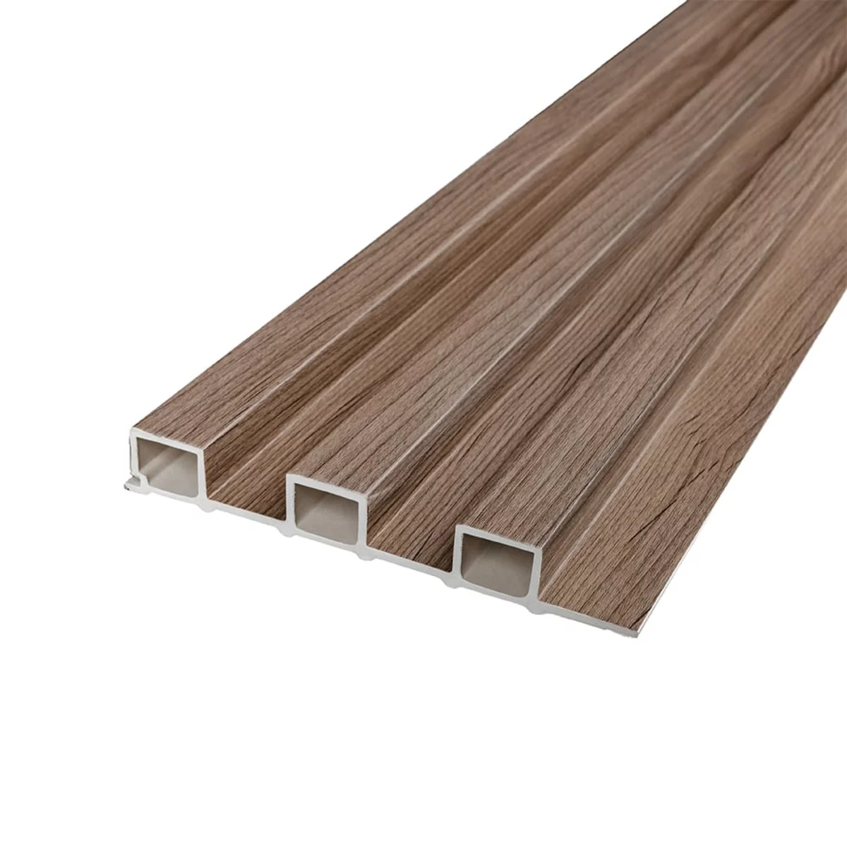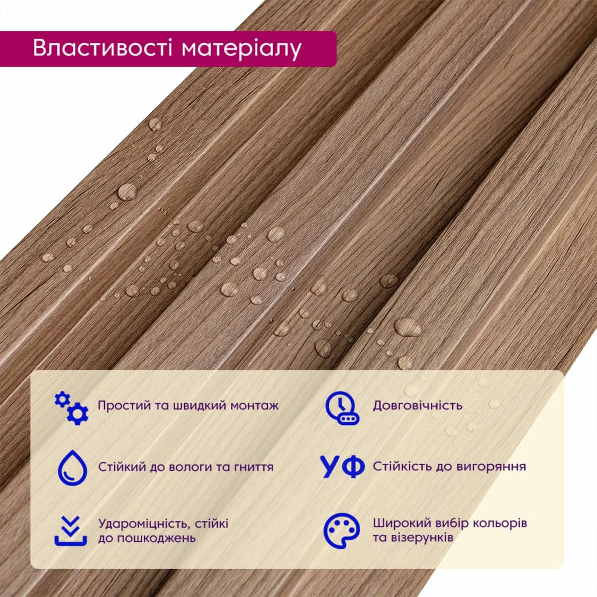 WPC (Wood-Plastic Composite) – це композитний матеріал, що поєднує в собі красу та практичність. Стінові рейки WPC – це сучасне рішення для внутрішнього оздоблення, що імітує натуральну деревину. WPC-рейки виготовляються зі суміші деревних волокон і полімерів, завдяки чому вони зберігають візуальну теплоту натурального дерева, але водночас значно перевершують його за експлуатаційними характеристиками. Матеріал не схильний до розтріскування, деформації та впливу вологи, що робить його ідеальним для використання у приміщеннях із перепадами температури та вологості. Поверхня рейок стійка до механічних пошкоджень, не потребує регулярного догляду та зберігає первинний зовнішній вигляд протягом багатьох років. Стенові рейки WPC вирізняються високою універсальністю та підходять для оформлення житлових і комерційних інтер’єрів: віталень, спалень, коридорів, офісів, готелів і громадських просторів. Вони дають змогу створювати виразні акцентні стіни, зонувати простір і надавати інтер’єру глибини та ритму. Широкий вибір текстур і відтінків під натуральне дерево дозволяє гармонійно інтегрувати рейки в сучасні, скандинавські, мінімалістичні та класичні стилі оформлення. Монтаж стенових рейок WPC простий і зручний, не потребує складних інструментів або спеціальних навичок. Матеріал легко піддається різанню та встановленню, що прискорює процес оздоблення і зменшує витрати на монтажні роботи. Крім того, WPC є екологічно безпечним і довговічним рішенням, поєднуючи естетичну привабливість, функціональність і практичність, що робить його оптимальним вибором для сучасних інтер’єрів. Переваги: 1. Стійкість до вологи: WPC не розбухає та не деформується, що робить його ідеальним вибором для кухні, ванної кімнати та інших приміщень із підвищеною вологістю. 2. Стійкість до гниття та комах: WPC не схильний до гниття і не приваблює комах, що забезпечує його довговічність. 3. Стійкість до УФ-випромінювання: WPC не вицвітає на сонці, зберігаючи свій первісний вигляд протягом довгих років. 4. Привабливий вигляд: Декоративний шар WPC реалістично імітує фактуру натурального дерева, створюючи стильний та затишний інтер'єр. 5. Простота обслуговування: WPC не вимагає фарбування, обробки антисептиками та іншими захисними засобами. 6. Екологічність: WPC не містить шкідливих речовин та є безпечним для здоров'я людини. Застосування: - Декорування стін у всіх видах житлових приміщень (кухня, вітальня, дитяча чи спальня, вхідна група). - Декорування комерційних приміщень (офісні приміщення, зони рецепцій, магазини, салони краси чи фітнес-центри). - Декорування меблів, дверей та інших рівних поверхонь. Температурний режим: від -50 до +80 градусів. Розрахунок потрібної кількості матеріалу: 1. Виміряйте довжину і висоту поверхні, що обклеюється. 2. Помножте довжину на висоту кожної поверхні в метрах і складіть отримані результати, щоб отримати площу. Наприклад, після вимірів ви отримали:Довжина стіни 3,2 м, висота стіни 2,7м (3,2 * 2,7 = 8,64 кв.м) 3. Площу, що вийшла, необхідно розділити на площу однієї рейки (200*2900= 0,58 кв.м) і округлити у більшу сторону: 8,64 / 0,58 = 14,89 (округляємо до 15). У процесі монтажу можуть виникнути відходи, пов’язані з різанням рейок, тому рекомендується додати до розрахунку запасні 1-2 шт. Інструкція з монтажу Перед початком монтажу підготуйте поверхню, на яку встановлюватимуться рей