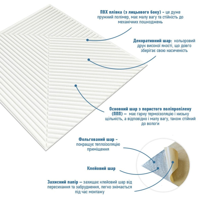 Хочете швидко оновити інтер’єр без пилу, шуму та зайвих витрат на ремонт? З декоративними 3D панелями Sticker Wall ваш дім зміниться буквально за кілька годин! Це сучасне рішення для тих, хто цінує комфорт, естетику та практичність. Чому обирають 3D панелі Sticker Wall 1. Легкий монтаж — без інструментів і майстрів: просто зніміть захисну плівку та приклейте панель до стіни! Установити панелі під силу кожному — без цвяхів, клею чи бруду. 2. Ідеальні навіть для нерівних стін: еластичний матеріал м’яко повторює рельєф поверхні, приховуючи дрібні дефекти та тріщини. 3. Тепло та тиша у вашому домі: спінений поліпропілен чудово утримує тепло та поглинає шум. Комфортна температура і затишна атмосфера — цілий рік. 4. Безпечність та екологічність: панелі не містять токсичних речовин, не горять, не вбирають запахи та не викликають алергії. Абсолютно безпечні для дітей і домашніх тварин. 5. Простота догляду: пил, бруд або плями легко видаляються вологою губкою. Поверхня стійка до вологи, тому панелі можна встановлювати навіть на кухні або у ванній кімнаті. 6. Довговічність і надійність: Sticker Wall зберігають свій вигляд понад 20 років — не вицвітають, не деформуються та не тріскаються. Де можна використовувати 3D панелі • Дім: вітальня, спальня, кухня, дитяча, передпокій, балкон. • Бізнес: офіси, салони краси, кафе, торгові зали, фотостудії. • Декор: акцентні стіни, узголів’я ліжок, ніші, зони відпочинку. Порада: комбінуйте панелі за кольорами та фактурами, створюючи ефектні дизайнерські рішення — від мінімалізму до лофту. Проста інструкція з монтажу 1. Виміряйте стіну та розрахуйте кількість панелей. 2. Очистіть поверхню від пилу та бруду. 3. Зніміть захисну плівку. 4. Обережно приклейте панель і розгладьте від центру до країв. 5. За потреби підріжте краї ножем або ножицями. Чому це вигідно • Не потрібно витрачатися на ремонтну бригаду; • Можна легко змінювати дизайн — панелі знімаються та переклеюються; • Ідеальне рішення для орендованих квартир або швидкого оновлення інтер’єру перед продажем житла. Sticker Wall — це поєднання краси, практичності та простоти. Створіть стильний інтер’єр власноруч і насолоджуйтеся затишком щодня!Характеристики