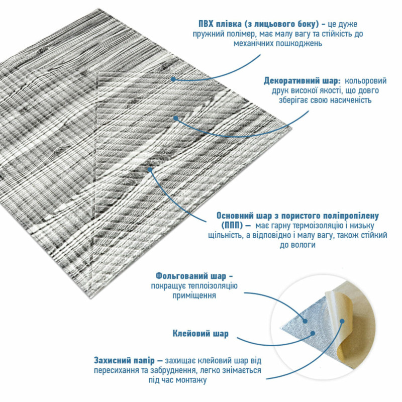 Хочете швидко оновити інтер’єр без пилу, шуму та зайвих витрат на ремонт? З декоративними 3D панелями Sticker Wall ваш дім зміниться буквально за кілька годин! Це сучасне рішення для тих, хто цінує комфорт, естетику та практичність. Чому обирають 3D панелі Sticker Wall 1. Легкий монтаж — без інструментів і майстрів: просто зніміть захисну плівку та приклейте панель до стіни! Установити панелі під силу кожному — без цвяхів, клею чи бруду. 2. Ідеальні навіть для нерівних стін: еластичний матеріал м’яко повторює рельєф поверхні, приховуючи дрібні дефекти та тріщини. 3. Тепло та тиша у вашому домі: спінений поліпропілен чудово утримує тепло та поглинає шум. Комфортна температура і затишна атмосфера — цілий рік. 4. Безпечність та екологічність: панелі не містять токсичних речовин, не горять, не вбирають запахи та не викликають алергії. Абсолютно безпечні для дітей і домашніх тварин. 5. Простота догляду: пил, бруд або плями легко видаляються вологою губкою. Поверхня стійка до вологи, тому панелі можна встановлювати навіть на кухні або у ванній кімнаті. 6. Довговічність і надійність: Sticker Wall зберігають свій вигляд понад 20 років — не вицвітають, не деформуються та не тріскаються. Де можна використовувати 3D панелі • Дім: вітальня, спальня, кухня, дитяча, передпокій, балкон. • Бізнес: офіси, салони краси, кафе, торгові зали, фотостудії. • Декор: акцентні стіни, узголів’я ліжок, ніші, зони відпочинку. Порада: комбінуйте панелі за кольорами та фактурами, створюючи ефектні дизайнерські рішення — від мінімалізму до лофту. Проста інструкція з монтажу 1. Виміряйте стіну та розрахуйте кількість панелей. 2. Очистіть поверхню від пилу та бруду. 3. Зніміть захисну плівку. 4. Обережно приклейте панель і розгладьте від центру до країв. 5. За потреби підріжте краї ножем або ножицями. Чому це вигідно • Не потрібно витрачатися на ремонтну бригаду; • Можна легко змінювати дизайн — панелі знімаються та переклеюються; • Ідеальне рішення для орендованих квартир або швидкого оновлення інтер’єру перед продажем житла. Sticker Wall — це поєднання краси, практичності та простоти. Створіть стильний інтер’єр власноруч і насолоджуйтеся затишком щодня!Характеристики