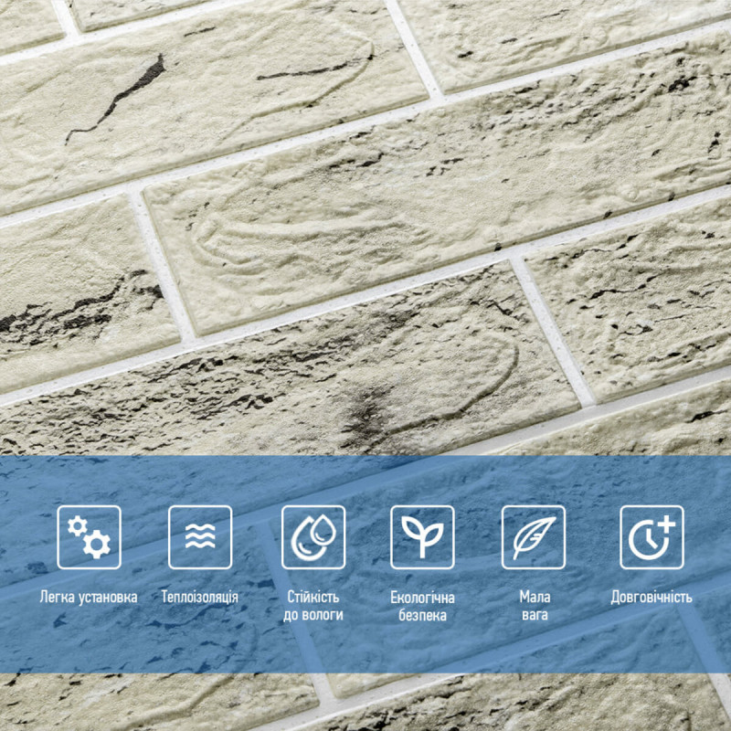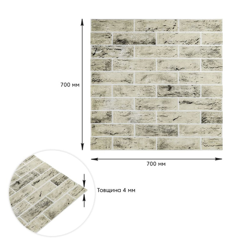 Самоклеюча 3D панель Sticker wall 700*700*4мм (D) SW-00001994 Прикрасьте стіни свого будинку самоклеючими 3D панелями - простим і доступним рішенням для створення стильного та сучасного інтер'єру. Легкі та міцні панелі з пористого поліпропілену (ППП) з рельєфним малюнком перетворять будь-яку кімнату. Самоклеюча основа забезпечує швидкий та легкий монтаж без використання додаткових матеріалів. Багатошарова структура панелей гарантує їх довговічність та практичність: - ПВХ плівка: стійка до хімічних речовин, еластична та легка. - Декоративний шар: високоякісний друк із збереженням насиченості кольору. - Основний шар із ППП: забезпечує теплоізоляцію, низьку вагу, вологостійкість та хімічну інертність. - Клейовий шар: нетоксичний, із високою адгезією. - Захисний папір: легко знімається перед монтажем. Переваги 3D панелей: 1. Простота монтажу: без клею, цвяхів та інструментів. 2. Стильний дизайн: реалістична імітація цегляної кладки в багатому кольорі. 3. Практичність: вологостійкість, легке чищення, стійкість до вицвітання. 4. Доступність: вигідне співвідношення ціни та якості. Розрахунок необхідної кількості панелей: 1. Виміряйте довжину і ширину поверхні, що обклеюється. 2. Помножте довжину на ширину кожної поверхні в метрах і складіть отримані результати, щоб отримати площу. Наприклад, після вимірів ви отримали: - Довжина стіни 3,7 м. - Ширина стіни 2,7 м. 3,7 * 2,7 = 9,99 кв.м 3. Площа, що вийшла, необхідно розділити на площу однієї панелі (700*700= 0,49 кв.м) і округлити у більшу сторону: 9,99/0,49=20,38 округляємо до 21. У процесі монтажу можуть виникнути відходи, пов'язані з різанням панелей, тому рекомендується додати до розрахунку запасні 1-2 шт. Монтаж панелей: покрокова інструкція Підготовка 1. Очистіть та вирівняйте поверхню: Переконайтеся, що поверхня, на яку ви будете кріпити панелі, чиста, суха та рівна. Видаліть пил, бруд, жир, а за потреби вирівняйте поверхню. Для забезпечення оптимального зчеплення панелі та поверхня повинні бути кімнатної температури. 2. Зніміть захисну плівку: Зніміть захисний папір зі зворотного боку панелі, що самоклеїться, щоб оголити клейову поверхню. Монтаж 3. Почніть з кута: Почніть установку з одного кута та обережно притисніть панель до поверхні. Слідкуйте за тим, щоб панель була встановлена рівно і без бульбашок повітря або зморшок. 4. Припасування панелей: Використовуйте ніж або ножиці, щоб підрізати панелі за розміром, особливо в кутах і по краях поверхні. 5. Притисніть панелі: Щільно притисніть до поверхні, щоб забезпечити надійне зчеплення. Поради - Для досягнення найкращих результатів використовуйте рівень, щоб переконатися, що панелі встановлені рівно. - Якщо ви не впевнені у своїх силах, зверніться за допомогою до професіонала.Характеристики