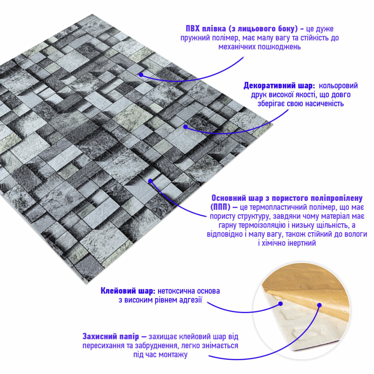 Самоклеюча 3D панель Sticker wall 700*770*3мм (D) SW-00001996 Прикрасьте стіни свого будинку самоклеючими 3D панелями - простим і доступним рішенням для створення стильного та сучасного інтер'єру. Легкі та міцні панелі з пористого поліпропілену (ППП) з рельєфним малюнком перетворять будь-яку кімнату. Самоклеюча основа забезпечує швидкий та легкий монтаж без використання додаткових матеріалів. Багатошарова структура панелей гарантує їх довговічність та практичність: - ПВХ плівка: стійка до хімічних речовин, еластична та легка. - Декоративний шар: високоякісний друк із збереженням насиченості кольору. - Основний шар із ППП: забезпечує теплоізоляцію, низьку вагу, вологостійкість та хімічну інертність. - Клейовий шар: нетоксичний, із високою адгезією. - Захисний папір: легко знімається перед монтажем. Переваги 3D панелей: 1. Простота монтажу: без клею, цвяхів та інструментів. 2. Стильний дизайн: реалістична імітація цегляної кладки в багатому кольорі. 3. Практичність: вологостійкість, легке чищення, стійкість до вицвітання. 4. Доступність: вигідне співвідношення ціни та якості. Розрахунок необхідної кількості панелей: 1. Виміряйте довжину і ширину поверхні, що обклеюється. 2. Помножте довжину на ширину кожної поверхні в метрах і складіть отримані результати, щоб отримати площу. Наприклад, після вимірів ви отримали: - Довжина стіни 3,7 м. - Ширина стіни 2,7 м. 3,7 * 2,7 = 9,99 кв.м 3. Площа, що вийшла, необхідно розділити на площу однієї панелі (700*700= 0,49 кв.м) і округлити у більшу сторону: 9,99/0,49=20,38 округляємо до 21. У процесі монтажу можуть виникнути відходи, пов'язані з різанням панелей, тому рекомендується додати до розрахунку запасні 1-2 шт. Монтаж панелей: покрокова інструкція Підготовка 1. Очистіть та вирівняйте поверхню: Переконайтеся, що поверхня, на яку ви будете кріпити панелі, чиста, суха та рівна. Видаліть пил, бруд, жир, а за потреби вирівняйте поверхню. Для забезпечення оптимального зчеплення панелі та поверхня повинні бути кімнатної температури. 2. Зніміть захисну плівку: Зніміть захисний папір зі зворотного боку панелі, що самоклеїться, щоб оголити клейову поверхню. Монтаж 3. Почніть з кута: Почніть установку з одного кута та обережно притисніть панель до поверхні. Слідкуйте за тим, щоб панель була встановлена рівно і без бульбашок повітря або зморшок. 4. Припасування панелей: Використовуйте ніж або ножиці, щоб підрізати панелі за розміром, особливо в кутах і по краях поверхні. 5. Притисніть панелі: Щільно притисніть до поверхні, щоб забезпечити надійне зчеплення. Поради - Для досягнення найкращих результатів використовуйте рівень, щоб переконатися, що панелі встановлені рівно. - Якщо ви не впевнені у своїх силах, зверніться за допомогою до професіонала.Характеристики