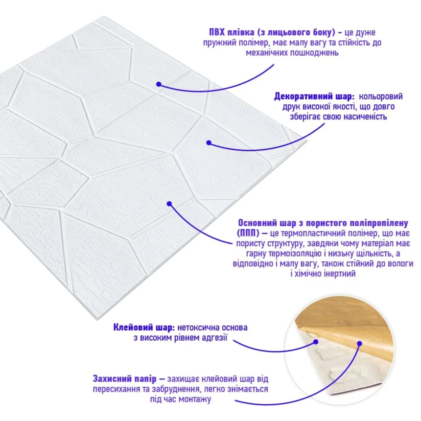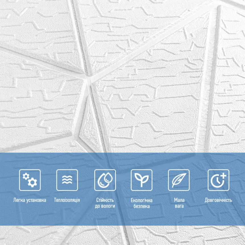 Хочете швидко оновити інтер’єр без пилу, шуму та зайвих витрат на ремонт? З декоративними 3D панелями Sticker Wall ваш дім зміниться буквально за кілька годин! Це сучасне рішення для тих, хто цінує комфорт, естетику та практичність. Чому обирають 3D панелі Sticker Wall 1. Легкий монтаж — без інструментів і майстрів: просто зніміть захисну плівку та приклейте панель до стіни! Установити панелі під силу кожному — без цвяхів, клею чи бруду. 2. Ідеальні навіть для нерівних стін: еластичний матеріал м’яко повторює рельєф поверхні, приховуючи дрібні дефекти та тріщини. 3. Тепло та тиша у вашому домі: спінений поліпропілен чудово утримує тепло та поглинає шум. Комфортна температура і затишна атмосфера — цілий рік. 4. Безпечність та екологічність: панелі не містять токсичних речовин, не горять, не вбирають запахи та не викликають алергії. Абсолютно безпечні для дітей і домашніх тварин. 5. Простота догляду: пил, бруд або плями легко видаляються вологою губкою. Поверхня стійка до вологи, тому панелі можна встановлювати навіть на кухні або у ванній кімнаті. 6. Довговічність і надійність: Sticker Wall зберігають свій вигляд понад 20 років — не вицвітають, не деформуються та не тріскаються. Де можна використовувати 3D панелі • Дім: вітальня, спальня, кухня, дитяча, передпокій, балкон. • Бізнес: офіси, салони краси, кафе, торгові зали, фотостудії. • Декор: акцентні стіни, узголів’я ліжок, ніші, зони відпочинку. Порада: комбінуйте панелі за кольорами та фактурами, створюючи ефектні дизайнерські рішення — від мінімалізму до лофту. Проста інструкція з монтажу 1. Виміряйте стіну та розрахуйте кількість панелей. 2. Очистіть поверхню від пилу та бруду. 3. Зніміть захисну плівку. 4. Обережно приклейте панель і розгладьте від центру до країв. 5. За потреби підріжте краї ножем або ножицями. Чому це вигідно • Не потрібно витрачатися на ремонтну бригаду; • Можна легко змінювати дизайн — панелі знімаються та переклеюються; • Ідеальне рішення для орендованих квартир або швидкого оновлення інтер’єру перед продажем житла. Sticker Wall — це поєднання краси, практичності та простоти. Створіть стильний інтер’єр власноруч і насолоджуйтеся затишком щодня!Характеристики