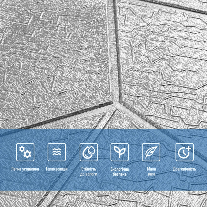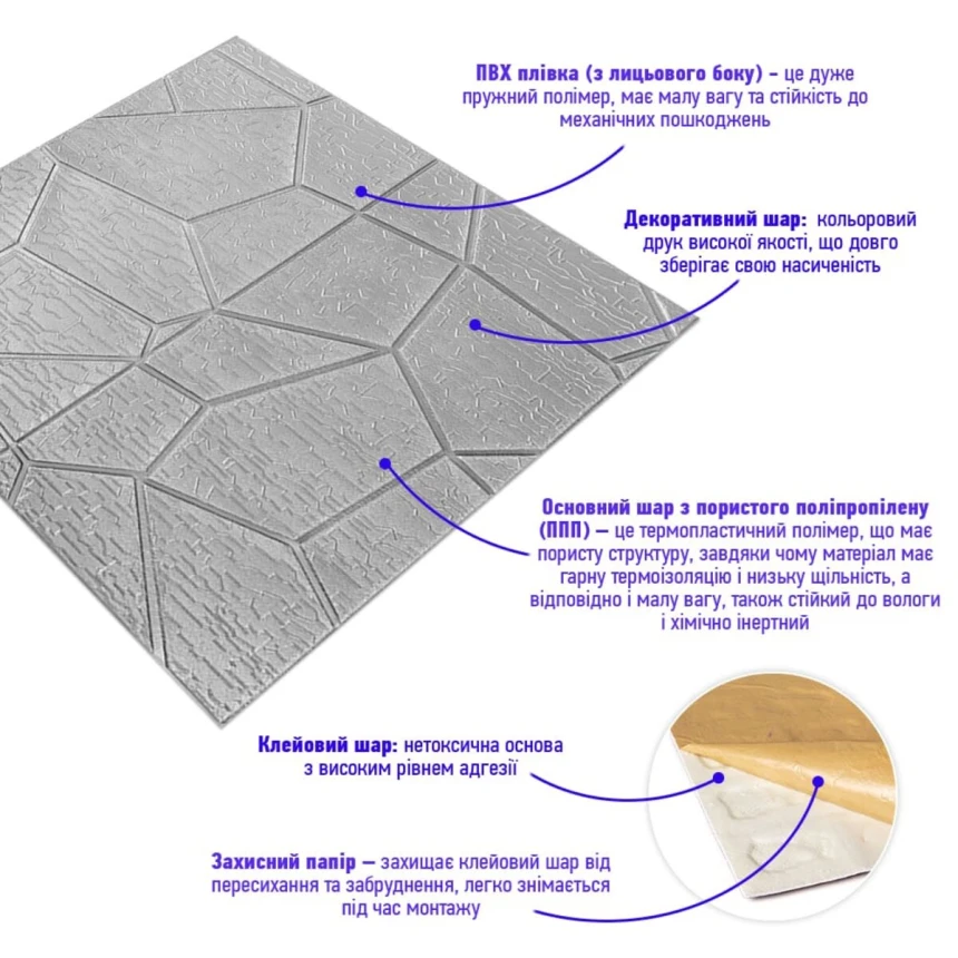 Хочете швидко оновити інтер’єр без пилу, шуму та зайвих витрат на ремонт? З декоративними 3D панелями Sticker Wall ваш дім зміниться буквально за кілька годин! Це сучасне рішення для тих, хто цінує комфорт, естетику та практичність. Чому обирають 3D панелі Sticker Wall 1. Легкий монтаж — без інструментів і майстрів: просто зніміть захисну плівку та приклейте панель до стіни! Установити панелі під силу кожному — без цвяхів, клею чи бруду. 2. Ідеальні навіть для нерівних стін: еластичний матеріал м’яко повторює рельєф поверхні, приховуючи дрібні дефекти та тріщини. 3. Тепло та тиша у вашому домі: спінений поліпропілен чудово утримує тепло та поглинає шум. Комфортна температура і затишна атмосфера — цілий рік. 4. Безпечність та екологічність: панелі не містять токсичних речовин, не горять, не вбирають запахи та не викликають алергії. Абсолютно безпечні для дітей і домашніх тварин. 5. Простота догляду: пил, бруд або плями легко видаляються вологою губкою. Поверхня стійка до вологи, тому панелі можна встановлювати навіть на кухні або у ванній кімнаті. 6. Довговічність і надійність: Sticker Wall зберігають свій вигляд понад 20 років — не вицвітають, не деформуються та не тріскаються. Де можна використовувати 3D панелі • Дім: вітальня, спальня, кухня, дитяча, передпокій, балкон. • Бізнес: офіси, салони краси, кафе, торгові зали, фотостудії. • Декор: акцентні стіни, узголів’я ліжок, ніші, зони відпочинку. Порада: комбінуйте панелі за кольорами та фактурами, створюючи ефектні дизайнерські рішення — від мінімалізму до лофту. Проста інструкція з монтажу 1. Виміряйте стіну та розрахуйте кількість панелей. 2. Очистіть поверхню від пилу та бруду. 3. Зніміть захисну плівку. 4. Обережно приклейте панель і розгладьте від центру до країв. 5. За потреби підріжте краї ножем або ножицями. Чому це вигідно • Не потрібно витрачатися на ремонтну бригаду; • Можна легко змінювати дизайн — панелі знімаються та переклеюються; • Ідеальне рішення для орендованих квартир або швидкого оновлення інтер’єру перед продажем житла. Sticker Wall — це поєднання краси, практичності та простоти. Створіть стильний інтер’єр власноруч і насолоджуйтеся затишком щодня!Характеристики
