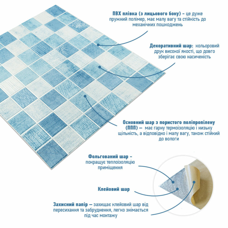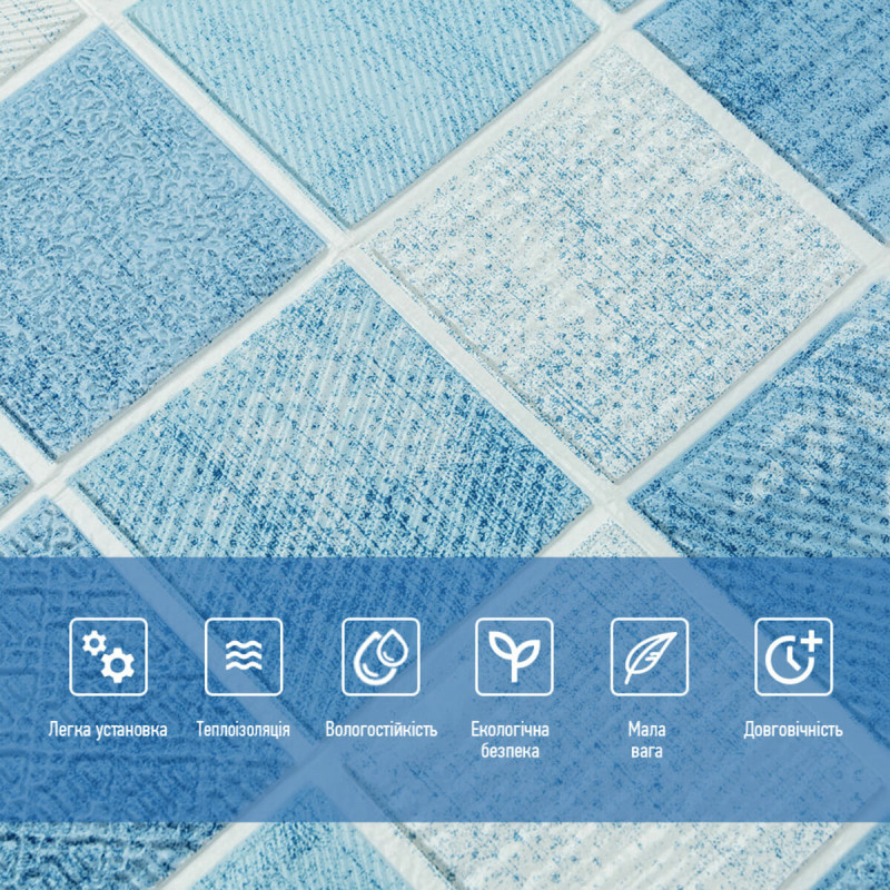 Самоклеюча 3D панель Sticker wall 700х700х4мм блакитна мозаїка (D) SW-00002009 Прикрасьте стіни свого будинку самоклеючими 3D панелями - простим і доступним рішенням для створення стильного та сучасного інтер'єру. Легкі та міцні панелі з пористого поліпропілену (ППП) з рельєфним малюнком перетворять будь-яку кімнату. Самоклеюча основа забезпечує швидкий та легкий монтаж без використання додаткових матеріалів. Багатошарова структура панелей гарантує їх довговічність та практичність: - ПВХ плівка: стійка до хімічних речовин, еластична та легка. - Декоративний шар: високоякісний друк із збереженням насиченості кольору. - Основний шар із ППП: забезпечує теплоізоляцію, низьку вагу, вологостійкість та хімічну інертність. - Клейовий шар: нетоксичний, із високою адгезією. - Захисний папір: легко знімається перед монтажем. Переваги 3D панелей: 1. Простота монтажу: без клею, цвяхів та інструментів. 2. Стильний дизайн: реалістична імітація цегляної кладки в багатому кольорі. 3. Практичність: вологостійкість, легке чищення, стійкість до вицвітання. 4. Доступність: вигідне співвідношення ціни та якості. Розрахунок необхідної кількості панелей: 1. Виміряйте довжину і ширину поверхні, що обклеюється. 2. Помножте довжину на ширину кожної поверхні в метрах і складіть отримані результати, щоб отримати площу. Наприклад, після вимірів ви отримали: - Довжина стіни 3,7 м. - Ширина стіни 2,7 м. 3,7 * 2,7 = 9,99 кв.м 3. Площа, що вийшла, необхідно розділити на площу однієї панелі (700*700= 0,49 кв.м) і округлити у більшу сторону: 9,99/0,49=20,38 округляємо до 21. У процесі монтажу можуть виникнути відходи, пов'язані з різанням панелей, тому рекомендується додати до розрахунку запасні 1-2 шт. Монтаж панелей: покрокова інструкція Підготовка 1. Очистіть та вирівняйте поверхню: Переконайтеся, що поверхня, на яку ви будете кріпити панелі, чиста, суха та рівна. Видаліть пил, бруд, жир, а за потреби вирівняйте поверхню. Для забезпечення оптимального зчеплення панелі та поверхня повинні бути кімнатної температури. 2. Зніміть захисну плівку: Зніміть захисний папір зі зворотного боку панелі, що самоклеїться, щоб оголити клейову поверхню. Монтаж 3. Почніть з кута: Почніть установку з одного кута та обережно притисніть панель до поверхні. Слідкуйте за тим, щоб панель була встановлена рівно і без бульбашок повітря або зморшок. 4. Припасування панелей: Використовуйте ніж або ножиці, щоб підрізати панелі за розміром, особливо в кутах і по краях поверхні. 5. Притисніть панелі: Щільно притисніть до поверхні, щоб забезпечити надійне зчеплення. Поради - Для досягнення найкращих результатів використовуйте рівень, щоб переконатися, що панелі встановлені рівно. - Якщо ви не впевнені у своїх силах, зверніться за допомогою до професіонала.Характеристики