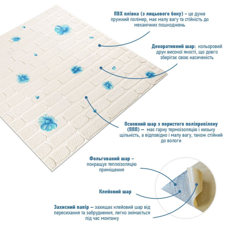 Самоклеюча 3D панель Sticker wall 700х700х4мм блакитні квіти (D) SW-00001977 Прикрасьте стіни свого будинку самоклеючими 3D панелями - простим і доступним рішенням для створення стильного та сучасного інтер'єру. Легкі та міцні панелі з пористого поліпропілену (ППП) з рельєфним малюнком перетворять будь-яку кімнату. Самоклеюча основа забезпечує швидкий та легкий монтаж без використання додаткових матеріалів. Багатошарова структура панелей гарантує їх довговічність та практичність: - ПВХ плівка: стійка до хімічних речовин, еластична та легка. - Декоративний шар: високоякісний друк із збереженням насиченості кольору. - Основний шар із ППП: забезпечує теплоізоляцію, низьку вагу, вологостійкість та хімічну інертність. - Клейовий шар: нетоксичний, із високою адгезією. - Захисний папір: легко знімається перед монтажем. Переваги 3D панелей: 1. Простота монтажу: без клею, цвяхів та інструментів. 2. Стильний дизайн: реалістична імітація цегляної кладки в багатому кольорі. 3. Практичність: вологостійкість, легке чищення, стійкість до вицвітання. 4. Доступність: вигідне співвідношення ціни та якості. Розрахунок необхідної кількості панелей: 1. Виміряйте довжину і ширину поверхні, що обклеюється. 2. Помножте довжину на ширину кожної поверхні в метрах і складіть отримані результати, щоб отримати площу. Наприклад, після вимірів ви отримали: - Довжина стіни 3,7 м. - Ширина стіни 2,7 м. 3,7 * 2,7 = 9,99 кв.м 3. Площа, що вийшла, необхідно розділити на площу однієї панелі (700*700= 0,49 кв.м) і округлити у більшу сторону: 9,99/0,49=20,38 округляємо до 21. У процесі монтажу можуть виникнути відходи, пов'язані з різанням панелей, тому рекомендується додати до розрахунку запасні 1-2 шт. Монтаж панелей: покрокова інструкція Підготовка 1. Очистіть та вирівняйте поверхню: Переконайтеся, що поверхня, на яку ви будете кріпити панелі, чиста, суха та рівна. Видаліть пил, бруд, жир, а за потреби вирівняйте поверхню. Для забезпечення оптимального зчеплення панелі та поверхня повинні бути кімнатної температури. 2. Зніміть захисну плівку: Зніміть захисний папір зі зворотного боку панелі, що самоклеїться, щоб оголити клейову поверхню. Монтаж 3. Почніть з кута: Почніть установку з одного кута та обережно притисніть панель до поверхні. Слідкуйте за тим, щоб панель була встановлена рівно і без бульбашок повітря або зморшок. 4. Припасування панелей: Використовуйте ніж або ножиці, щоб підрізати панелі за розміром, особливо в кутах і по краях поверхні. 5. Притисніть панелі: Щільно притисніть до поверхні, щоб забезпечити надійне зчеплення. Поради - Для досягнення найкращих результатів використовуйте рівень, щоб переконатися, що панелі встановлені рівно. - Якщо ви не впевнені у своїх силах, зверніться за допомогою до професіонала.Характеристики