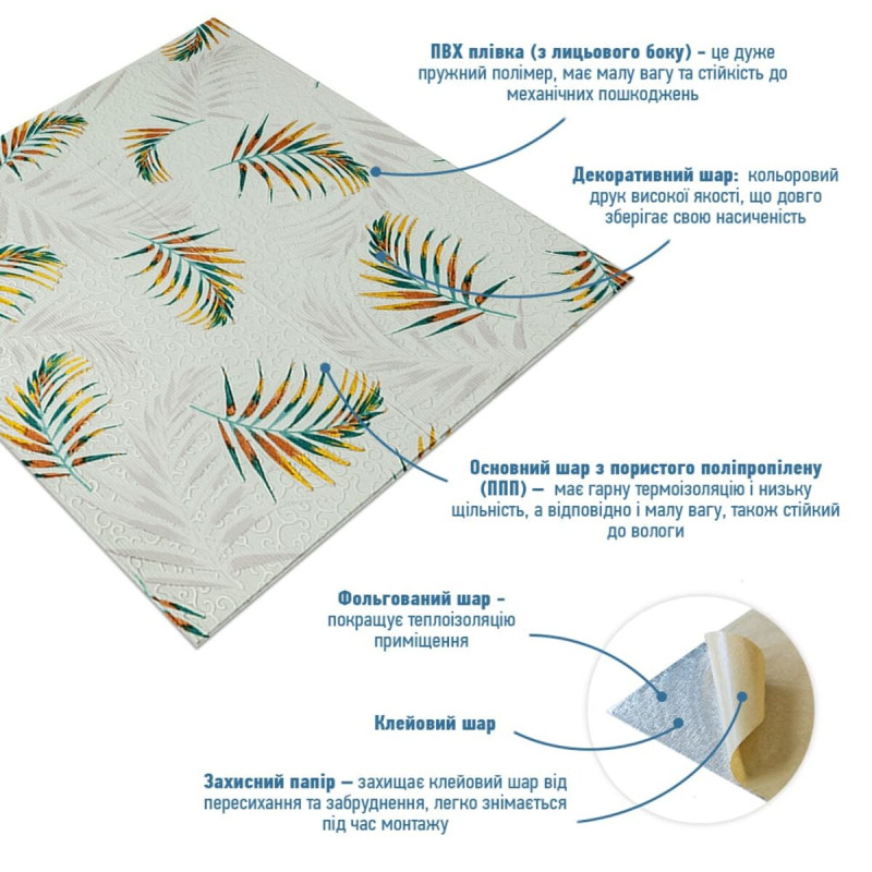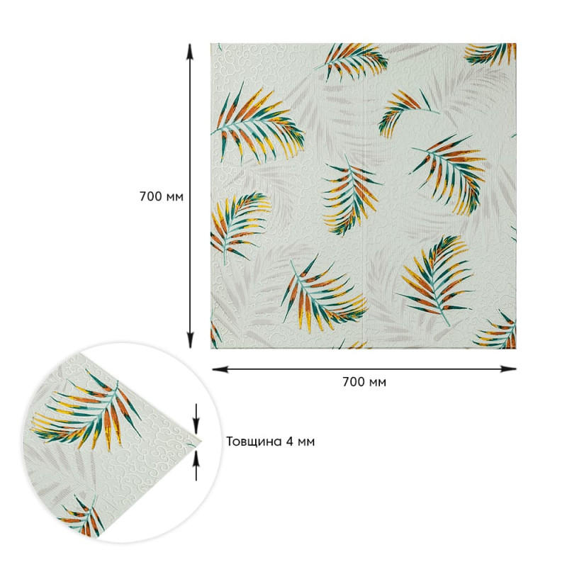 Самоклеюча 3D панель Sticker wall 700х700х4мм папороть на бежевому фоні (D) SW-00001983 Прикрасьте стіни свого будинку самоклеючими 3D панелями - простим і доступним рішенням для створення стильного та сучасного інтер'єру. Легкі та міцні панелі з пористого поліпропілену (ППП) з рельєфним малюнком перетворять будь-яку кімнату. Самоклеюча основа забезпечує швидкий та легкий монтаж без використання додаткових матеріалів. Багатошарова структура панелей гарантує їх довговічність та практичність: - ПВХ плівка: стійка до хімічних речовин, еластична та легка. - Декоративний шар: високоякісний друк із збереженням насиченості кольору. - Основний шар із ППП: забезпечує теплоізоляцію, низьку вагу, вологостійкість та хімічну інертність. - Клейовий шар: нетоксичний, із високою адгезією. - Захисний папір: легко знімається перед монтажем. Переваги 3D панелей: 1. Простота монтажу: без клею, цвяхів та інструментів. 2. Стильний дизайн: реалістична імітація цегляної кладки в багатому кольорі. 3. Практичність: вологостійкість, легке чищення, стійкість до вицвітання. 4. Доступність: вигідне співвідношення ціни та якості. Розрахунок необхідної кількості панелей: 1. Виміряйте довжину і ширину поверхні, що обклеюється. 2. Помножте довжину на ширину кожної поверхні в метрах і складіть отримані результати, щоб отримати площу. Наприклад, після вимірів ви отримали: - Довжина стіни 3,7 м. - Ширина стіни 2,7 м. 3,7 * 2,7 = 9,99 кв.м 3. Площа, що вийшла, необхідно розділити на площу однієї панелі (700*700= 0,49 кв.м) і округлити у більшу сторону: 9,99/0,49=20,38 округляємо до 21. У процесі монтажу можуть виникнути відходи, пов'язані з різанням панелей, тому рекомендується додати до розрахунку запасні 1-2 шт. Монтаж панелей: покрокова інструкція Підготовка 1. Очистіть та вирівняйте поверхню: Переконайтеся, що поверхня, на яку ви будете кріпити панелі, чиста, суха та рівна. Видаліть пил, бруд, жир, а за потреби вирівняйте поверхню. Для забезпечення оптимального зчеплення панелі та поверхня повинні бути кімнатної температури. 2. Зніміть захисну плівку: Зніміть захисний папір зі зворотного боку панелі, що самоклеїться, щоб оголити клейову поверхню. Монтаж 3. Почніть з кута: Почніть установку з одного кута та обережно притисніть панель до поверхні. Слідкуйте за тим, щоб панель була встановлена рівно і без бульбашок повітря або зморшок. 4. Припасування панелей: Використовуйте ніж або ножиці, щоб підрізати панелі за розміром, особливо в кутах і по краях поверхні. 5. Притисніть панелі: Щільно притисніть до поверхні, щоб забезпечити надійне зчеплення. Поради - Для досягнення найкращих результатів використовуйте рівень, щоб переконатися, що панелі встановлені рівно. - Якщо ви не впевнені у своїх силах, зверніться за допомогою до професіонала.Характеристики