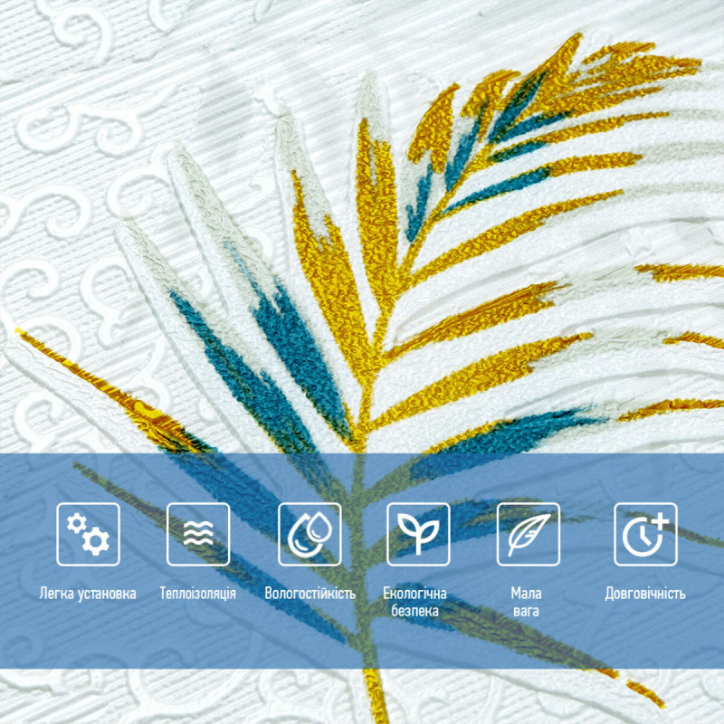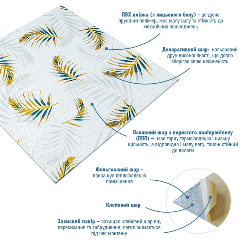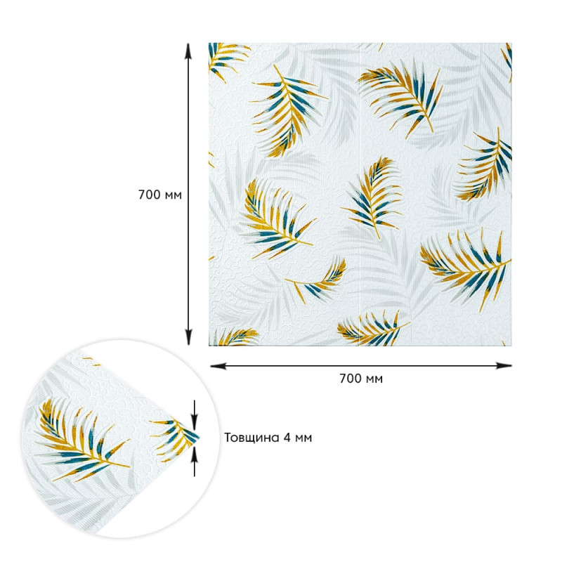 Самоклеюча 3D панель Sticker wall 700х700х4мм папороть на білому тлі (D) SW-00001981 Прикрасьте стіни свого будинку самоклеючими 3D панелями - простим і доступним рішенням для створення стильного та сучасного інтер'єру. Легкі та міцні панелі з пористого поліпропілену (ППП) з рельєфним малюнком перетворять будь-яку кімнату. Самоклеюча основа забезпечує швидкий та легкий монтаж без використання додаткових матеріалів. Багатошарова структура панелей гарантує їх довговічність та практичність: - ПВХ плівка: стійка до хімічних речовин, еластична та легка. - Декоративний шар: високоякісний друк із збереженням насиченості кольору. - Основний шар із ППП: забезпечує теплоізоляцію, низьку вагу, вологостійкість та хімічну інертність. - Клейовий шар: нетоксичний, із високою адгезією. - Захисний папір: легко знімається перед монтажем. Переваги 3D панелей: 1. Простота монтажу: без клею, цвяхів та інструментів. 2. Стильний дизайн: реалістична імітація цегляної кладки в багатому кольорі. 3. Практичність: вологостійкість, легке чищення, стійкість до вицвітання. 4. Доступність: вигідне співвідношення ціни та якості. Розрахунок необхідної кількості панелей: 1. Виміряйте довжину і ширину поверхні, що обклеюється. 2. Помножте довжину на ширину кожної поверхні в метрах і складіть отримані результати, щоб отримати площу. Наприклад, після вимірів ви отримали: - Довжина стіни 3,7 м. - Ширина стіни 2,7 м. 3,7 * 2,7 = 9,99 кв.м 3. Площа, що вийшла, необхідно розділити на площу однієї панелі (700*700= 0,49 кв.м) і округлити у більшу сторону: 9,99/0,49=20,38 округляємо до 21. У процесі монтажу можуть виникнути відходи, пов'язані з різанням панелей, тому рекомендується додати до розрахунку запасні 1-2 шт. Монтаж панелей: покрокова інструкція Підготовка 1. Очистіть та вирівняйте поверхню: Переконайтеся, що поверхня, на яку ви будете кріпити панелі, чиста, суха та рівна. Видаліть пил, бруд, жир, а за потреби вирівняйте поверхню. Для забезпечення оптимального зчеплення панелі та поверхня повинні бути кімнатної температури. 2. Зніміть захисну плівку: Зніміть захисний папір зі зворотного боку панелі, що самоклеїться, щоб оголити клейову поверхню. Монтаж 3. Почніть з кута: Почніть установку з одного кута та обережно притисніть панель до поверхні. Слідкуйте за тим, щоб панель була встановлена рівно і без бульбашок повітря або зморшок. 4. Припасування панелей: Використовуйте ніж або ножиці, щоб підрізати панелі за розміром, особливо в кутах і по краях поверхні. 5. Притисніть панелі: Щільно притисніть до поверхні, щоб забезпечити надійне зчеплення. Поради - Для досягнення найкращих результатів використовуйте рівень, щоб переконатися, що панелі встановлені рівно. - Якщо ви не впевнені у своїх силах, зверніться за допомогою до професіонала.Характеристики