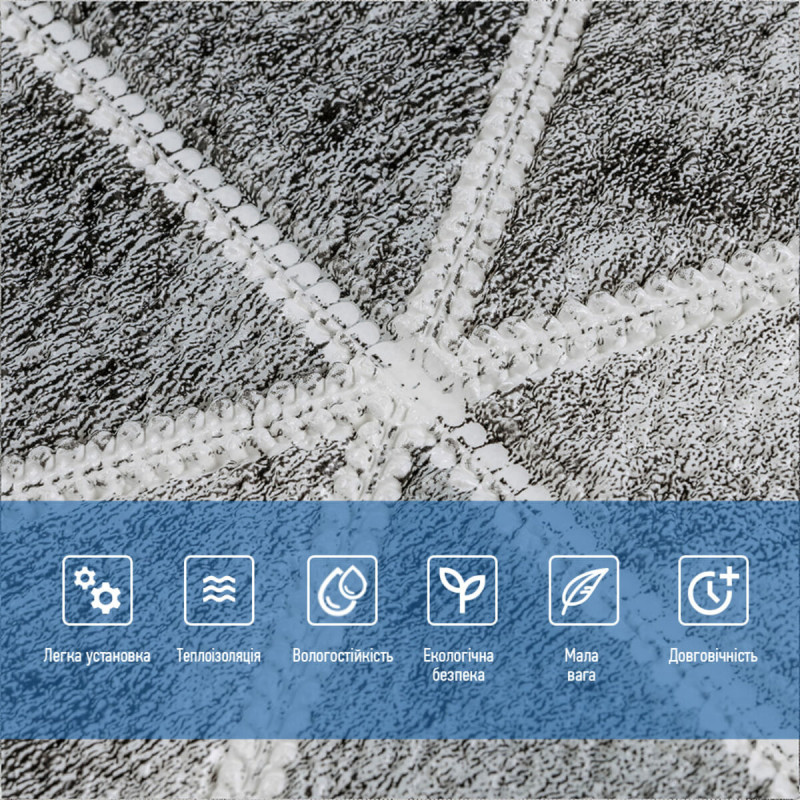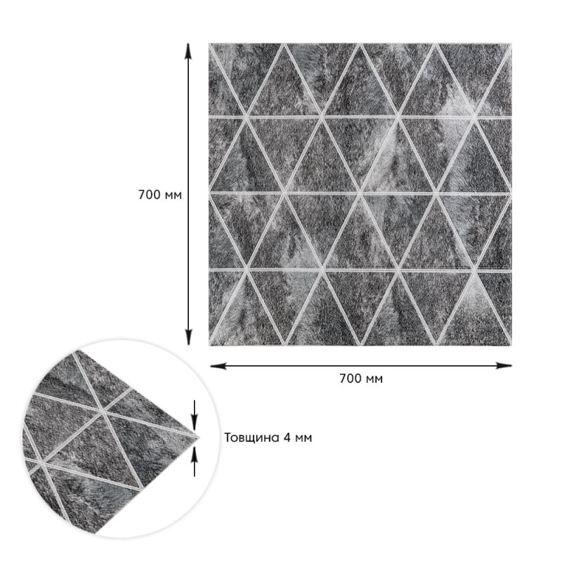 Самоклеюча 3D панель Sticker wall 700х700х4мм ромби сірі вінтаж (D) SW-00002008 Прикрасьте стіни свого будинку самоклеючими 3D панелями - простим і доступним рішенням для створення стильного та сучасного інтер'єру. Легкі та міцні панелі з пористого поліпропілену (ППП) з рельєфним малюнком перетворять будь-яку кімнату. Самоклеюча основа забезпечує швидкий та легкий монтаж без використання додаткових матеріалів. Багатошарова структура панелей гарантує їх довговічність та практичність: - ПВХ плівка: стійка до хімічних речовин, еластична та легка. - Декоративний шар: високоякісний друк із збереженням насиченості кольору. - Основний шар із ППП: забезпечує теплоізоляцію, низьку вагу, вологостійкість та хімічну інертність. - Клейовий шар: нетоксичний, із високою адгезією. - Захисний папір: легко знімається перед монтажем. Переваги 3D панелей: 1. Простота монтажу: без клею, цвяхів та інструментів. 2. Стильний дизайн: реалістична імітація цегляної кладки в багатому кольорі. 3. Практичність: вологостійкість, легке чищення, стійкість до вицвітання. 4. Доступність: вигідне співвідношення ціни та якості. Розрахунок необхідної кількості панелей: 1. Виміряйте довжину і ширину поверхні, що обклеюється. 2. Помножте довжину на ширину кожної поверхні в метрах і складіть отримані результати, щоб отримати площу. Наприклад, після вимірів ви отримали: - Довжина стіни 3,7 м. - Ширина стіни 2,7 м. 3,7 * 2,7 = 9,99 кв.м 3. Площа, що вийшла, необхідно розділити на площу однієї панелі (700*700= 0,49 кв.м) і округлити у більшу сторону: 9,99/0,49=20,38 округляємо до 21. У процесі монтажу можуть виникнути відходи, пов'язані з різанням панелей, тому рекомендується додати до розрахунку запасні 1-2 шт. Монтаж панелей: покрокова інструкція Підготовка 1. Очистіть та вирівняйте поверхню: Переконайтеся, що поверхня, на яку ви будете кріпити панелі, чиста, суха та рівна. Видаліть пил, бруд, жир, а за потреби вирівняйте поверхню. Для забезпечення оптимального зчеплення панелі та поверхня повинні бути кімнатної температури. 2. Зніміть захисну плівку: Зніміть захисний папір зі зворотного боку панелі, що самоклеїться, щоб оголити клейову поверхню. Монтаж 3. Почніть з кута: Почніть установку з одного кута та обережно притисніть панель до поверхні. Слідкуйте за тим, щоб панель була встановлена рівно і без бульбашок повітря або зморшок. 4. Припасування панелей: Використовуйте ніж або ножиці, щоб підрізати панелі за розміром, особливо в кутах і по краях поверхні. 5. Притисніть панелі: Щільно притисніть до поверхні, щоб забезпечити надійне зчеплення. Поради - Для досягнення найкращих результатів використовуйте рівень, щоб переконатися, що панелі встановлені рівно. - Якщо ви не впевнені у своїх силах, зверніться за допомогою до професіонала.Характеристики