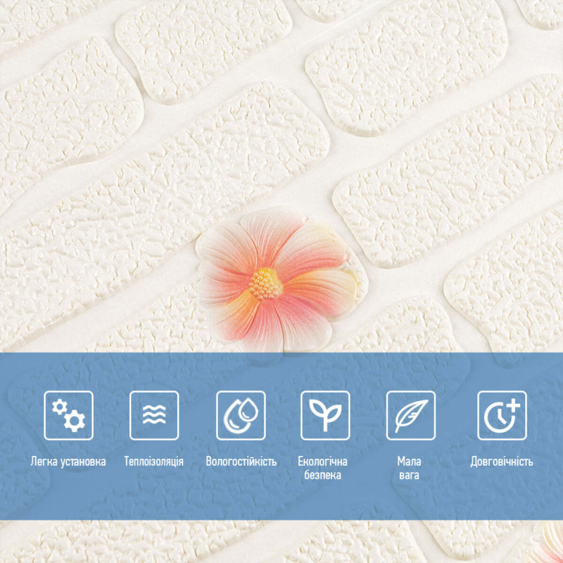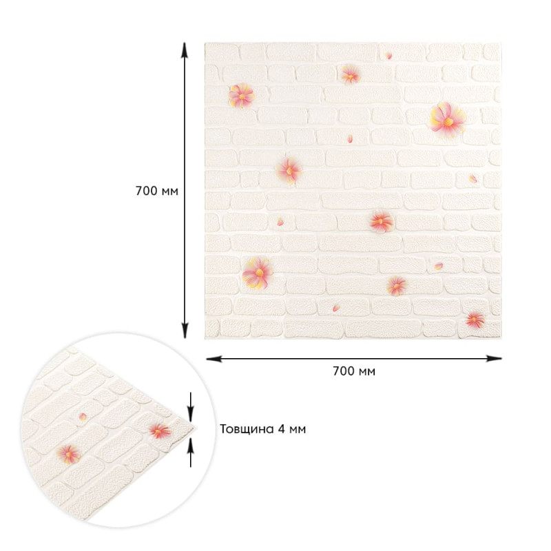 Самоклеюча 3D панель Sticker wall 700х700х4мм рожеві квіти (D) SW-00001978 Прикрасьте стіни свого будинку самоклеючими 3D панелями - простим і доступним рішенням для створення стильного та сучасного інтер'єру. Легкі та міцні панелі з пористого поліпропілену (ППП) з рельєфним малюнком перетворять будь-яку кімнату. Самоклеюча основа забезпечує швидкий та легкий монтаж без використання додаткових матеріалів. Багатошарова структура панелей гарантує їх довговічність та практичність: - ПВХ плівка: стійка до хімічних речовин, еластична та легка. - Декоративний шар: високоякісний друк із збереженням насиченості кольору. - Основний шар із ППП: забезпечує теплоізоляцію, низьку вагу, вологостійкість та хімічну інертність. - Клейовий шар: нетоксичний, із високою адгезією. - Захисний папір: легко знімається перед монтажем. Переваги 3D панелей: 1. Простота монтажу: без клею, цвяхів та інструментів. 2. Стильний дизайн: реалістична імітація цегляної кладки в багатому кольорі. 3. Практичність: вологостійкість, легке чищення, стійкість до вицвітання. 4. Доступність: вигідне співвідношення ціни та якості. Розрахунок необхідної кількості панелей: 1. Виміряйте довжину і ширину поверхні, що обклеюється. 2. Помножте довжину на ширину кожної поверхні в метрах і складіть отримані результати, щоб отримати площу. Наприклад, після вимірів ви отримали: - Довжина стіни 3,7 м. - Ширина стіни 2,7 м. 3,7 * 2,7 = 9,99 кв.м 3. Площа, що вийшла, необхідно розділити на площу однієї панелі (700*700= 0,49 кв.м) і округлити у більшу сторону: 9,99/0,49=20,38 округляємо до 21. У процесі монтажу можуть виникнути відходи, пов'язані з різанням панелей, тому рекомендується додати до розрахунку запасні 1-2 шт. Монтаж панелей: покрокова інструкція Підготовка 1. Очистіть та вирівняйте поверхню: Переконайтеся, що поверхня, на яку ви будете кріпити панелі, чиста, суха та рівна. Видаліть пил, бруд, жир, а за потреби вирівняйте поверхню. Для забезпечення оптимального зчеплення панелі та поверхня повинні бути кімнатної температури. 2. Зніміть захисну плівку: Зніміть захисний папір зі зворотного боку панелі, що самоклеїться, щоб оголити клейову поверхню. Монтаж 3. Почніть з кута: Почніть установку з одного кута та обережно притисніть панель до поверхні. Слідкуйте за тим, щоб панель була встановлена рівно і без бульбашок повітря або зморшок. 4. Припасування панелей: Використовуйте ніж або ножиці, щоб підрізати панелі за розміром, особливо в кутах і по краях поверхні. 5. Притисніть панелі: Щільно притисніть до поверхні, щоб забезпечити надійне зчеплення. Поради - Для досягнення найкращих результатів використовуйте рівень, щоб переконатися, що панелі встановлені рівно. - Якщо ви не впевнені у своїх силах, зверніться за допомогою до професіонала.Характеристики