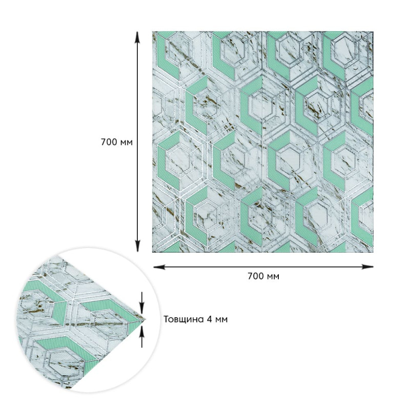 Самоклеюча 3D панель Sticker wall 700х700х4мм сіро-зелені стільники мармур (D) SW-00002006 Прикрасьте стіни свого будинку самоклеючими 3D панелями - простим і доступним рішенням для створення стильного та сучасного інтер'єру. Легкі та міцні панелі з пористого поліпропілену (ППП) з рельєфним малюнком перетворять будь-яку кімнату. Самоклеюча основа забезпечує швидкий та легкий монтаж без використання додаткових матеріалів. Багатошарова структура панелей гарантує їх довговічність та практичність: - ПВХ плівка: стійка до хімічних речовин, еластична та легка. - Декоративний шар: високоякісний друк із збереженням насиченості кольору. - Основний шар із ППП: забезпечує теплоізоляцію, низьку вагу, вологостійкість та хімічну інертність. - Клейовий шар: нетоксичний, із високою адгезією. - Захисний папір: легко знімається перед монтажем. Переваги 3D панелей: 1. Простота монтажу: без клею, цвяхів та інструментів. 2. Стильний дизайн: реалістична імітація цегляної кладки в багатому кольорі. 3. Практичність: вологостійкість, легке чищення, стійкість до вицвітання. 4. Доступність: вигідне співвідношення ціни та якості. Розрахунок необхідної кількості панелей: 1. Виміряйте довжину і ширину поверхні, що обклеюється. 2. Помножте довжину на ширину кожної поверхні в метрах і складіть отримані результати, щоб отримати площу. Наприклад, після вимірів ви отримали: - Довжина стіни 3,7 м. - Ширина стіни 2,7 м. 3,7 * 2,7 = 9,99 кв.м 3. Площа, що вийшла, необхідно розділити на площу однієї панелі (700*700= 0,49 кв.м) і округлити у більшу сторону: 9,99/0,49=20,38 округляємо до 21. У процесі монтажу можуть виникнути відходи, пов'язані з різанням панелей, тому рекомендується додати до розрахунку запасні 1-2 шт. Монтаж панелей: покрокова інструкція Підготовка 1. Очистіть та вирівняйте поверхню: Переконайтеся, що поверхня, на яку ви будете кріпити панелі, чиста, суха та рівна. Видаліть пил, бруд, жир, а за потреби вирівняйте поверхню. Для забезпечення оптимального зчеплення панелі та поверхня повинні бути кімнатної температури. 2. Зніміть захисну плівку: Зніміть захисний папір зі зворотного боку панелі, що самоклеїться, щоб оголити клейову поверхню. Монтаж 3. Почніть з кута: Почніть установку з одного кута та обережно притисніть панель до поверхні. Слідкуйте за тим, щоб панель була встановлена рівно і без бульбашок повітря або зморшок. 4. Припасування панелей: Використовуйте ніж або ножиці, щоб підрізати панелі за розміром, особливо в кутах і по краях поверхні. 5. Притисніть панелі: Щільно притисніть до поверхні, щоб забезпечити надійне зчеплення. Поради - Для досягнення найкращих результатів використовуйте рівень, щоб переконатися, що панелі встановлені рівно. - Якщо ви не впевнені у своїх силах, зверніться за допомогою до професіонала.Характеристики