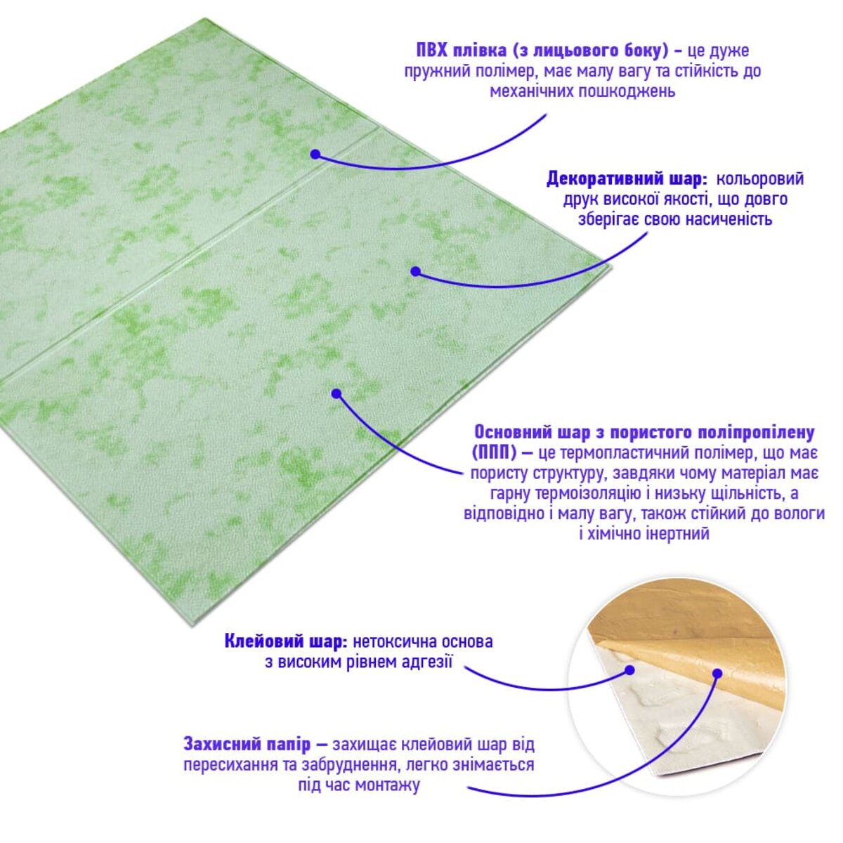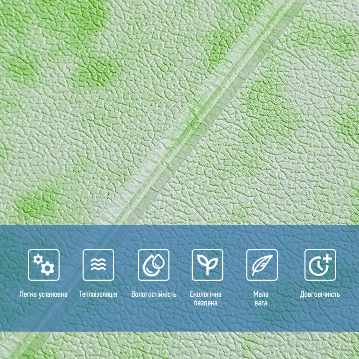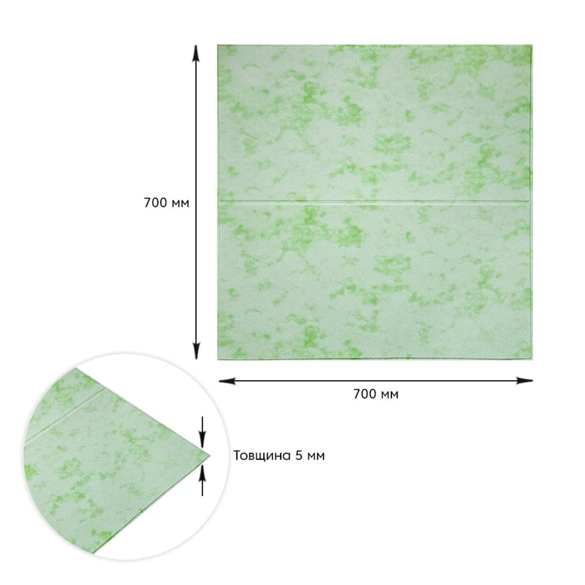 Самоклеюча 3D панель Sticker wall 700х700х5мм Мармур зелений (D) SW-00002441 Прикрасьте стіни свого будинку самоклеючими 3D панелями - простим і доступним рішенням для створення стильного та сучасного інтер'єру. Легкі та міцні панелі з пористого поліпропілену (ППП) з рельєфним малюнком перетворять будь-яку кімнату. Самоклеюча основа забезпечує швидкий та легкий монтаж без використання додаткових матеріалів. Багатошарова структура панелей гарантує їх довговічність та практичність: - ПВХ плівка: стійка до хімічних речовин, еластична та легка. - Декоративний шар: високоякісний друк із збереженням насиченості кольору. - Основний шар із ППП: забезпечує теплоізоляцію, низьку вагу, вологостійкість та хімічну інертність. - Клейовий шар: нетоксичний, із високою адгезією. - Захисний папір: легко знімається перед монтажем. Переваги 3D панелей: 1. Простота монтажу: без клею, цвяхів та інструментів. 2. Стильний дизайн: реалістична імітація цегляної кладки в багатому кольорі. 3. Практичність: вологостійкість, легке чищення, стійкість до вицвітання. 4. Доступність: вигідне співвідношення ціни та якості. Розрахунок необхідної кількості панелей: 1. Виміряйте довжину і ширину поверхні, що обклеюється. 2. Помножте довжину на ширину кожної поверхні в метрах і складіть отримані результати, щоб отримати площу. Наприклад, після вимірів ви отримали: - Довжина стіни 3,7 м. - Ширина стіни 2,7 м. 3,7 * 2,7 = 9,99 кв.м 3. Площа, що вийшла, необхідно розділити на площу однієї панелі (700*700= 0,49 кв.м) і округлити у більшу сторону: 9,99/0,49=20,38 округляємо до 21. У процесі монтажу можуть виникнути відходи, пов'язані з різанням панелей, тому рекомендується додати до розрахунку запасні 1-2 шт. Монтаж панелей: покрокова інструкція Підготовка 1. Очистіть та вирівняйте поверхню: Переконайтеся, що поверхня, на яку ви будете кріпити панелі, чиста, суха та рівна. Видаліть пил, бруд, жир, а за потреби вирівняйте поверхню. Для забезпечення оптимального зчеплення панелі та поверхня повинні бути кімнатної температури. 2. Зніміть захисну плівку: Зніміть захисний папір зі зворотного боку панелі, що самоклеїться, щоб оголити клейову поверхню. Монтаж 3. Почніть з кута: Почніть установку з одного кута та обережно притисніть панель до поверхні. Слідкуйте за тим, щоб панель була встановлена рівно і без бульбашок повітря або зморшок. 4. Припасування панелей: Використовуйте ніж або ножиці, щоб підрізати панелі за розміром, особливо в кутах і по краях поверхні. 5. Притисніть панелі: Щільно притисніть до поверхні, щоб забезпечити надійне зчеплення. Поради - Для досягнення найкращих результатів використовуйте рівень, щоб переконатися, що панелі встановлені рівно. - Якщо ви не впевнені у своїх силах, зверніться за допомогою до професіонала.Характеристики